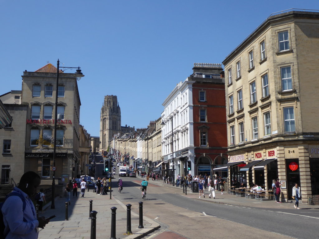 . Poi ci dirigiamo in centro città, dove vediamo il Saint Nicholas Market, la Cattedrale (che apre liberamente le sue porte a noi vacanzieri offrendoci opuscoli informativi utilissimi, alla cittadinanza invitata per feste domenicali nel prato, che non viene tagliato per regalare fiori e nettare alle api ) , la Public Library e la vivace zona del porto. Anche nelle strade si respira la vivace vita musicale ed artistica della città : l’Old Vic Theatre è il più vecchio teatro del paese che ha formato Jeremy Irons ; qui è nato Bansky e sono alcune delle sue prime opere, che hanno fatto diventare la città una delle capitali mondiali della street art. La città è capitale dell’animazione cinematografica (qui sono gli studi di Wallace e Groomit) . Pranziamo (più per sederci a riposare) in un locale modesto che offre gustosi noodles, gestito da due serissime signorine orientali che non spiccicano parola : scegliamo le consumazioni su un tablet, scegliendo fortunatamente il grado di piccantezza leggero (1 su 5), ma il risultato è decisamente bruciante.