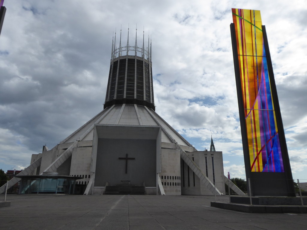 Ci dirigiamo poi verso la ancor più recente Roman Catholic Metropolitan Cathedral (Metropolitan Cathedral of Christ the King), una enorme meringa di cemento visibile da ogni dove, che viene costantemente citata come la più brutta costruzione di Liverpool  : il progetto iniziale, del 1933 – che prevedeva la costruzione della più grande cattedrale del mondo dopo San Pietro a Roma – fu abbandonato per la mancanza di fondi . A testimoniare la grandiosità del piano rimane solamente la Cripta di Lutyens, fatta di 6 milioni di mattoni, che non visitiamo perché già chiusa al nostro arrivo.  I lavori ripresero nel 1962, con un progetto che definire futurista è poco, dopo una eroica raccolta fondi, a cui contribuirono molti cittadini, con varie strategie, che valsero loro il reclutamento nel Golden Book of Remembrance.  E’ sicuramente la chiesa della luce, che entra da geometriche vetrate dai colori brillanti, sagomati in forme geometriche che definiscono gli spazi e culminano nella volta centrale.   Nell’immediato, sembra di entrare più in una discoteca che in una chiesa, tanto i colori delle vetrate sono intensi  :  ma è difficile restare indifferenti alla strana luce diffusa dalle vetrate, /*che crea una sensazione di intimità che si concentra nella navata circolare (alta 90 metri) che svetta proprio al centro della chiesa .