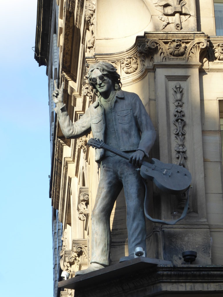 Arriviamo poi al Cavern Quarter, nella zona centralissima, che celebra la presenza della vera e propria caverna dove i Beatles hanno iniziato a suonare ( qui tennero i loro primi 292 concerti e raggiunsero la celebrità) ; il Cavern Club è uguale a quello originale, che fu demolito negli anni 70, e ricostruito identico nel 1984 – quando riprese la sua attività – ma leggermente spostato rispetto all’originale.  Una fotografia ricorda dove si trovava il sito originale, e di fronte c’è ancora l’edificio in cui manca un mattone ; per la ricostruzione –che solo gli inglesi sanno fare così meticolosamente- sono stati utilizzati 15000 mattoni risalenti proprio all’epoca dei Beatles.    Ma non solo i Beatles hanno suonato qui:   nel periodo di attività ( 1957-1973 ) in questo club hanno suonato i Rolling Stones, gli Who, i Queen, Chuck Berry, Elton Jhon, gli Oasis, Rod Stuart … e tutti gli altri artisti celebrati nel Wall of Fame, fatto erigere il 16 gennaio 1997 con 1801 mattoni che riportano il loro nome,  dal Cavern City Tours (proprietario degli omonimi  Club e Pub) per celebrare il 40° anniversario dell’apertura.   Negli anni 60 Liverpool è stata per il rock quello che New Orleans fu per il jazz.    La zona è ovviamente molto turistica e densa di attrazioni commerciali sul filone Beatlesmania : però si deve rilevare la grande energia positiva che si respira nelle strade del centro, dove musica suonata dal vivo ci accompagna costantemente, dove dai locali entrano ed escono artisti, ragazzi con  strumenti.