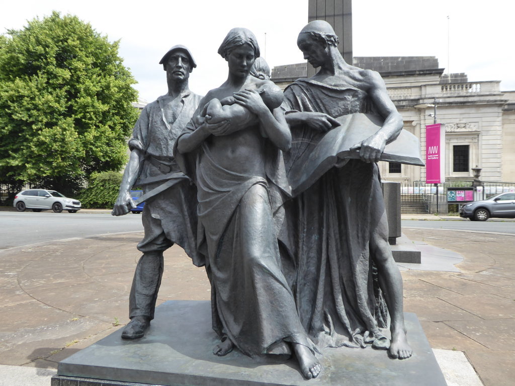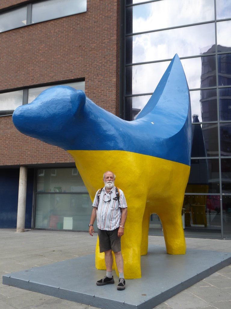Ci fermiamo a fare alcune foto alla futuristica biblioteca di Liverpool  e a The Drumlin’s SuperLambanana, ben posizionato nella zona universitaria : mascotte portafortuna della città, è adesso vestito con i colori dell’Ucraina.  In realtà non ne sappiamo nulla: è una scultura che rappresenta un  incrocio tra una pecora e una banana, alta 5,2  metri e del peso di 7,9 tonnellate, progettata dall’artista giapponese (operante a New York) Taro Chiezo  .  Realizzata nel 1998 per la ArtTransPennine Exibition, sintetizza la storia di Liverpool , in quanto le banane e le pecore erano merce comune nel porto della città, e suggerisce inoltre il potenziale rischio dell’ingegneria genetica, con un aspetto simpatico e immediatamente riconoscibile.  E’ stata pensata per avere non una collocazione fissa ma per essere spostata ; il colore originario è il giallo, ma è stata più volte ridipinta per particolari scopi : rosa a sostegno delle associazioni contro il tumore al seno , viola durante la campagna contro il fumo. E’ costata 35.000 sterline ; ma alla sua realizzazione è seguito un conflitto con l’artista, inerente il pagamento di diritti d’autore, risolto con la replica della statua da parte di un altro artista, replica che potrà rimanere nella città per 80 anni, mentre l’originale sarà restituito all’artista Taro Chiezo. Nel 2008, quando Liverpool è stata capitale europea della cultura, ne sono state realizzate 125 repliche (ognuna delle quali con un nominativo particolare) più piccole,  da vari artisti , sponsorizzate dalle organizzazioni o da privati della città ;  al termine delle otto settimane di esposizione sono state messe all’asta ed hanno generato un ricavo di 550.000 sterline. La più lontana è nel nord Galles, sulla cima di Moel Famau : è la più alta SuperLambanana (The Highest SuperLambanana) .