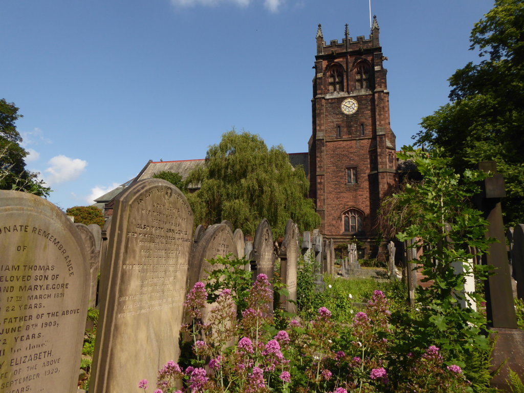 • Chiesa di St. Peter al Woolton Village : dove John Lennon conosce Paul McCartney, il 6 luglio 1957, ad una festa parrocchiale, mentre sta suonando con il suo primo gruppo The Quarry Men. Hanno 16 e 14 anni  . Non riesco a capire dove potesse stare il piccolo palcoscenico : l’unica possibilità e tra i due alberi di fronte all’ingresso, perché tutto il resto del giardino è occupato dal cimitero, dove riesco ad individuare la tomba di Eleanor Rigby, su una lapide che porta anche il nome di altri componenti della famiglia.   Questo nome nel 1966 diventerà il titolo di una delle canzoni più famose dei Beatles, contenuta nell’album Revolver.  In realtà questa Eleanor Rigby non c’entra nulla con la protagonista della canzone : McCartney sceglie questo nome riferendosi ad un’attrice (Eleanor Bron) e al  nome di un negozio di Bristol (Rigby & Evens Ltd, Wine & Spirit Shippers).  In seguito ha anche ammesso che potrebbe aver ricordato inconsciamente il nome sulla tomba, in quanto la chiesa era una delle mete dei suoi incontri con Lennon. Comunque ogni accadimento o riferimento della canzone è completamente inventato . La vera Eleanor, per quanto è dato sapere dai dati anagrafici, era nata nel 1895 da Mary Rigby e Arthur Whitfield ; ha lavorato nell’ospedale di Liverpool e nel 1930 ha sposato Thomas Wood ; ha vissuto a Woolton l’intera vita, ed è morta a 44 anni nel 1939. Nel 2017 gli eredi hanno anche intentato una causa riferendosi al testo della canzone ; ma McCartney ha di nuovo spiegato che il nome e la storia era solo il frutto della sua fantasia e non aveva alcun riferimento ad una persona o a fatti reali. La chiesa dovrebbe avere una targa commemorativa nell’atrio, che però è chiuso. Per cui anche qui completo anonimato.