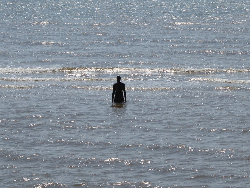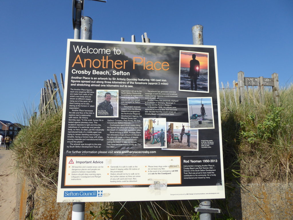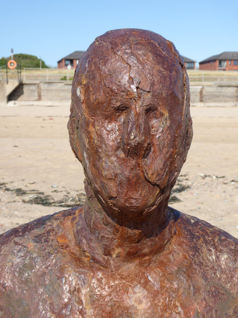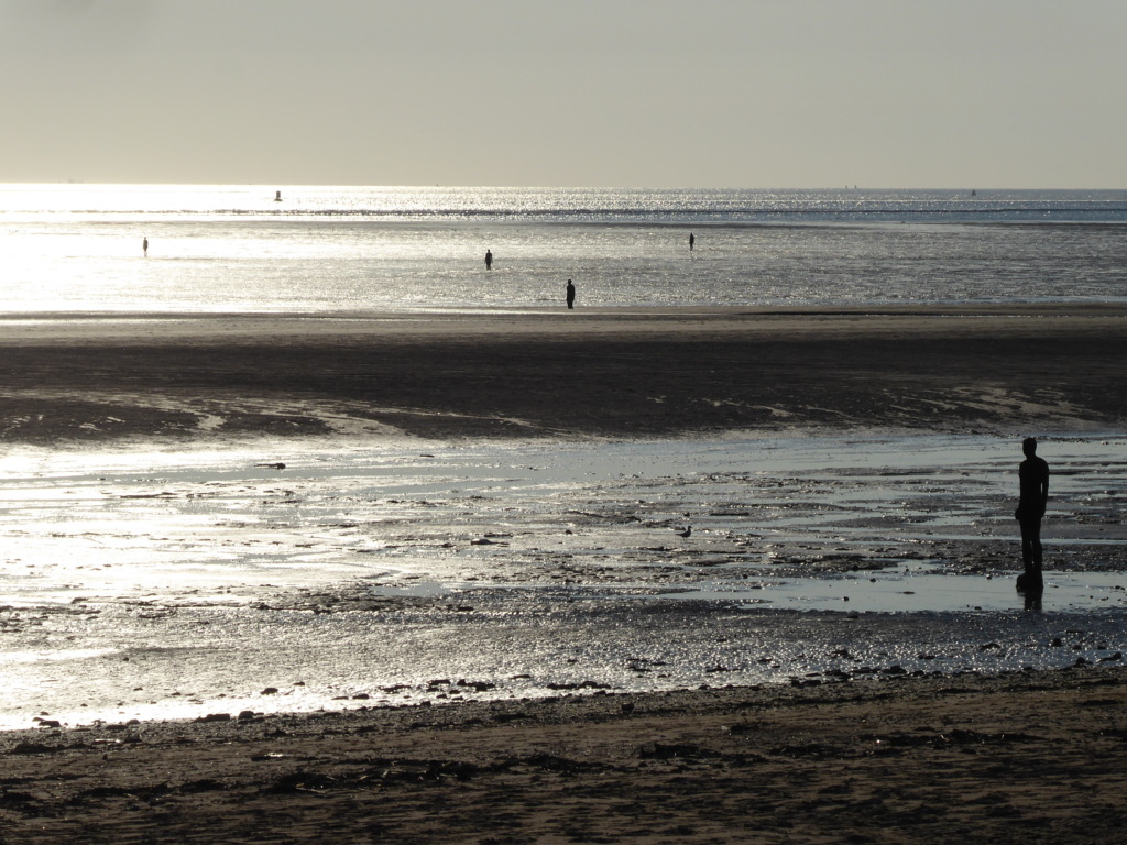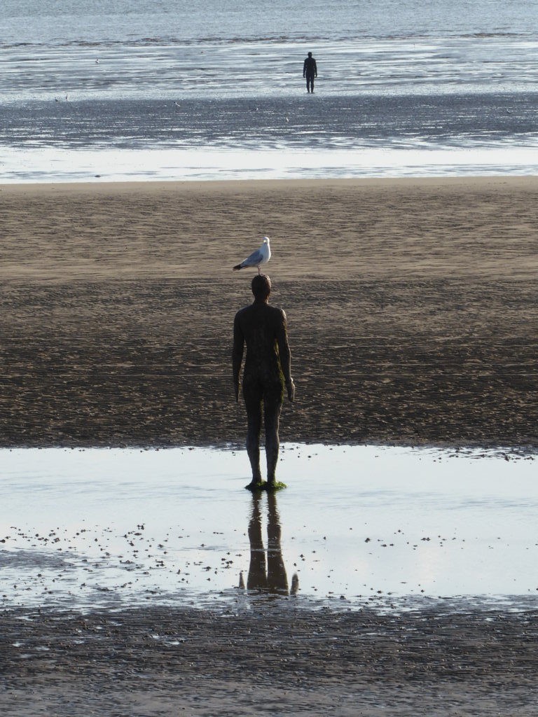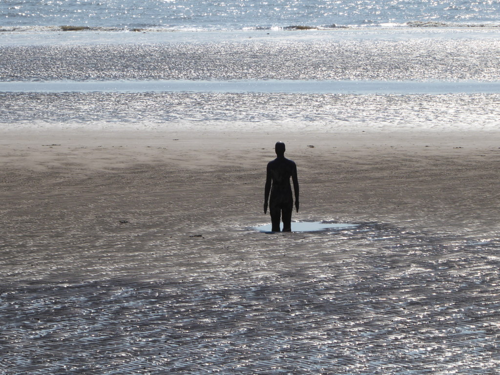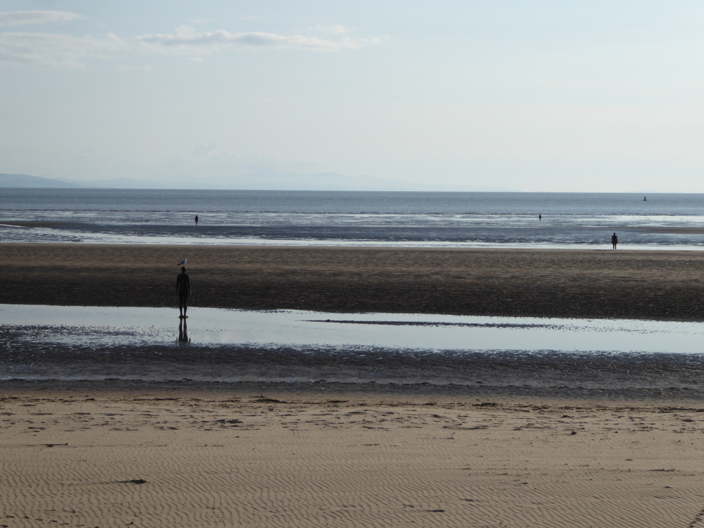 Ci dirigiamo a tutto gas a Crosby affacciati alla lunghissima spiaggia, solo per godere della bella giornata di sole ; pranziamo con gamberetti e insalata di pomodori e avocado. Ma la vera ragione di questa tappa è la particolare opera di Antony Gormley , chiamata Another Place (Un altro posto).  E’ formata da oltre 100 statue di ferro sparse sulla spiaggia di Crosby nell’arco di 2 miglia :  rappresentano 17 diversi tipi di repliche del corpo dell’artista (come la maggior parte delle sue opere) , a grandezza naturale, figure in piedi che stazionano diritte uscendo dalla sabbia a vari livelli, tutte rivolte verso il mare e l’orizzonte, in un’attesa silenziosa. Ogni scultura sta diritta nello stesso modo, ma esprime differente rilassamento o tensione nella posizione ; l’artista ha rappresentato in questo modo poetico diverse idee : il sentimento universale di tristezza e perdita ma anche di speranza in un diverso futuro e in un altro luogo associato alla emigrazione ; non si tratta di figure eroiche o ideali, ma della rappresentazione realistica del corpo di un  uomo di mezza età,  e del suo rapporto con la natura ; la vita umana si confronta con la dimensione cosmica delle maree ; le sculture espongono alla luce e al tempo la propria nudità di un uomo comune che cerca di rimanere in piedi e di respirare guardando un orizzonte occupato da navi che trasportano materiali, merci da una parte all’altra del pianeta.  Ogni statua è alta 189 cm e pesa 650 Kg. ed è ancorata alla sabbia con un pilone profondo un metro.   Ed è soprannominata “The iron man” dai locali ; con l’alzarsi e l’abbassarsi della marea lentamente emergono o vengono sommerse dal mare e danno una immagine potente e suggestiva : uomini che affrontano silenziosi il mare, l’orizzonte, l’acqua, il vento , le tempeste, gli elementi.  E’ un’opera oramai residente in questa spiaggia : il previsto trasferimento a New York è infatti stato annullato, per la potenza evocativa della attuale collocazione.
