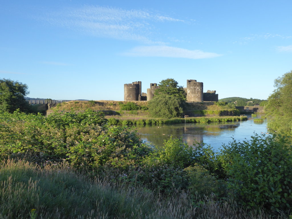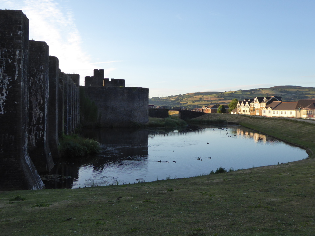 Breve passeggiata, acquisti di anticaglie + gelatino , saluti alla sposa nel castello, e riprendiamo la nostra stretta via, affaticati anche dal caldo afoso di oggi .    Verso sera arriviamo a Caerphilly (Caerffili ) dove fatichiamo un po’ a parcheggiare (divieti notturni e un po’ di stanchezza). Dopo aver sfamato la Nina che come al solito alle 7 di sera PRETENDE la sua cena a gran voce, facciamo una bella passeggiata attorno al bellissimo castello del XIII secolo : costruito inizialmente da un re invasore normanno, è stato poi distrutto da un principe gallese e ricostruito nuovamente “più grande e più bello di prima” da un potente barone inglese Lord Marcher di Glamoran, in risposta all’ultimo principe gallese Llywelyn ap Gruffydd.  . E’ infatti uno dei più grandi di tutta la Gran Bretagna (il secondo dopo Windsor) , il più grande di tutto il Galles.  La possente struttura è completamente circondata da un triplice fossato pieno d’acqua, dove oggi nuotano felici oche canadesi, fuliche e una bellissima mamma cigna con 6 cignetti : è costituita da una serie di fortificazioni concentriche utilizzate a scopo difensivo.  Infatti per raggiungere il cortile interno era necessario superare almeno tre fossati e tre ponti levatoi, sei inferriate e cinque porte doppie.   Lo scopo di questa invincibile costruzione e lo sfoggio di tanta potenza era quello di scoraggiare qualsiasi tentativo di rivolta o sommossa gallese. Il suo famoso torrione centrale è stato semidistrutto da Cromwell, ed ha assunto una inclinazione evidente : viene coraggiosamente sostenuto da un omone di cemento invincibile.
