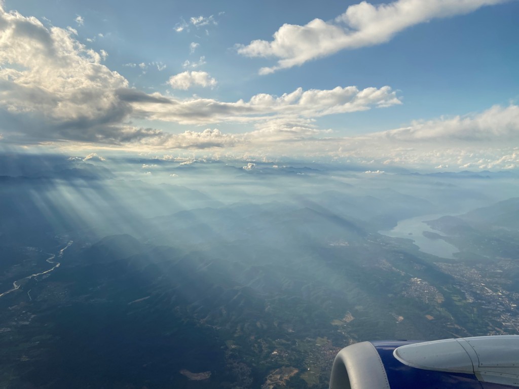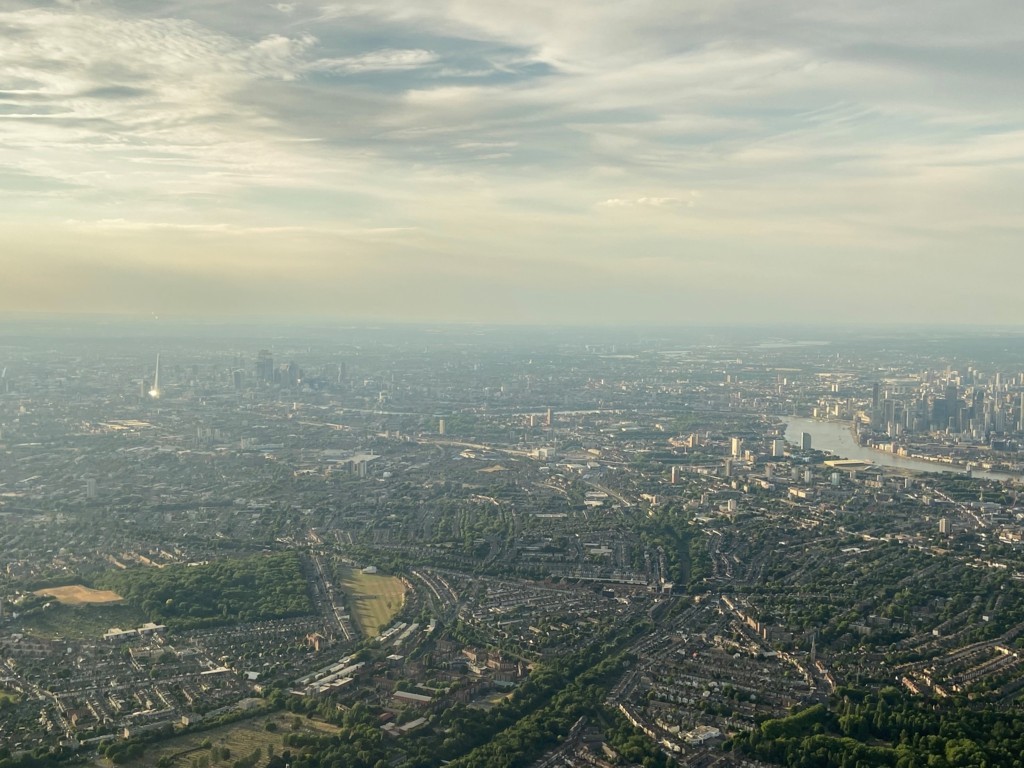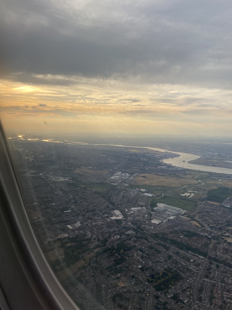 Il nostro aereo – dopo essere passato sopra le Alpi e le pianure francesi – sembra accelerare e intraprende un giro nuovo, che ci regala un fine volo panoramico e mozzafiato : non arriva a Londra da sud come solitamente accade … ma attraversando la Manica allarga verso est con una ampia virata attorno alla regione del Kent, sovrasta affiancandole le bianche scogliere e si porta fino alla foce del Tamigi – illuminato come un nastro dorato dalla luce del tramonto – e lo risale fino al centro della città, che sorvoliamo planando fino al London City Airport.