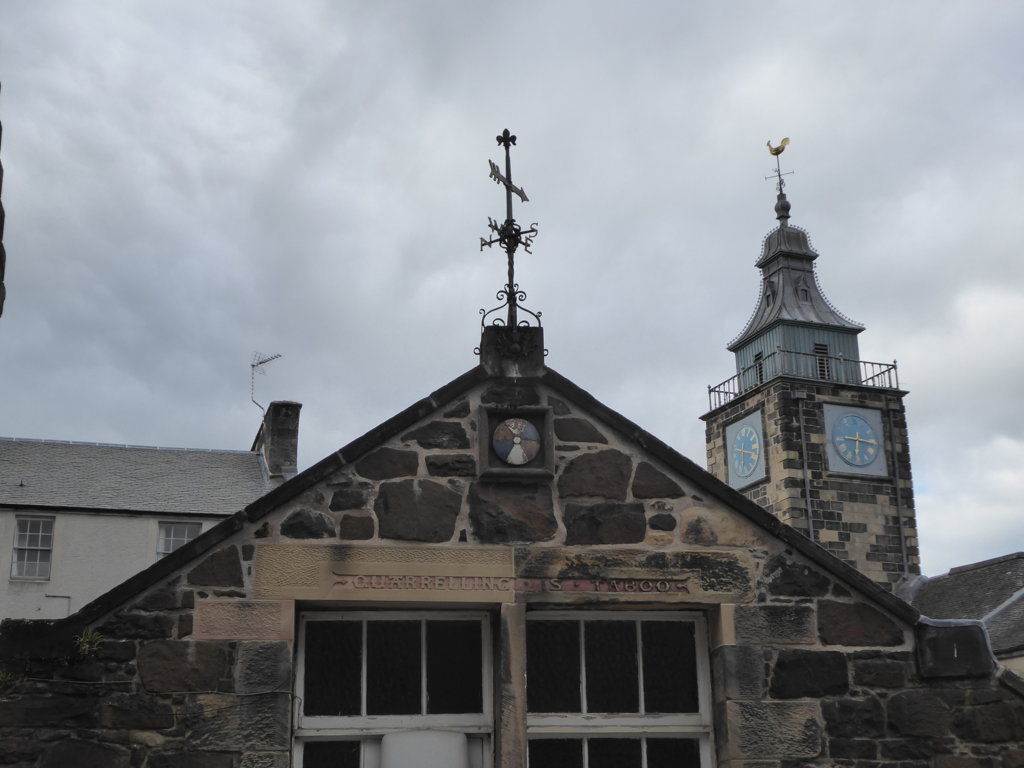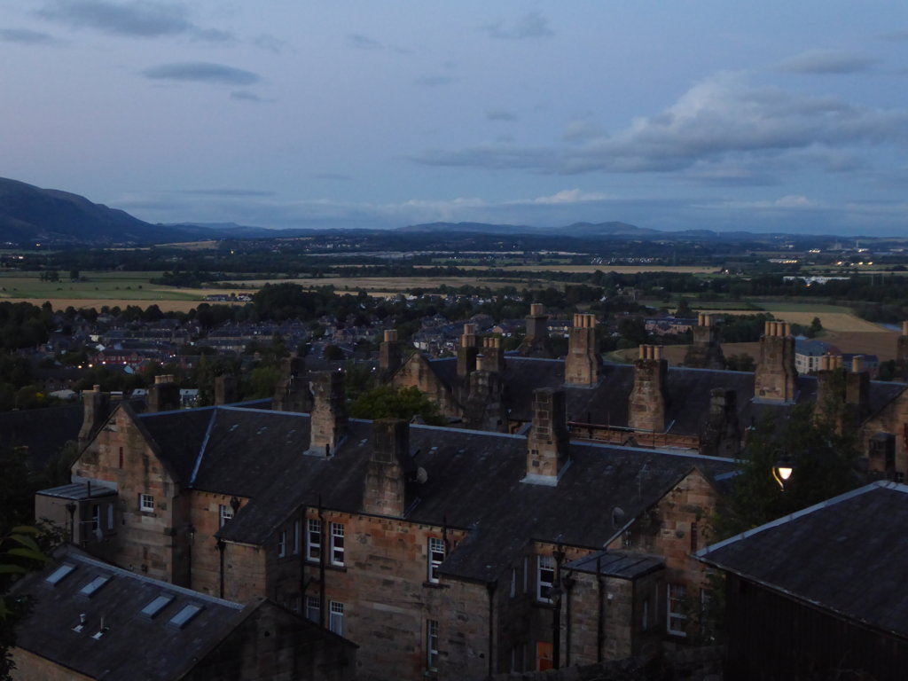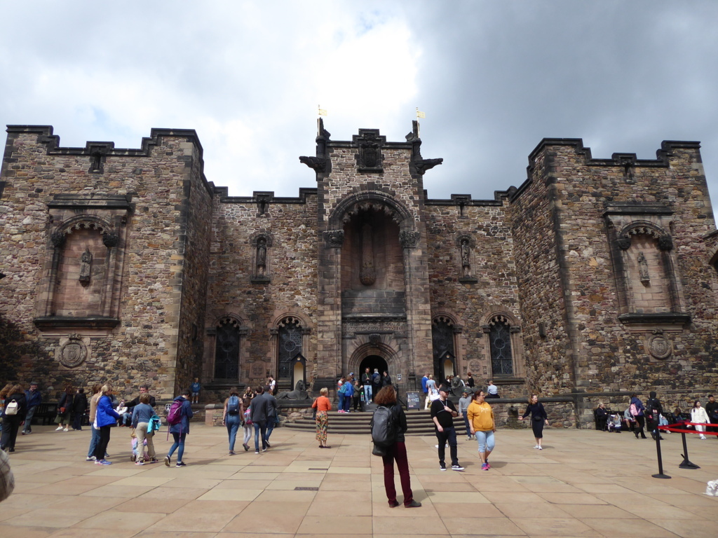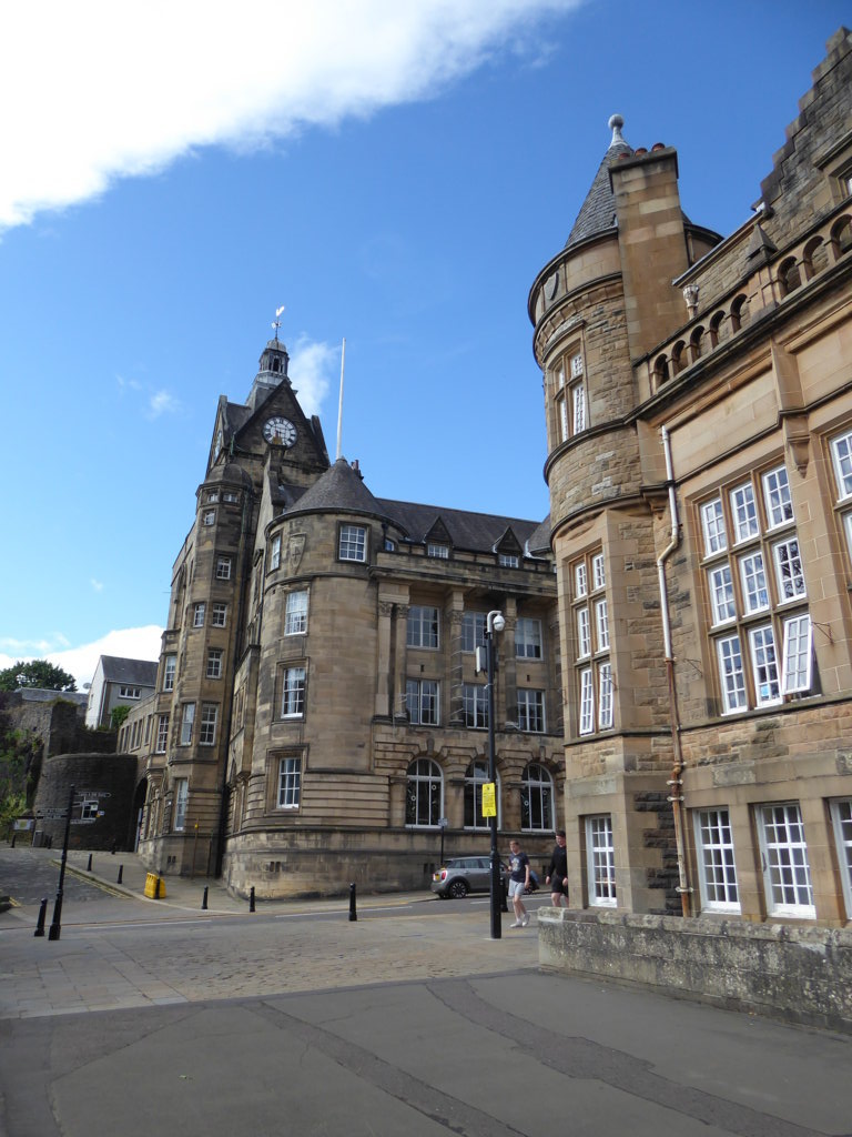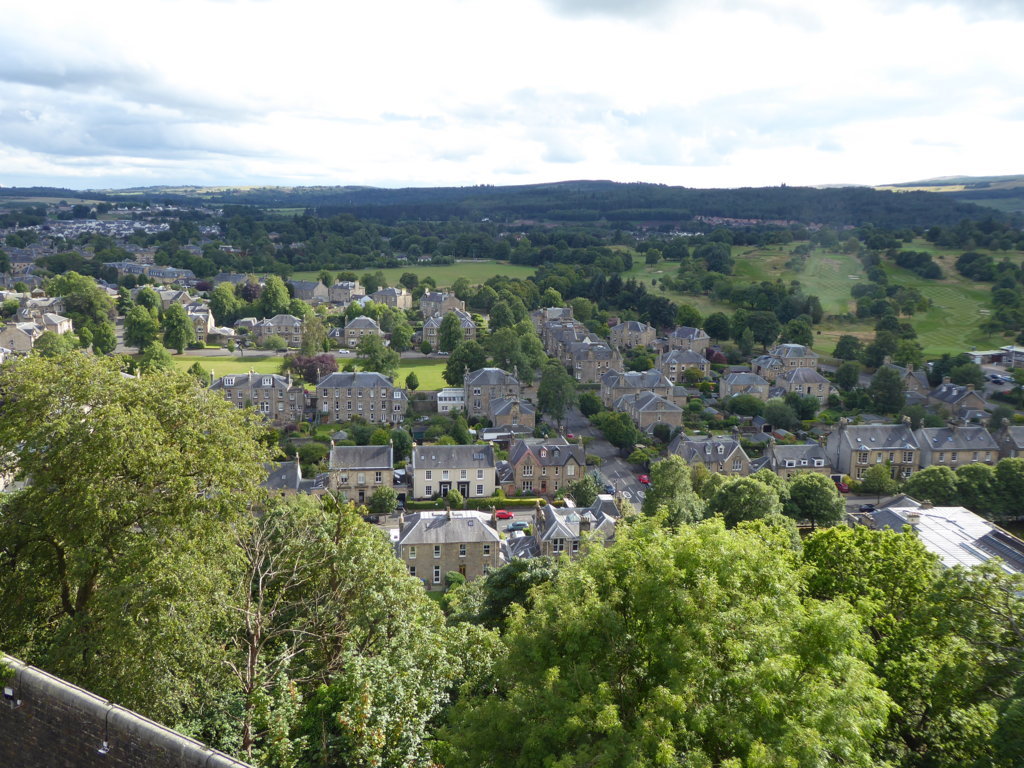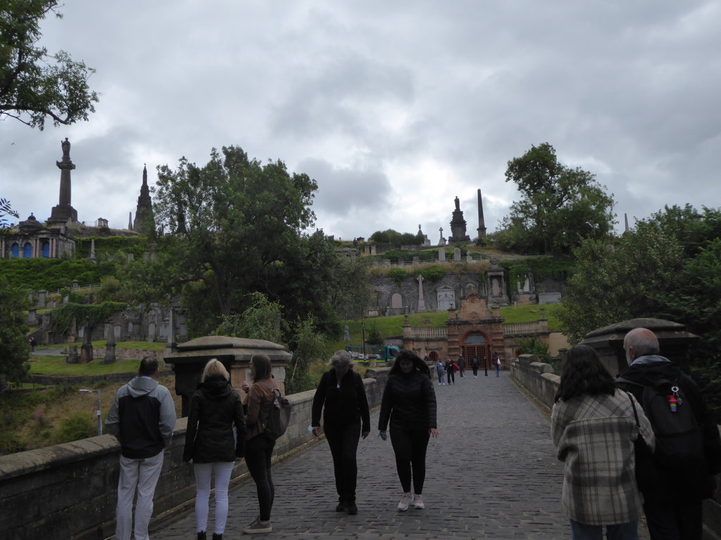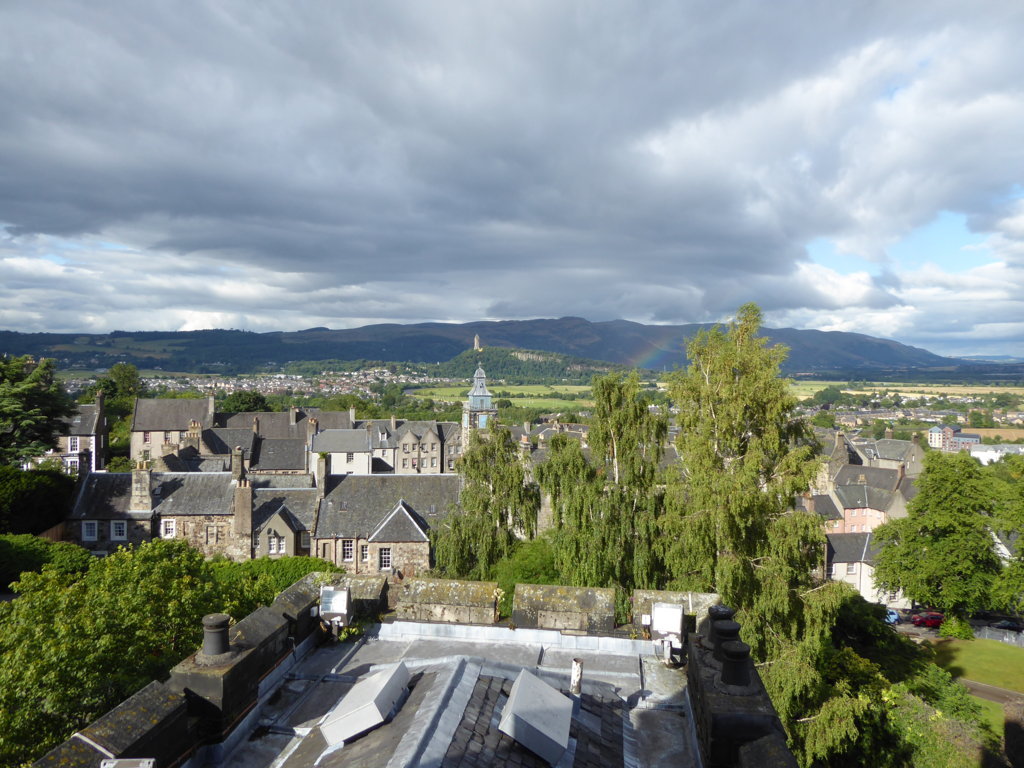 Arrivati a Stirling parcheggiamo nel Linden avenue car park dove non ci sono divieti per la sosta notturna (2 sterline per le 24 ore). Passeggiata di circa 20 minuti (in salita) per raggiungere la Old Town , raccolta sotto il castello, fortezza inespugnabile situata sulla cima di un possente dirupo boscoso (il tappo di un vulcano estinto) . E’ un dedalo di edifici grandiosi e di strade acciotolate che salgono tortuosamente verso il nucleo centrale raccolto sotto al castello. “Prendi Stirling e controllerai la Scozia” : questa massima conferma l’importanza strategica del castello, confermata dalla presenza di una fortezza in questo luogo fin dall’era preistorica. L’attuale struttura risale al XIV-XVI secolo, quando fu eletto a residenza degli Stuart : non visiteremo però le strutture del castello (Great Hall, Royal Chapel, Great kitchens, Tapestry Studio…) né il Royal Palace e la Prince’s Tower (suite di sei camere , tre per il re e tre per la regina, con i soffitti decorati, i camini, gli arazzi) restaurato di recente in un sontuoso tripudio di colori, perché arriviamo quando oramai gli ingressi sono bloccati . Propendiamo quindi per l’unica visita che l’orario ci consente : la Old Jail . Un attore in costume, impersonando diversi ruoli con cambi d’abito, ci illustra in modo coinvolgente i due periodi della storia penitenziaria : dalle vecchie prigioni che avevano la fama di essere le peggiori di Inghilterra (Tolbooth, costruzione poco distante, ora riconvertita in un centro per la musica e le arti) dove ogni crudeltà era giustificata da una logica unicamente punitiva, a quella riformata ed illuminata, ispirata dall’idea del recupero e della riabilitazione sociale e lavorativa. La visita alla torre ci regala una vista a perdita d’occhio sulla città e sulla regione : a parte i raggi di sole che filtrano tra le nuvole incrociati (proprio come il tartan scozzese ! ) e l’arcobaleno, avvistiamo il misterioso Wallace Monument, una torre in stile gotico vittoriano circondata voli di corvi e pipistrelli e dedicata a Braveheart : William Wallace (nato in Scozia nel 1270 e morto a Londra nel 1305) il leggendario combattente per l’indipendenza scozzese soprannominato Hammet of the Scots (il martello degli scozzesi) , divenne eroe nazionale per aver guidato una insurrezione contro Edoardo I d’Inghilterra che nel 1296 aveva deposto e imprigionato il re di Scozia John Balliol. Nel 1297 a capo di 30 uomini assalì la cittadina di Lanark, uccidendo il governatore inglese e sconfisse gli inglesi in una prima battaglia ; venne quindi proclamato Guardiano del regno, ma venne sconfitto dagli inglesi a Falkirk nel 1298 ; nel 1305 fu catturato , processato, torturato e giustiziato a Londra. Le sue vicende ispirarono il film di Mel Gibson del 1995, vincitore di 5 premi Oscar, non pienamente fedele alla intricata vicenda storica. Entriamo poi nel cortile della Church of the Holy Rude, una delle più belle chiese medioevali della Scozia, circondata dal vecchio cimitero .