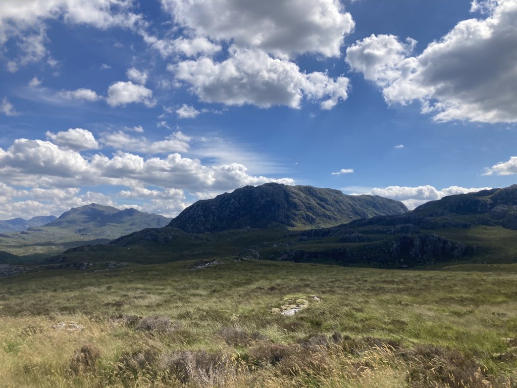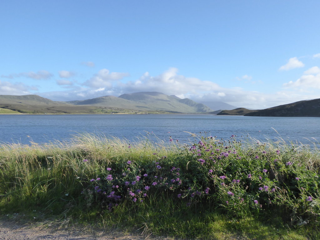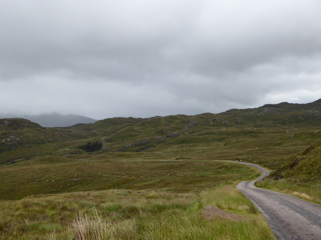 Attraversiamo un alto passaggio in quota immerso nelle nuvole ; poi costeggiamo una miriade di ampi laghi pieni di ninfee ; ci addentriamo poi in un’ampia vallata immersi nel verde placido di alte colline digradanti ricoperte di brughiera ; poi alla destra della nostra stradina che inizia a scendere dolcemente si elevano tre monti ( il Ben Hope 927 m. ; il Ben Hee 873 m. ; il Ben More Assynt 998 m.) ; poi compare alla nostra destra l’ampio fondale sabbioso di un profondo fiordo oltre il quale si eleva un imponente massiccio roccioso, che costeggeremo per chilometri e chilometri ammirando i rivoli ondulati lasciati dalla bassa marea sferzati dal vento, che ha portato via le nuvole e riaperto un cielo azzurrissimo. Non sappiamo piu’ dove guardare, dove fermarci, dove andare … siamo veramente persi in questa grandezza , e qui nel silenzio e nello sguardo solitario a questo tutto, sembra di ritrovare il richiamo più forte della nostra anima.