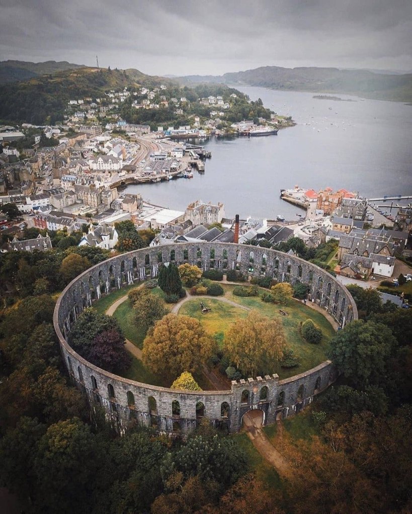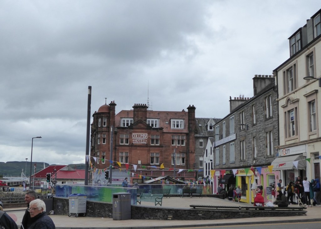 Domina dall’alto la città la McCaig’s Tower, bizzarro anfiteatro in granito nato dalla fantasia di un banchiere che voleva creare un museo, una galleria d’arte e una cappella, riducendo la disoccupazione che colpiva i tagliapietre nella stagione invernale; il progetto comprendeva l’aggiunta di una torre centrale, ma al momento della sua morte erano state completate solo le mura esterne di granito. Gli eredi non diedero seguito alle sue istruzioni e lo strano edificio si è trasformato in una sorta di giardino segreto, dal quale ammirare il fantastico panorama sul mare al tramonto (che noi non vediamo perché arrivano minacciosi nuvoloni neri ed inizia a piovere). Pranziamo con gusto al Coast restaurant, iniziando con la consueta zuppa del giorno (che riuscirà ad essere diversa quasi ogni giorno) … Quando ritorneremo però, ritenteremo di assaggiare il pesce preparato da Oban fish and chips (piccolissimo e oggi affollatissimo) (dall’oceano al tuo piatto, semplice, gustosissimo, con preparazioni molto particolari).