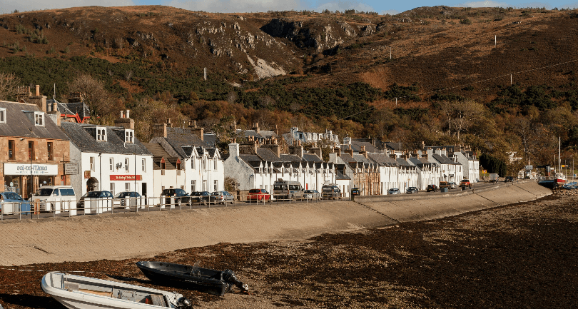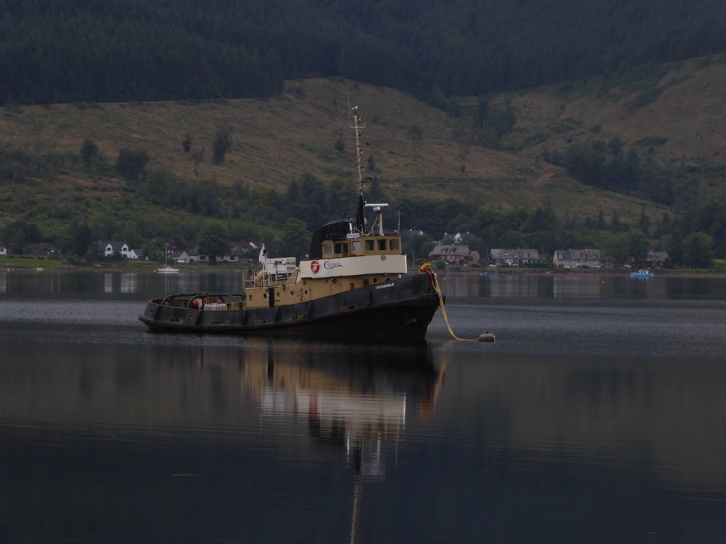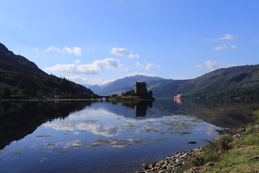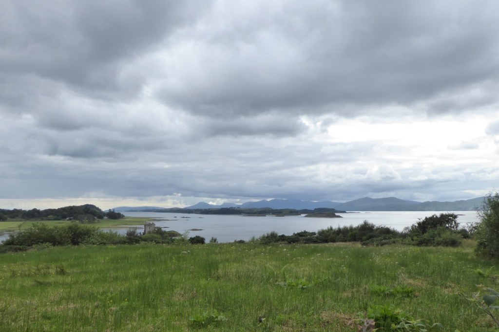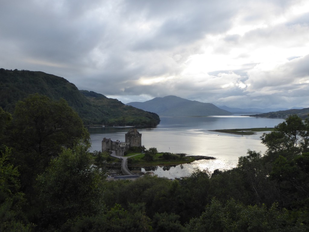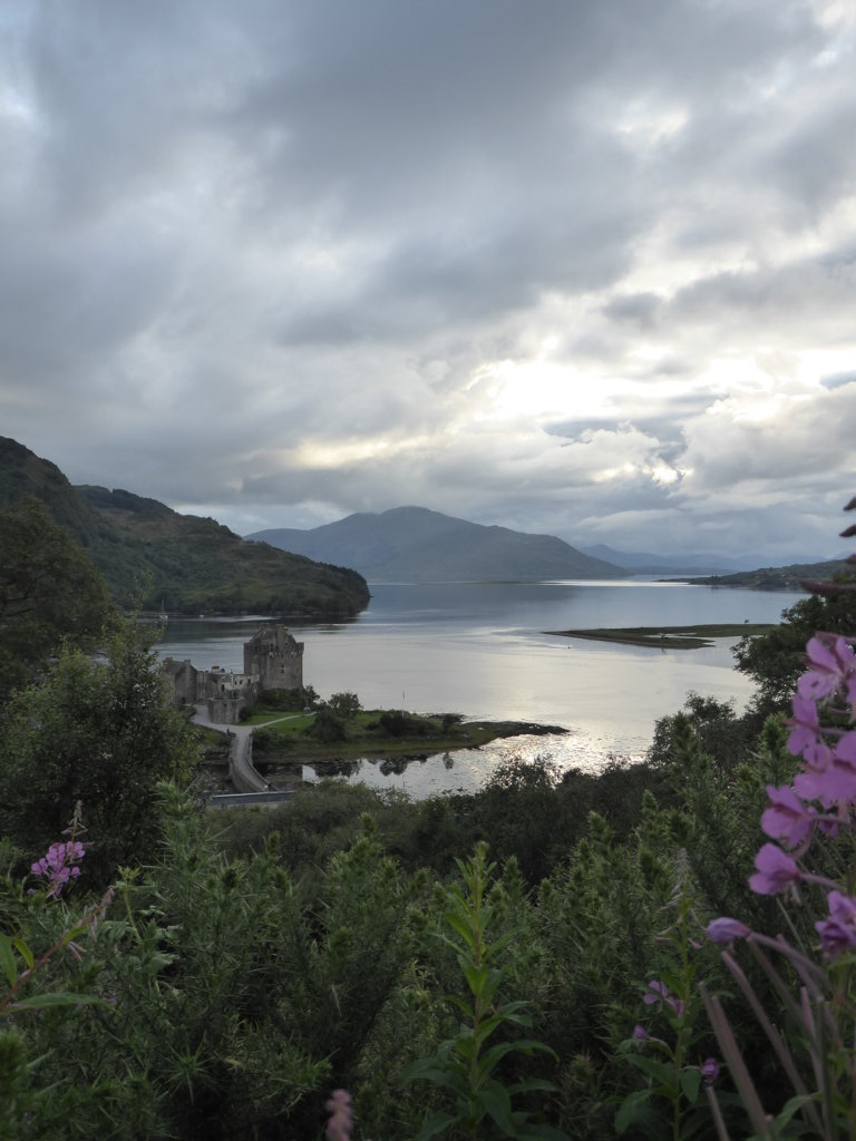 A Portnacroish avvistiamo le romantiche rovine di un castello (Castle Stalker) costruito su una minuscola isola rocciosa nel fiordo di Loch Linnhe, vicino ad una baia dove marea riposa un peschereccio ormeggiato, sotto nuvoloni minacciosi e scuri tra i quali filtra una luce intensa e suggestiva … finalmente riusciamo a trovare un parcheggio per fermarci e fare alcune fotografie .