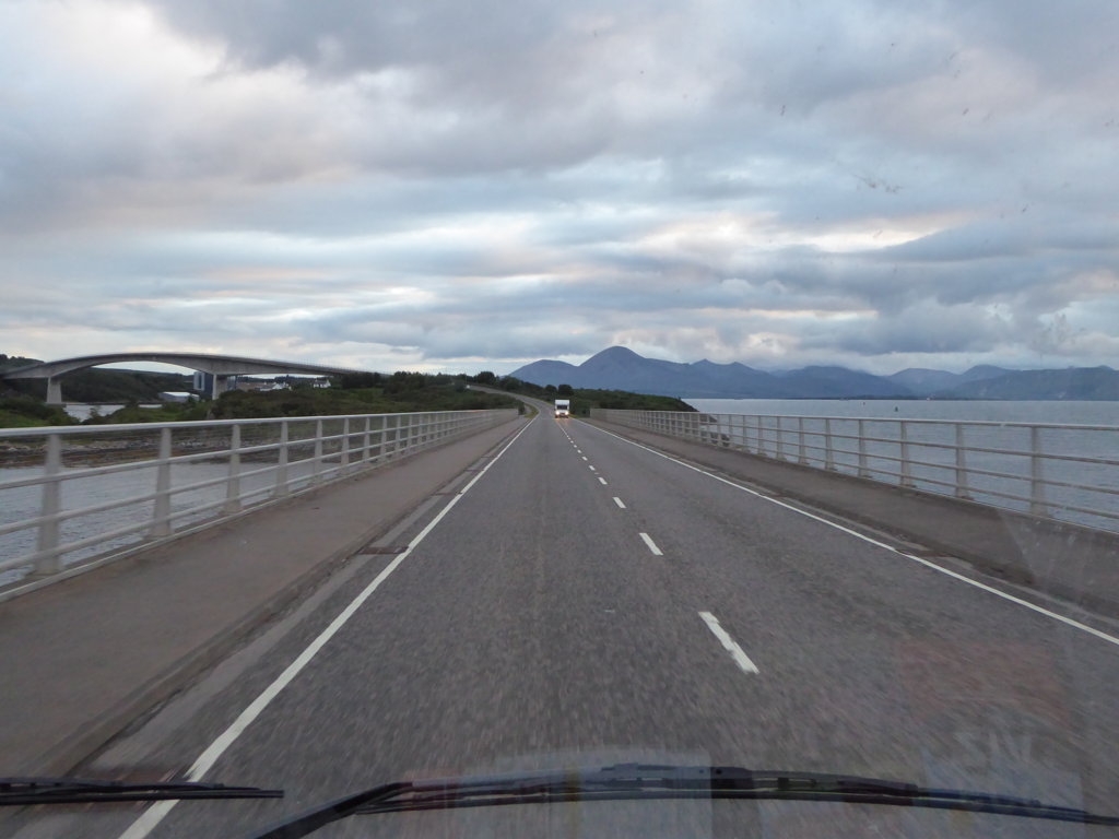 Riprendiamo il nostro percorso e iniziamo a salire verso Dornie : il nostro programma implacabile ci dice che questa sera dovremo arrivare all’isola di Sky, dove finalmente rallenteremo un pò. A Connel attraversiamo il primo di una serie di ponti che attraversano i profondi fiordi che intagliano la costa e proseguiamo la nostra marcia verso nord. Il paesaggio inizia a seguire il ghirigoro delle vie d’acqua e di terra che colora le mappe e contribuisce a determinare una sorta di disorientamento : a volte diventa difficile capire dove ci troviamo… e a volte il cielo e la terra si specchiano e si confondono. La luce diventa protagonista assoluta della bellezza che ci circonda .