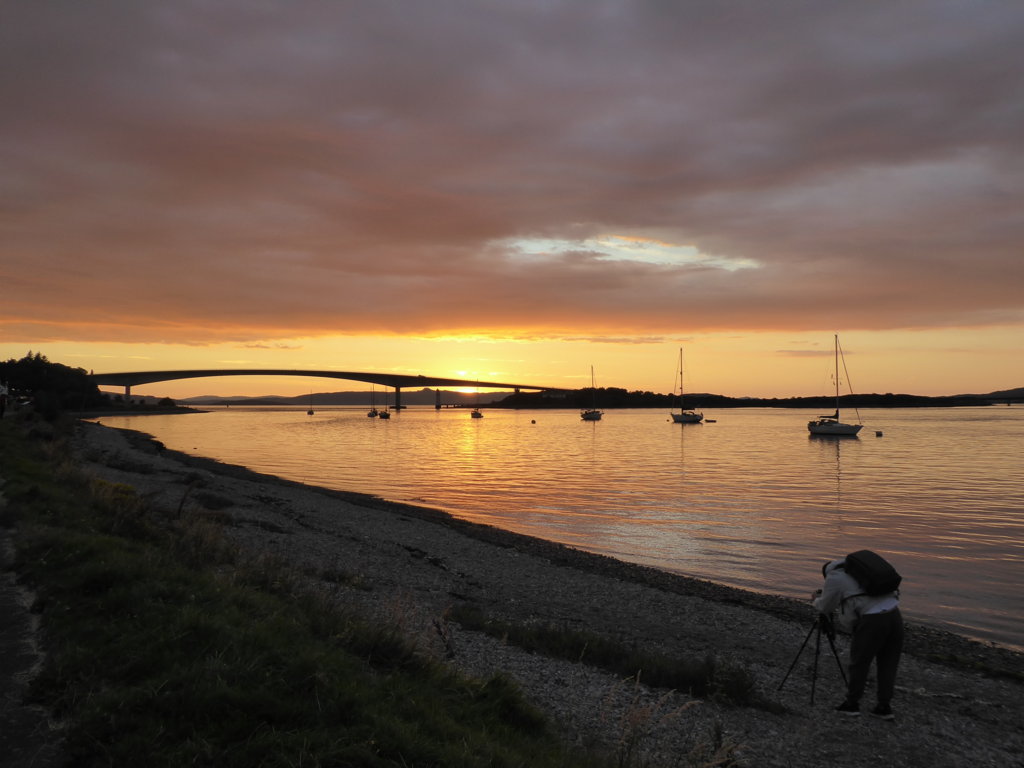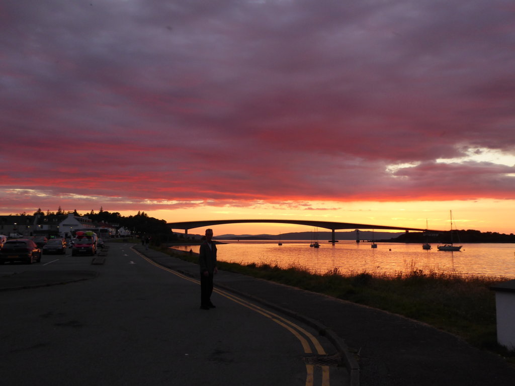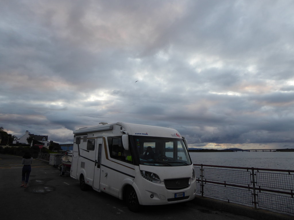 Il castello è visitatissimo : e di conseguenza è vietato tutto, anche il parcheggio notturno . Dopo aver recuperato 15 costosissime bottigliette da 300cc di acqua (nessuno ha bottiglie grandi) per non morire di sete, cerchiamo sistemazione per la notte : i due campeggi vicini sono pieni ; a parte i parcheggi lungo la strada, non troviamo sistemazione gradevole nelle numerose aree di sosta presenti. Tra qualche malumore legato alla stanchezza del viaggio, non vogliamo rassegnarci all’idea di essere in uno dei luoghi più belli della Scozia e dover dormire sacrificati in brutti parcheggi : di essere a un passo dalla meraviglia e circondarci di angusti orizzonti, per cui decidiamo di non desistere e approfittiamo della luce del lunghissimo tramonto scozzese per arrivare sull’ isola di Skye, peraltro ormai vicinissima. Iniziamo a percorrere lo Skye Bridge : in realtà si susseguono tre lunghissimi ponti , improvvisamente illuminati dalla luce folgorante del tramonto che irrompe tra il basso confine delle nuvole e quello del mare e ci fermiamo immediatamente nel porticciolo di Kyleakin (190 abitanti) , su cui vigilano le rovine di un piccolo castello : un piccolo paradiso illuminato dalla luce del tramonto che buca (letteralmente) le nuvole prima grigie, poi blu. La luce è padrona dell’orizzonte e cambia velocemente il colore del cielo e del mare.