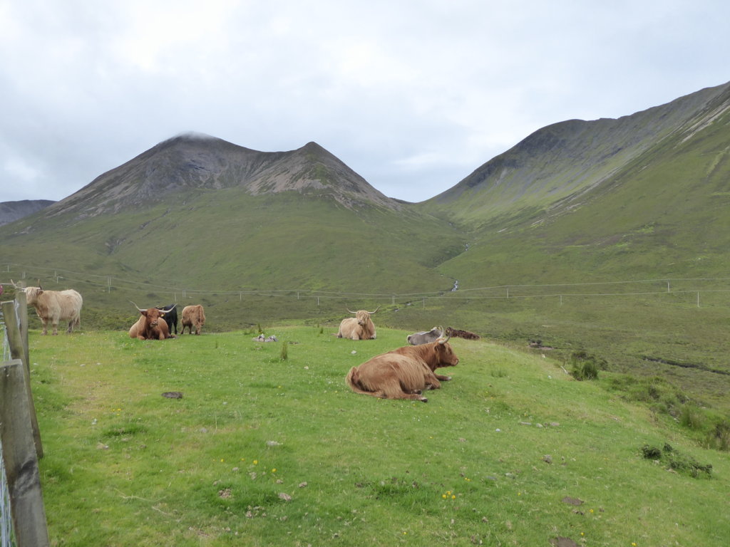 Mercoledì 27 luglio 2022 . Iniziamo la giornata con una passeggiata nel porticciolo, dove scopriamo che il paesino ospita una colonia di lontre residenti, che però non riusciamo ad avvistare. Troviamo solo un hotel che offre una colazione completa a buffet (dolce o salata) a 12 sterline (non esiste alcun bar aperto al mattino). Ci accompagnano nuvole e pioggerellina per tutta la giornata. Il programma è apparentemente semplice : cercheremo di fare il giro completo dell’isola di Skye , percorrendo la strada che ci condurrà via via a scoprire le bellezze naturalistiche del paesaggio. E’ la più estesa delle circa 800 isole scozzesi, con i suoi 9900 abitanti : 80 chilometri di brughiere vellutate, aspre montagne, fiordi e laghi scintillanti, scogliere a picco sul mare delle Ebridi. Con queste isole rimane il centro della cultura gaelica : ospita la scuola gaelica più importante e oltre un terzo della popolazione parla correntemente il gaelico. Non è semplice neppure fare una semplice conversazione in inglese, per una inflessione che lo rende abbastanza incomprensibile (anche per gli inglesi). La strada è discreta , a percorrenza lenta perché si snoda generalmente sulla costa attraversando un territorio montuoso, che scende nel mare dolcemente o precipita da alte scogliere. Su un altipiano incontriamo la nostra prima mandria delle mucche scozzesi con il ciuffo e le ampie corna : le Highlander (o Hebridean breed, o Heilan coo, o Kyloe ). E’ capace di resistere alle temperature più rigide (-40°) ed alle malattie e puo’ rimanere in alta quota anche durante la stagione fredda. Non sono solo bellissime, ma anche tranquille e simpatiche, pacifiche e mansuete: ci osservano incuriosite e si avvicinano lentamente, mentre alcune osservano il panorama meditabonde.