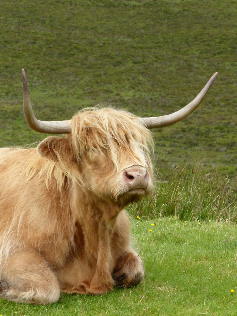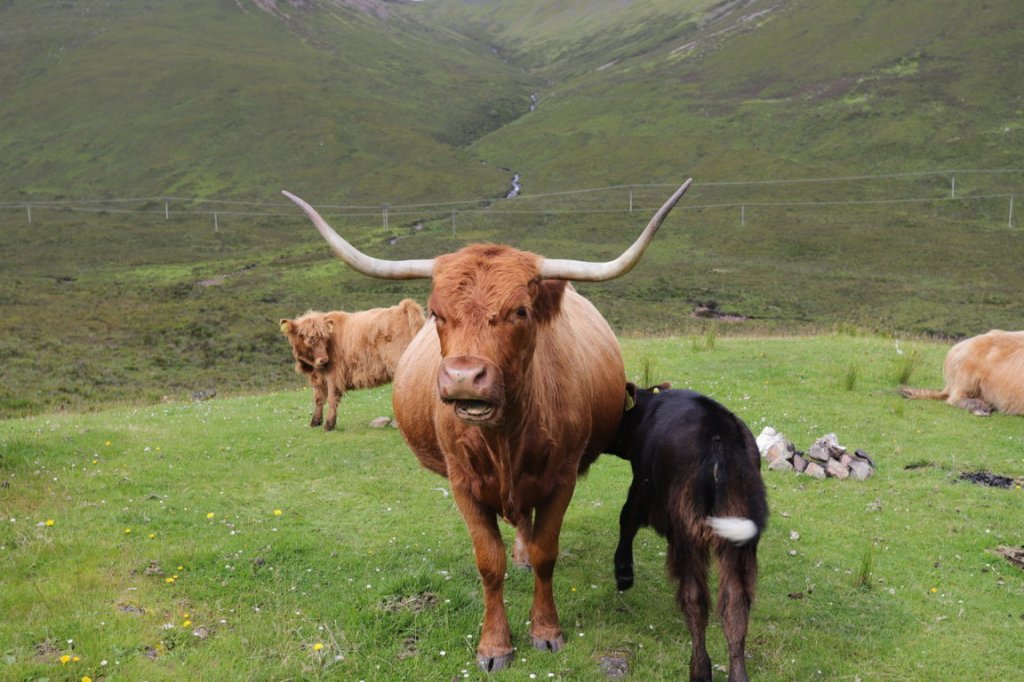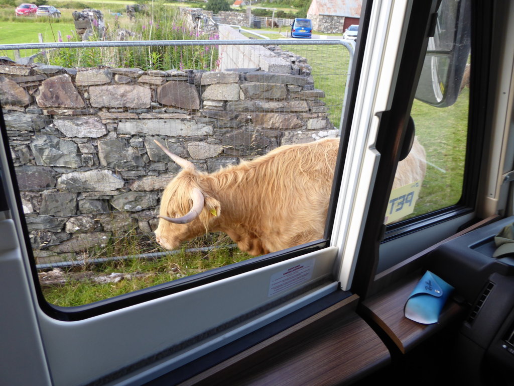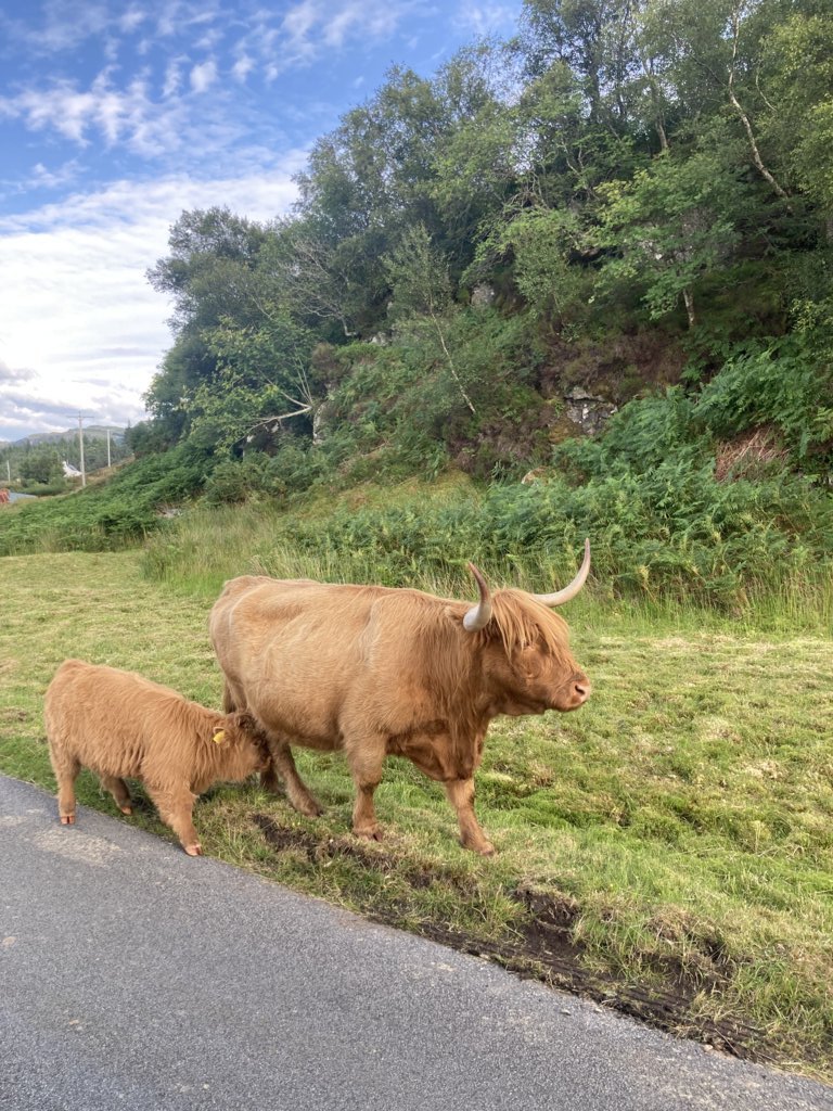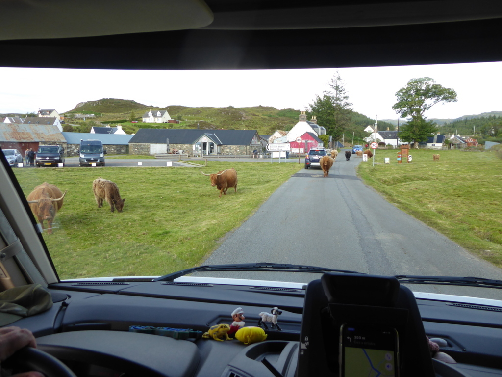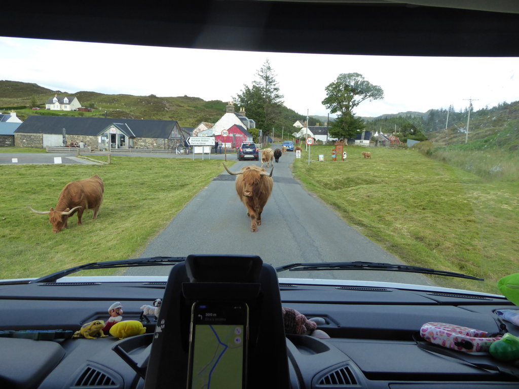 All’uscita dall’isola, incrociamo una mandria di Highland Cows che procede placidamente sulla one way in direzione contraria alla nostra sotto lo sguardo divertito ed orgoglioso del mandriano che impartisce indicazioni gentili : ovviamente ci fermiamo ed attendiamo il passaggio di tutte le mucche, che hanno la precedenza assoluta (come tutti gli animali in Scozia) e ci osservano curiose e placide, sfiorandoci con le lunghe corna.