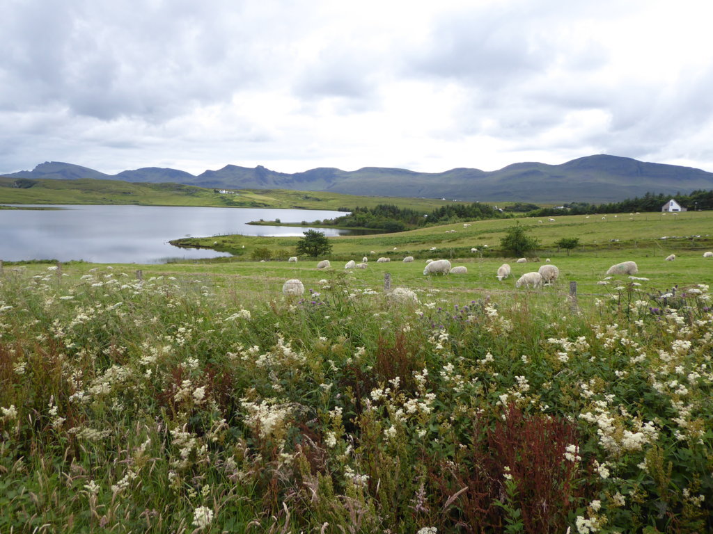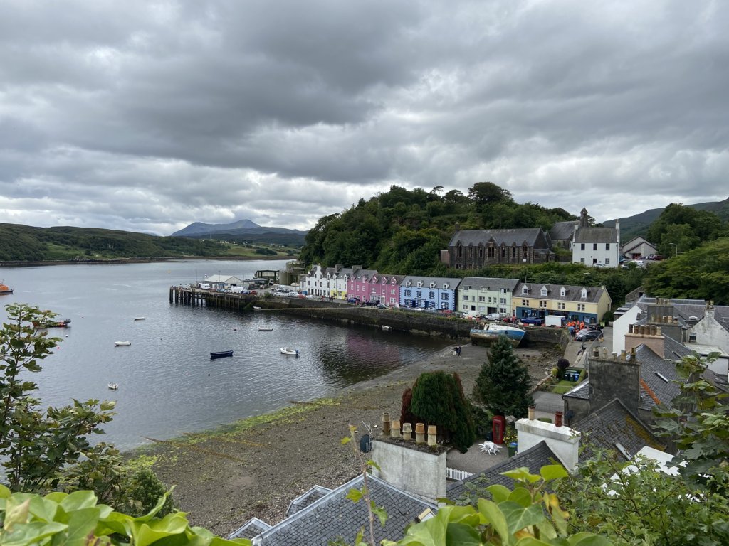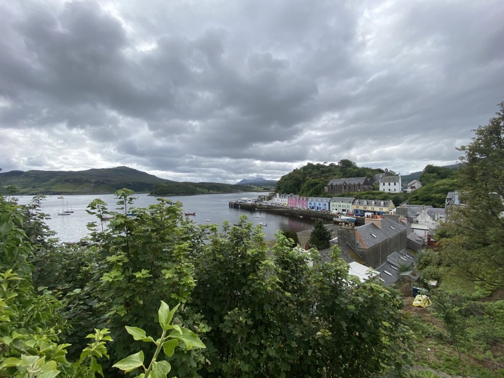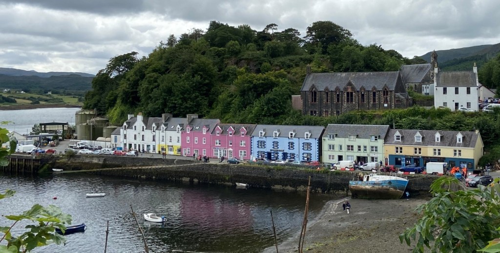 La prima tappa è la capitale dell’isola , Portree . Con i suoi 2500 abitanti è una specie di metropoli, ma ai nostri occhi conserva l’atmosfera di un villaggio, con il suo porticciolo circondato da case colorate. Mangiamo un fish and chips seduti nel porto, facendo attenzione a non farci rubare nulla dai gabbiani famelici che sorvegliano il traffico. In Scozia non ci sono animali feroci, ma è meglio stare molto attenti ai gabbiani : nelle terre del nord diventano instancabili predatori, furbi e alla ricerca continua di cibo. Oggi continuano a fare ampi giri tondi sulle nostre teste e sul porto , con acuti richiami : e all’improvviso un vorace gabbiano è planato in picchiata sul vassoio di una signora e le ha abilmente rubato in un attimo ed una unica mossa tutto il fish (un intero filetto di merluzzo impanato e fritto). Scena divertente, che però ci ha messo in allerta e ci ha costretto a pensare ad una strategia per consumare il nostro pesce ; tutti vicini e chinati in avanti, per nascondere il bottino. Il problema non riguarda solo noi, ed ognuno trova soluzioni personali : i più solitari mangiano nascosti dalla chioma protettiva degli alberi. Giro panoramico e nei negozi, tra tessuti scozzesi, highland cows , puffins e pecore e magnifici panorami che ispirano artisti e pittori.
