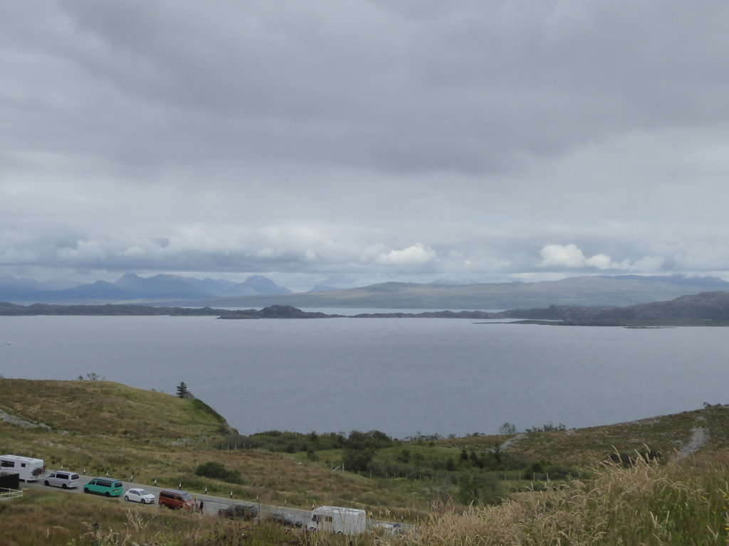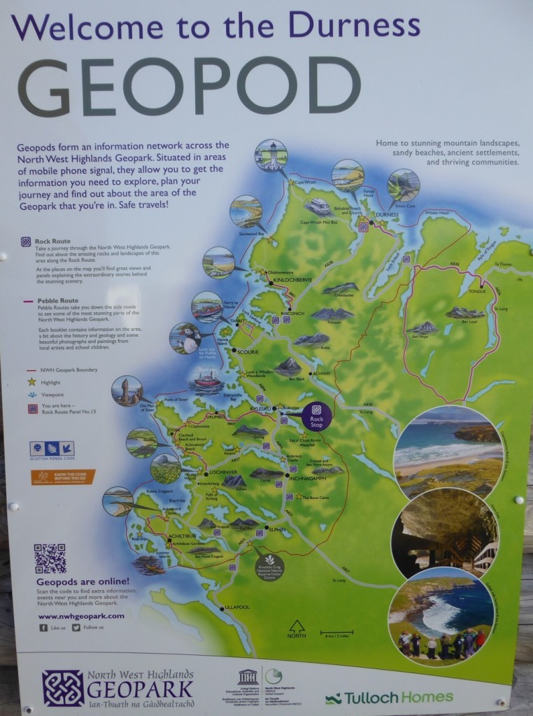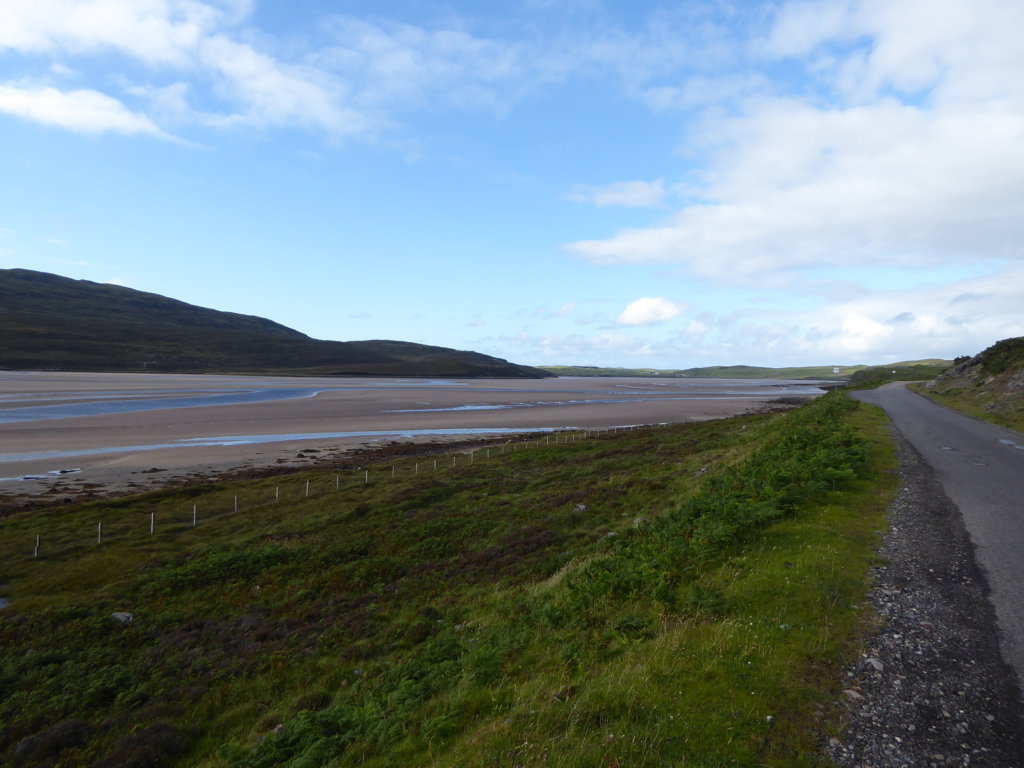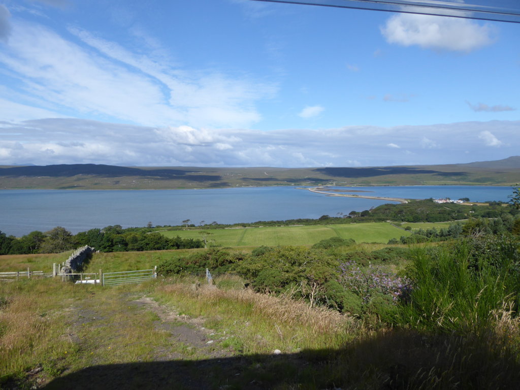 Ci troviamo nel North West Highlands Geopark, che fa parte di una rete di oltre 240 aree di rilevante interesse geologico, riconosciute dall’UNESCO, e in particolare in una tappa della Pebble Route 4 (la strada delle pietre numero 4). Il fiordo comprende anche l’estuario del fiume Dionard , e questa particolare conformazione lo rende l’ambiente ideale per la pesca al salmone. La struttura del terreno (arenaria cambriana) lo ha reso un suolo fertile, adatto per attività agricole e pastorizia. Ci troviamo infatti nel territorio della fattoria Keoldale, una delle più estese della Scozia (che contiene anche un insediamento dell’età del bronzo) ; verso le 21 un anziano rappresentante della stessa bussa alla nostra porta e ci chiede di pagare il contributo per il parcheggio notturno (15 sterline), rilasciandoci regolare ricevuta scritta con calligrafia tremolante.
