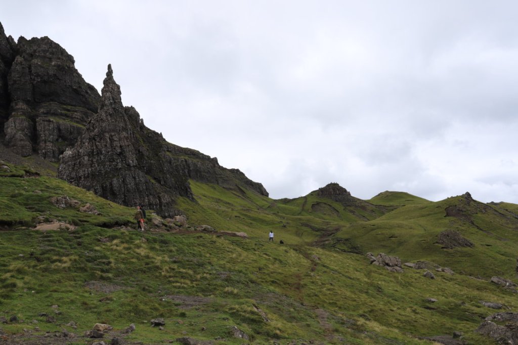 Seguiamo poi la litoranea verso nord e iniziamo il giro della penisola del Trotternish, che offre paesaggi spettacolari. Arriviamo alla salita per l’ Old Man of Storr , un pinnacolo di basalto che un terremoto ha staccato dalla roccia madre (lo Storr appunto) e sembra osservare la vallata e il mare di fronte a sé . L’Old Man sembra sparire, a seconda dei punti di osservazione, per poi ricomparire come un possente guardiano ; oppure sembra inclinarsi verso il mare ed essere sul punto di cadere. La salita è ripidissima ed impegnativa, e ancora di più la discesa, nella quale vengo praticamente trasportata dalla Jessica. L’orizzonte verso il mare è punteggiato da più linee di terra, che sembrano moltiplicarsi all’infinito ; tra la roccia e il mare si apre una larghissima vallata disseminata di laghi e fiumi. Non resisto alla tentazione di citare alcune delle bellissime fotografie che lo hanno immortalato : io sono talmente emozionata e rapita che non riesco più a capire dove devo puntare la macchina fotografica.