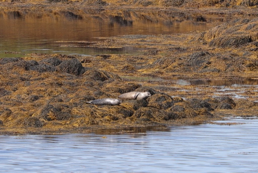 Al ritorno facciamo una tappa per ammirare il faraglione Stac Clò Kearvaig, detto “La Cattedrale” per l’aspetto di due guglie e una finestra naturale creata dall’erosione ; nella spiaggia c’è anche un boothy . Scopriamo che nel territorio selvaggio scozzese esistono questi ripari , piccole casette in pietra con la porta sempre aperta, disponibili per i camminatori per la sosta gratuita : sono semplicissimi bivacchi senza elettricità, acqua o luce, con un caminetto. Per quello sulla spiaggia di Kervaig si sta presentando il problema di permanenze gratuite troppo prolungate in questa sistemazione privilegiata … E quasi alla fine del viaggio di ritorno, in mezzo al grande fiordo, avvistiamo alcune foche che si godono il sole e la fresca corrente dell’acqua su un affioramento sabbioso.