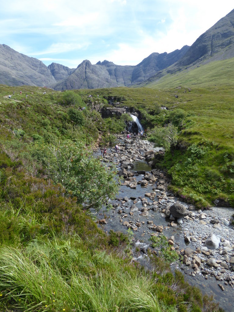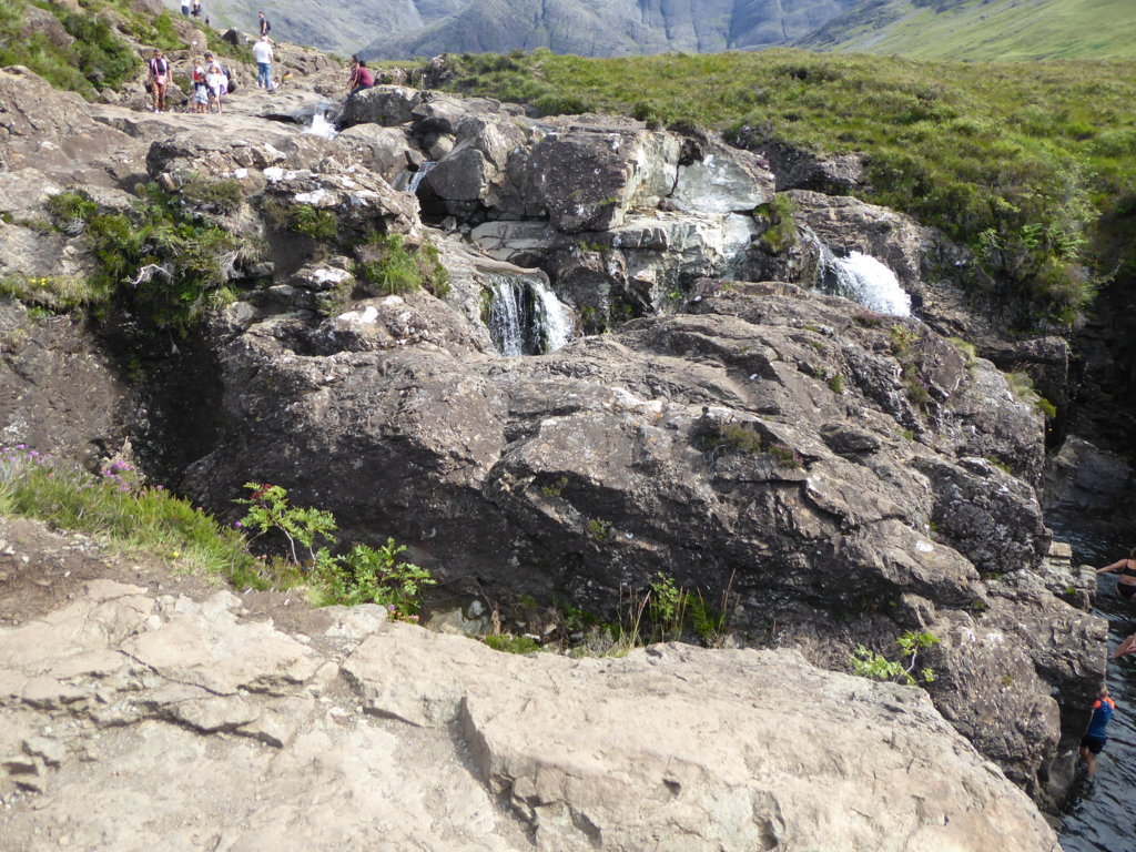 Decidiamo poi di puntare direttamente alle Fairy Pools letteralmente le piscine delle fate , dove facciamo un veloce pranzo-merenda. E senza sosta partiamo per la visita del luogo, che richiede una passeggiata gradevole, ma impegnativa : il primo tratto in mezzo ai prati (che noi prendiamo come una scorciatoia ), che si rivelano zuppi di acqua e solcati da rivoli nascosti dall’erba. Tra scivoloni, salti e risate recuperiamo il sentiero che ci porta alle cascate che , scendendo lungo la collina, hanno formato gruppi di ampie vasche nella roccia calcarea, dove decine di persone fanno il bagno, si tuffano dalle alte rive, si immergono ed attraversano passaggi sommersi da una vasca all’altra facendosi portare dalle acque in caduta.