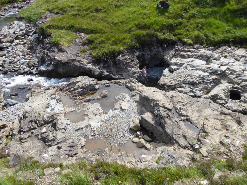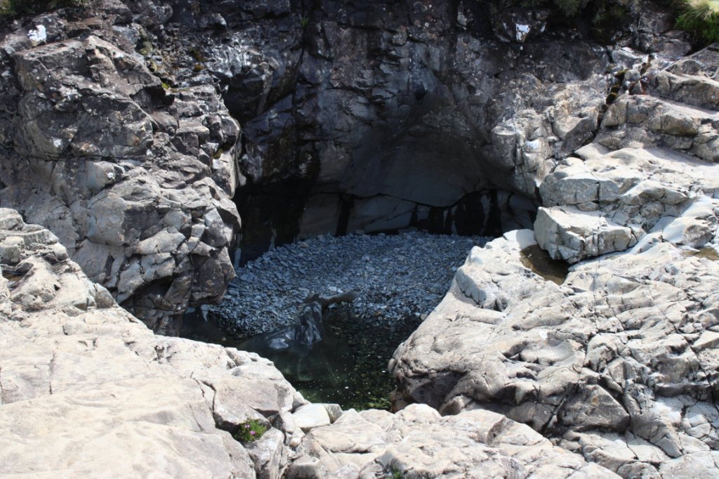 In ultimo alcune fotografie a : il Balnakeil Cemetery affacciato sul mare (dove riposa la zia di John Lennon) , ai resti della Balnakeil Church, alla splendida Balnakeil Farm (proprietaria del passaggio). Con gli occhi, la mente e il cuore pieni di luce e vento, ci dirigiamo poi alla vicina Durness, che attraversiamo velocemente per sostare brevemente alle Smoo Cave : nella grotta principale una cascata scende dal centro della volta … ma le scarse piogge di questa estate hanno seccato il torrente che la alimenta. Le visite però per oggi sono chiuse (e comunque richiederebbero una ardita discesa su una scaletta metallica verticale che ti porta al barcone che rende possibile la visita al dedalo di grotte allagate). Per cui ci accontentiamo di una veloce passeggiata sui sentieri del luogo.