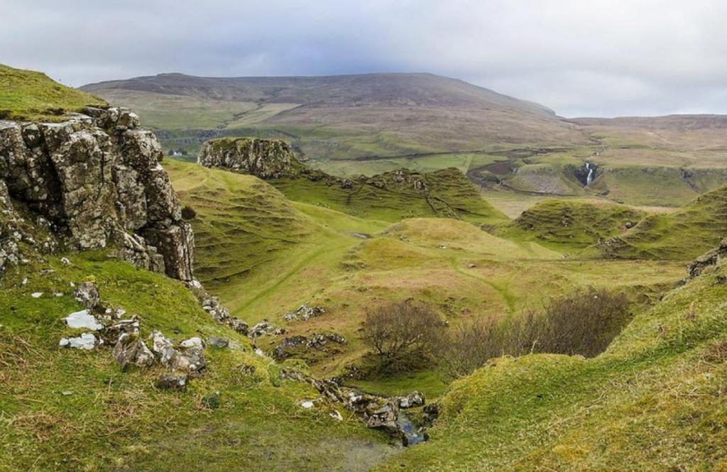 Da Wikipedia. Si chiama Fairy Glen, letteralmente “valle delle fate“, ed è una delle mete più incantevoli dell’Isola di Skye, in Scozia. Il sentiero si dipana intorno a piccoline collinette arrotondate, punteggiate da lochans (che significa piccoli loch, ovvero piccoli laghi) e da cascate sparse qua e là. L’atmosfera è ultraterrena, ed è proprio questa che ha fatto guadagnare al luogo il suo nome: tutti gli elementi naturali sono raccolti in una piccola area, che sembra quasi una versione in miniatura di una meraviglia geologica di larga scala. Il Fairy Glen non ha reali leggende o storie che riguardano le fate e che collega il luogo a un mondo magico, benché qualcuno affermi che siano state le fate a creare il paesaggio, e che ancora oggi abitino le fessure tra le rocce. In realtà, le formazioni geologiche uniche del Fairy Glen sono il risultato di una frana. Una delle colline ha ancora uno strato di basalto in cima. Da una certa distanza, somiglia quasi ad un’antica rovina, e per qualche motivo è stata chiamata Caste Ewan. Ci si può arrampicare fino in cima, da cui si gode di una bella vista. Nella bassa rupe dietro al “castello” c’è una piccola caverna dove, a quanto si dice, inserire monete nelle crepe nelle rocce porta fortuna. Di recente, i visitatori hanno iniziato a spostare piccole rocce per creare spirali sul terreno. Le guide turistiche dicono che si può lasciare una moneta al centro, come offerta per le fate, ma gli abitanti del luogo non sono entusiasti della cosa, in quanto preferirebbero lasciare la valle al suo stato naturale.