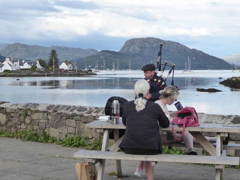 Ci dirigiamo infine a Plockton (380 abitanti), dove non riusciamo a mangiare all’Inn che serve favolosi piatti di pesce ; ci accontentiamo di una cena da asporto consumata in riva al mare, in compagnia di ragazzi che fanno il bagno (in acque gelide) e di famiglie che fanno picnic serali suonando la cornamusa. Belle casette affacciate al mare; in un negozio una tazza ironica annovera il villaggio tra le grandi metropoli : NEW YORK-LONDON-PARIS-PLOCKTON. Noi siamo d’accordo ….