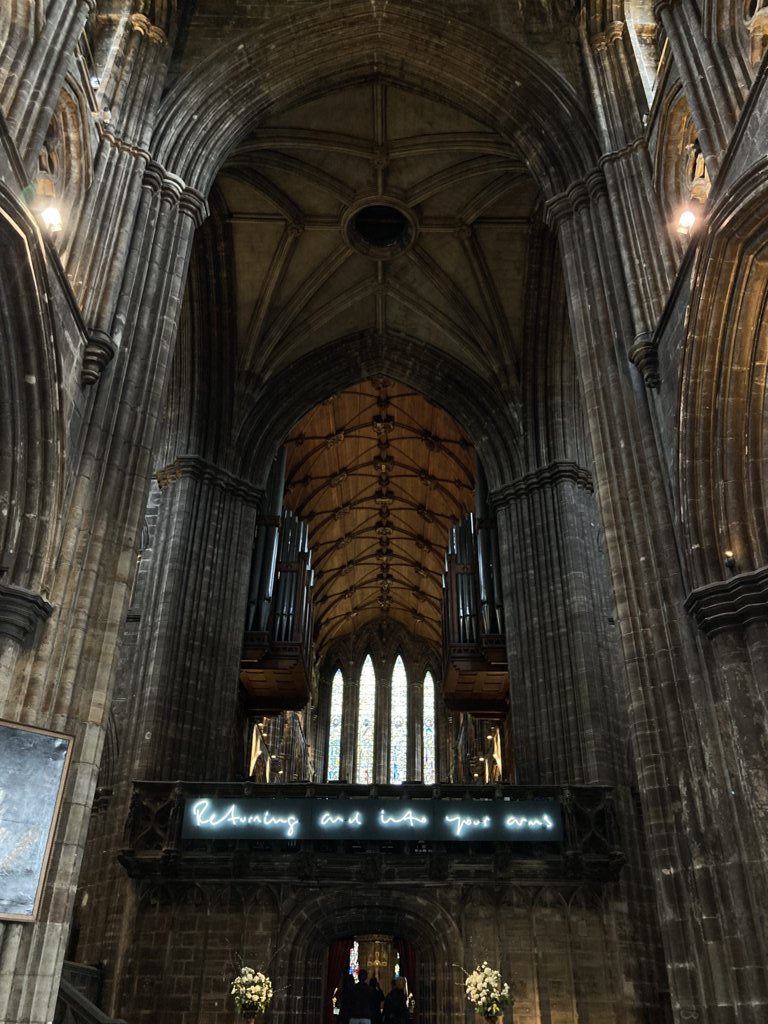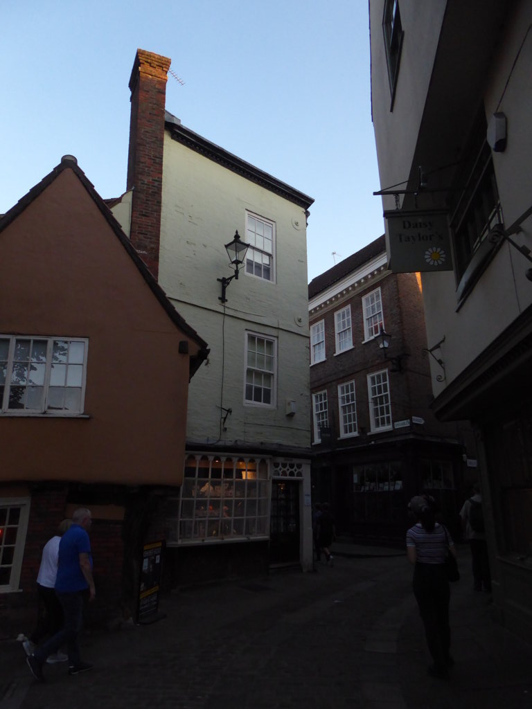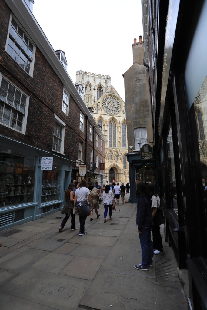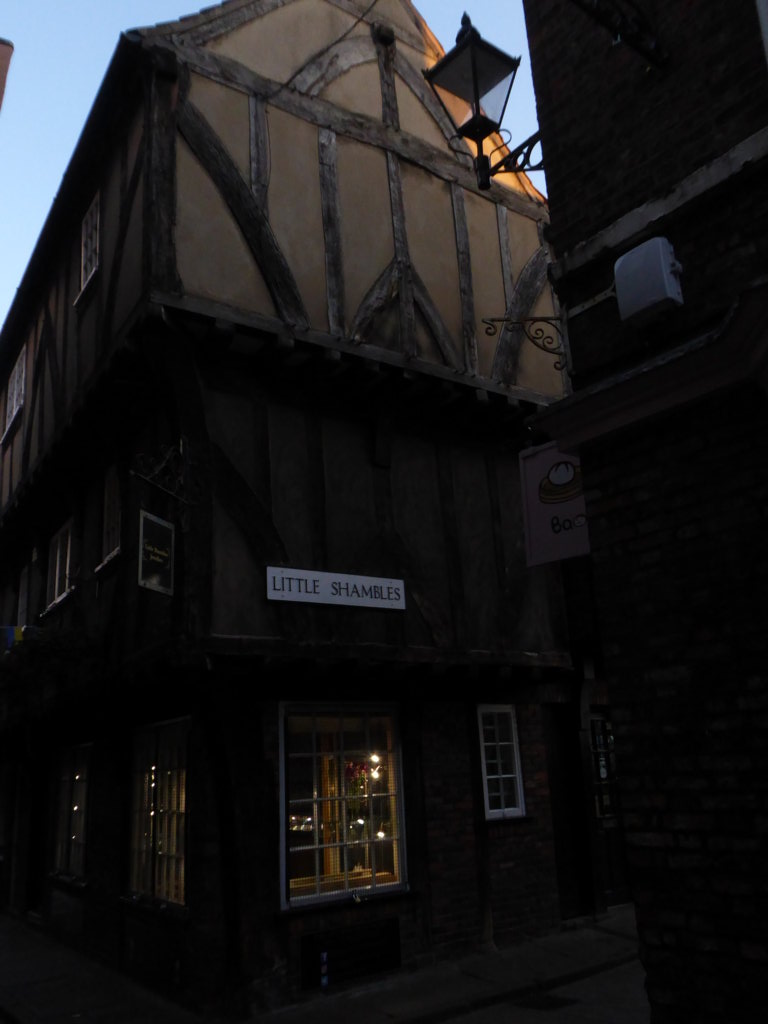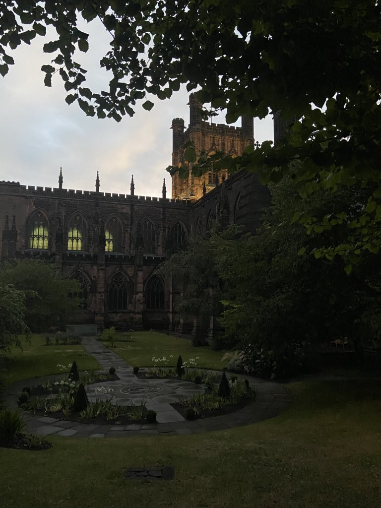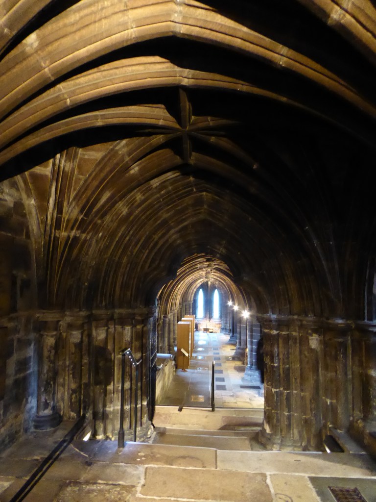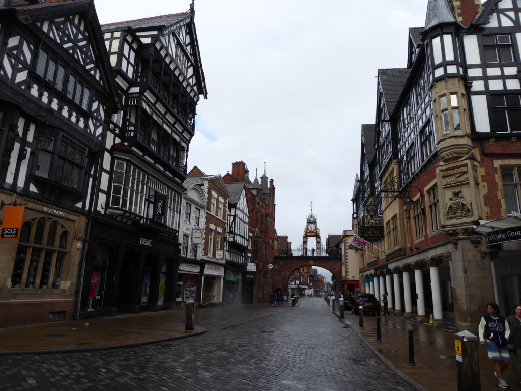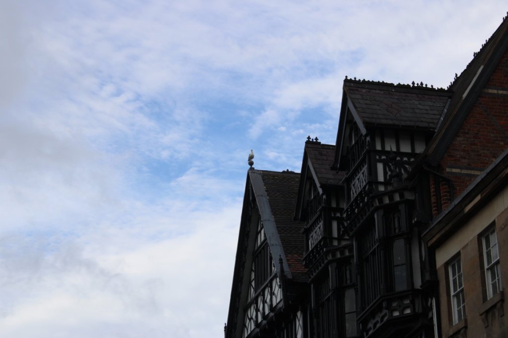 Arriviamo a Chester a metà pomeriggio, e parcheggiamo lungo il fiume Dee al Little Roodee Car Park, silenzioso e grande parcheggio sotto al castello, dove dormiremo anche la notte (15 sterline il parcheggio dal pomeriggio al mattino successivo) . La nostra guida afferma che “la splendida Chester è uno dei doni più grandi che la storia inglese possa offrire ” : il centro storico – fondato in epoca romana nel primo secolo d.C. – è protetto da una bellissima cerchia di mura in arenaria rossa ad oggi quasi completamente intatte. Inizialmente è stata il quartier generale della ventesima legione romana che presidiava a nord i confini dell’impero : la chiamarono Deva Victrix e le diedero una forte e duratura impronta culturale (anche nei secoli successivi – quando venne conquistata dai Sassoni e poi dai Normanni , rimase in abitata dai britannici romanizzati). Conobbe poi una enorme espansione commerciale dal medioevo grazie ai traffici nel suo porto, che oggi non esiste più. Nel centro storico si trovano i caratteristici Rows , gallerie commerciali su due livelli che riempiono le quattro vie che si diramano dalla Central Cross : praticamente i primi centri commerciali della storia, che riunivano decine e decine di piccoli negozi protetti da portici . Passeggiamo circondati in ogni dove da edifici Tudor e vittoriani, originali o perfettamente restaurati e il colpo d’occhio è notevole : qualcuno l’ha descritta come un gigante Liberty (riferendosi all’edificio vittoriano che a Londra ospita il magazzini Liberty), e il paragone è azzeccato. In uno dei portici commerciali ci incuriosisce un avviso che rassicura i passanti sulle buone condizioni di salute del gabbiano Steven, che evidentemente si finge malato per ottenere cibo e per introdursi dentro ad uno dei negozi : vorremmo conoscerlo, ma non è nei paraggi. Attraversiamo il Godstall Lane, vicolo medioevale che merita l’appellativo di “cuore romantico di Chester”. Visitiamo anche la Chester Cathedral dove siamo calorosamente accolti : sorta come abbazia benedettina sui resti della precedente chiesa sassone dedicata a Santa Werburga , patrona della città, fu chiusa nel 1540 durante la dissoluzione dei monasteri ordinata da Enrico VIII e in seguito riconsacrata come cattedrale : in pietra rossa , di stile normanno gotico perpendicolare, svetta con leggerezza. Ci stupisce e non riusciamo a capire la motivazione dell’illuminazione decisamente viola della crociera, dell’organo e dei bellissimi fregi lignei dietro all’altare …