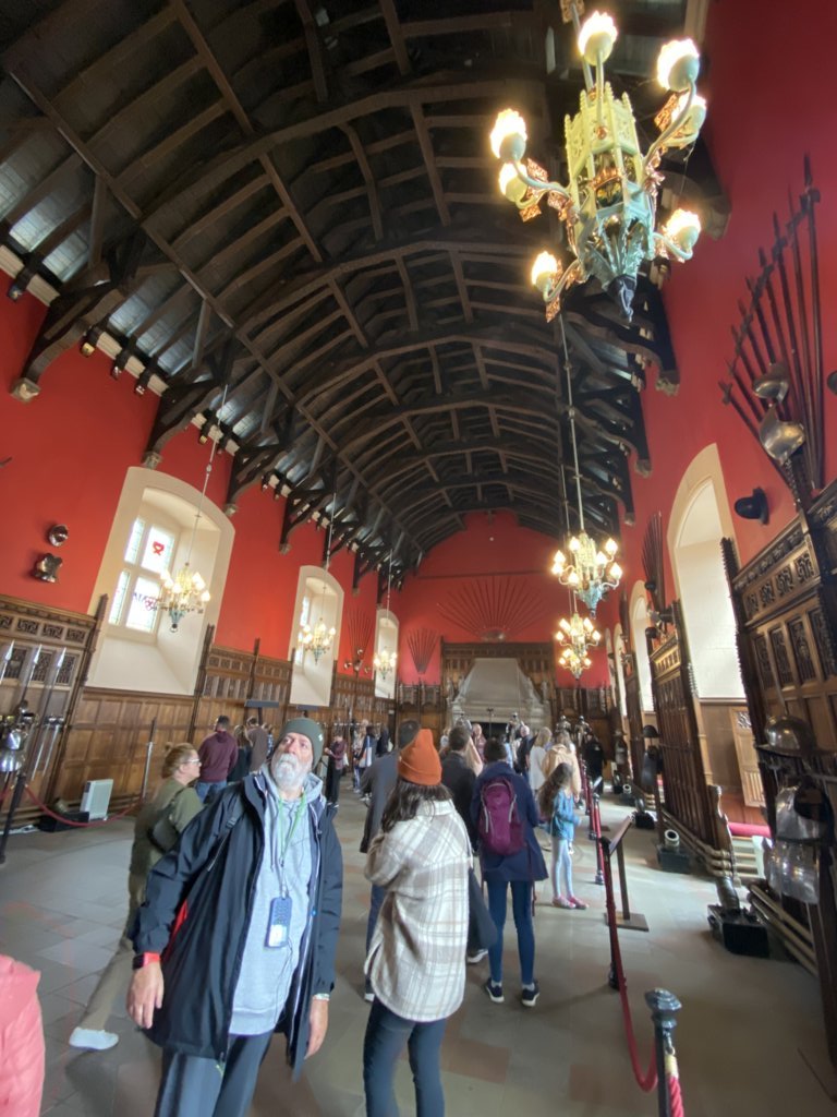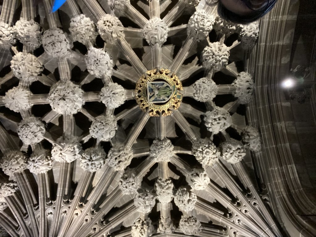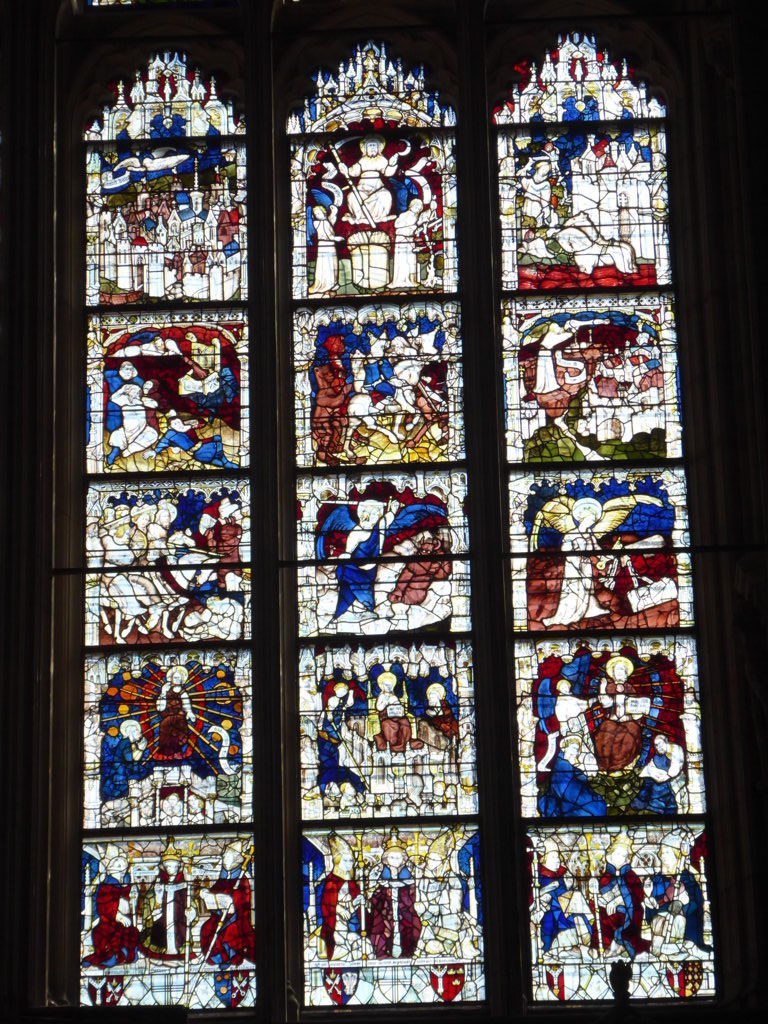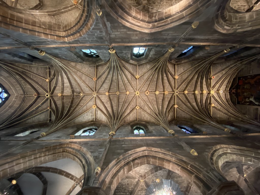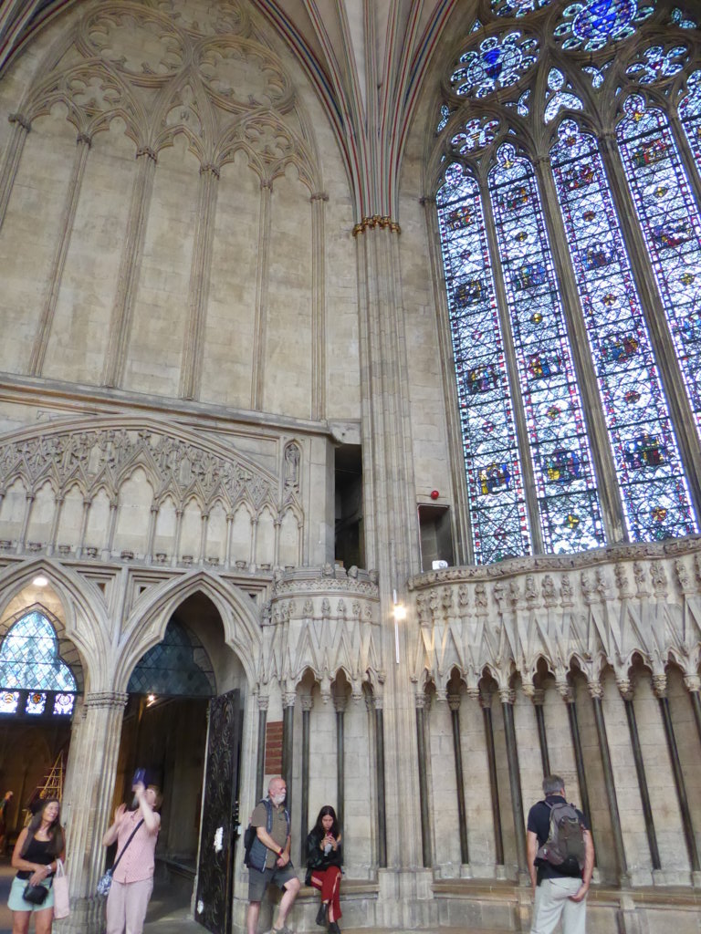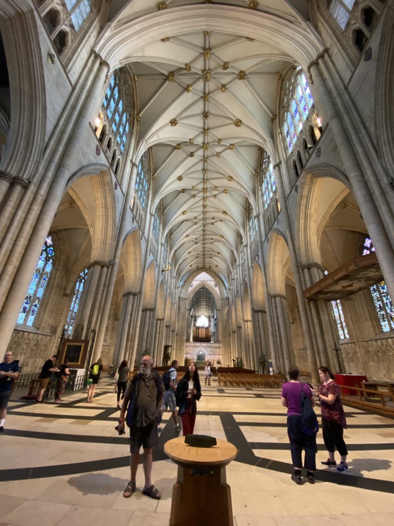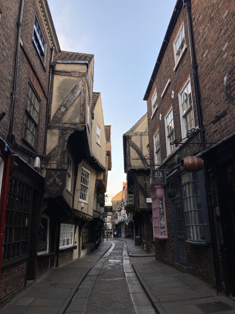 Arriviamo a Chester a metà pomeriggio, e parcheggiamo lungo il fiume Dee al Little Roodee Car Park, silenzioso e grande parcheggio sotto al castello, dove dormiremo anche la notte (15 sterline il parcheggio dal pomeriggio al mattino successivo) . La nostra guida afferma che “la splendida Chester è uno dei doni più grandi che la storia inglese possa offrire ” : il centro storico – fondato in epoca romana nel primo secolo d.C. – è protetto da una bellissima cerchia di mura in arenaria rossa ad oggi quasi completamente intatte. Inizialmente è stata il quartier generale della ventesima legione romana che presidiava a nord i confini dell’impero : la chiamarono Deva Victrix e le diedero una forte e duratura impronta culturale (anche nei secoli successivi – quando venne conquistata dai Sassoni e poi dai Normanni , rimase in abitata dai britannici romanizzati). Conobbe poi una enorme espansione commerciale dal medioevo grazie ai traffici nel suo porto, che oggi non esiste più. Nel centro storico si trovano i caratteristici Rows , gallerie commerciali su due livelli che riempiono le quattro vie che si diramano dalla Central Cross : praticamente i primi centri commerciali della storia, che riunivano decine e decine di piccoli negozi protetti da portici . Passeggiamo circondati in ogni dove da edifici Tudor e vittoriani, originali o perfettamente restaurati e il colpo d’occhio è notevole : qualcuno l’ha descritta come un gigante Liberty (riferendosi all’edificio vittoriano che a Londra ospita il magazzini Liberty), e il paragone è azzeccato. In uno dei portici commerciali ci incuriosisce un avviso che rassicura i passanti sulle buone condizioni di salute del gabbiano Steven, che evidentemente si finge malato per ottenere cibo e per introdursi dentro ad uno dei negozi : vorremmo conoscerlo, ma non è nei paraggi. Attraversiamo il Godstall Lane, vicolo medioevale che merita l’appellativo di “cuore romantico di Chester”. Visitiamo anche la Chester Cathedral dove siamo calorosamente accolti : sorta come abbazia benedettina sui resti della precedente chiesa sassone dedicata a Santa Werburga , patrona della città, fu chiusa nel 1540 durante la dissoluzione dei monasteri ordinata da Enrico VIII e in seguito riconsacrata come cattedrale : in pietra rossa , di stile normanno gotico perpendicolare, svetta con leggerezza. Ci stupisce e non riusciamo a capire la motivazione dell’illuminazione decisamente viola della crociera, dell’organo e dei bellissimi fregi lignei dietro all’altare …