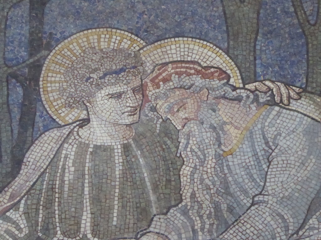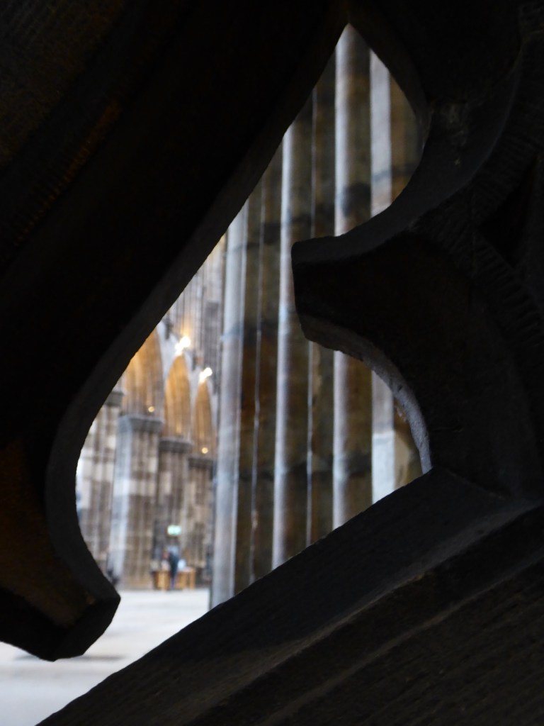 Martedì 26 agosto ci svegliamo sotto un cielo nuvoloso : pedalata al monte – con sosta nei prati di pascolo per foto panoramica – per la visita della Cattedrale (direi quasi d’obbligo) , prenotata per le 11 ; nonostante l’anticipo riusciamo ad entrare solo un’ora dopo. Qui ci sono due maree : quella marina e quella umana, che scorre inarrestabile nelle strette viuzze (si tratta del secondo monumento più visitato in Francia, dopo la Tour Eiffell). La salita alla cattedrale è molto affollata ; controlli di sicurezza, mostra di fotografie del Monte e visita in autonomia. Mont St. Michel conta meno di 40 abitanti, quasi tutti compresi nella comunità religiosa della cattedrale : le monache ed i frati che abitano l’Abbazia sembrano peraltro del tutto indifferenti al continuo flusso di persone e non esitano a farci uscire dalla chiesa per la messa del mattino, a loro riservata.