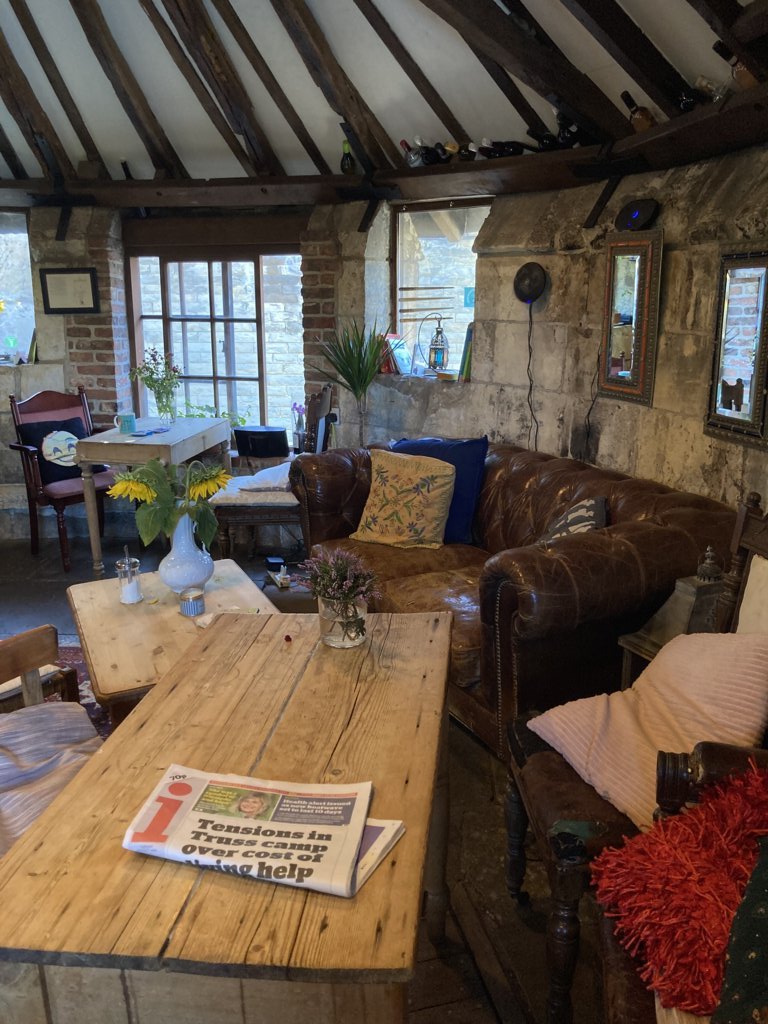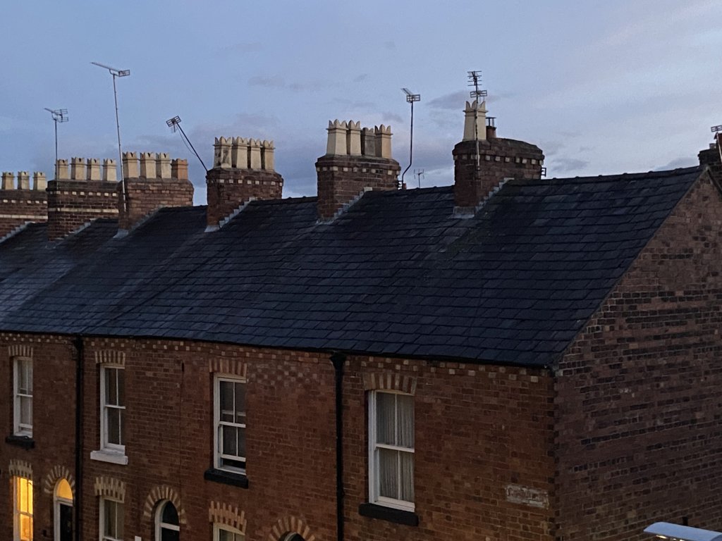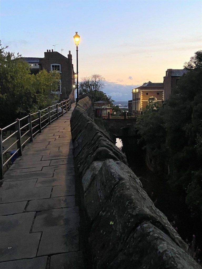 E la seconda osservazione cui non riusciamo drammaticamente ad attribuire senso (anche per la fame) è l’amara scoperta dell’orario di chiusura della cucina dei pub di Chester (alle 19-20) . Dopo affannosa ricerca, quando stiamo per disperare, troviamo un locale che ci offre ospitalità : la Brewery Tap ci offrirà una ottima cena con ottima birra in un bellissimo pub . L’angelo protettore dei viandanti ritardatari, romantici ed incoscienti ci assiste. Ceniamo tra antiche mura , che hanno ospitato re, nell’ altissima sala in cui troneggia un enorme camino in pietra dietro al bancone delle birre. Tutto molto rassicurante. All’uscita ci aspetta un tramonto che illumina tutto di rosa :