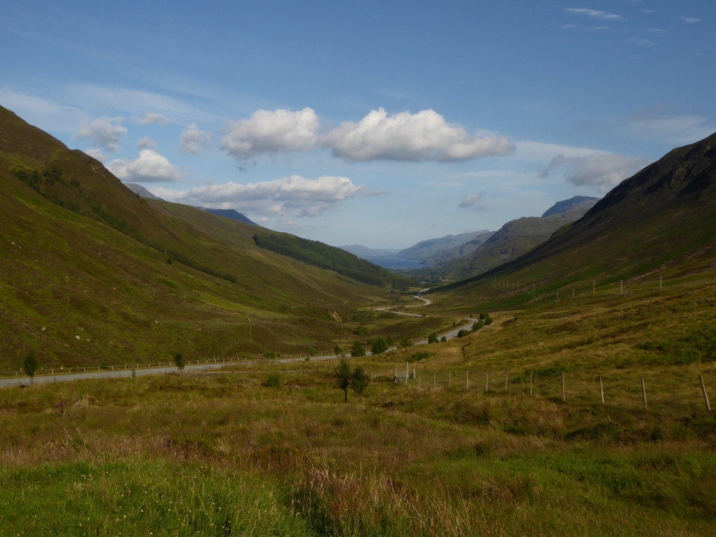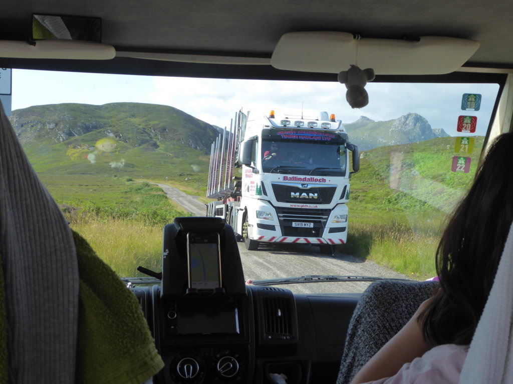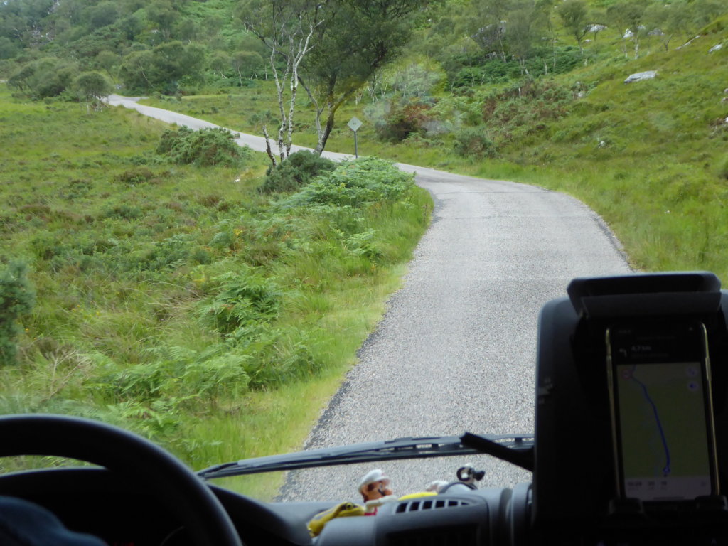 Vorrei fermarmi ogni 5 minuti per fotografare l’incanto che si apre continuamente di fronte ai miei occhi, ma le strette stradine e le rare piazzole di sosta sono implacabili : impossibile fermarsi, se non bloccando completamente il traffico. Le strade sono decisamente strette e anche quelle a doppia corsia richiedono attenzione : attenzione in particolare all’arrivo dei camion, che circolano MOLTO VELOCEMENTE. Noi abbiamo adottato la strategia di tentare di accostare a sinistra appena possibile, dando SEMPRE la precedenza. All’inizio di una piccola galleria situata al centro di una doppia curva arriva un bel camion a tutta velocità e facciamo appena in tempo a frenare e buttarci a sinistra in un angoletto della strada. Iniziamo ad incontrare tratti per ora brevi delle famose one way con i passing place : sono strade con una unica corsia per il transito nelle due direzioni di marcia, con regolari piazzole di sosta dove ci si può fermare per consentire il passaggio di un veicolo proveniente in senso contrario ; sono stradine molto caratteristiche, in mezzo alle montagne, che si arrampicano coraggiose su colline e scendono impavide dalle montagne, con curve continue dettate dalle necessità del territorio, che riescono a stringersi oltre ogni previsione tra muretti ed alti argini. E devo dire che non abbiamo (quasi) mai incontrato alcun problema : i passing place sono frequenti e gli automobilisti molto corretti (attenzione però ai camion : lavorando in queste difficili condizioni generali, corrono il più velocemente possibile, talvolta ‘armati’ di specchietti retrovisori corazzati con gusci di acciaio) . Occorre dire che il territorio è vastissimo, impervio, con inverni rigidi e nevosi, e più ci dirigiamo verso nord più si riduce la presenza umana. La rete stradale serve al passaggio di una popolazione molto limitata : la Scozia occupa un terzo della superficie della Gran Bretagna ed ha 5.300.000 abitanti (8% della popolazione dell’isola), in maggior parte concentrati nelle grandi città (Glasgow ed Edimburgo in testa) ; nella central belt (zona industriale delle due grandi città ) la densità arriva a 700 abitanti per Km quadrato ; in alcune regioni delle Highlands (Terre Alte) ci sono meno di due abitanti per Km quadrato.