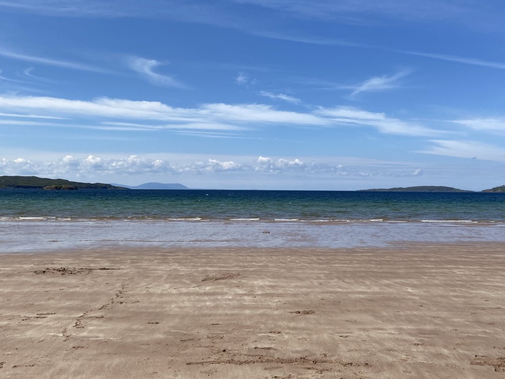 Attraversiamo Lochcarron e – dirigendoci a Kinlokewe – ammiriamo lo splendido panorama del Loch Maree (lock: lago) e del Glen Dockerty (Glen : valle montana profonda e stretta). Facciamo colazione in uno splendido angolino affacciato su una baia sabbiosa del loch Maree – lungo 20 km. – circondata da felci ed erica.