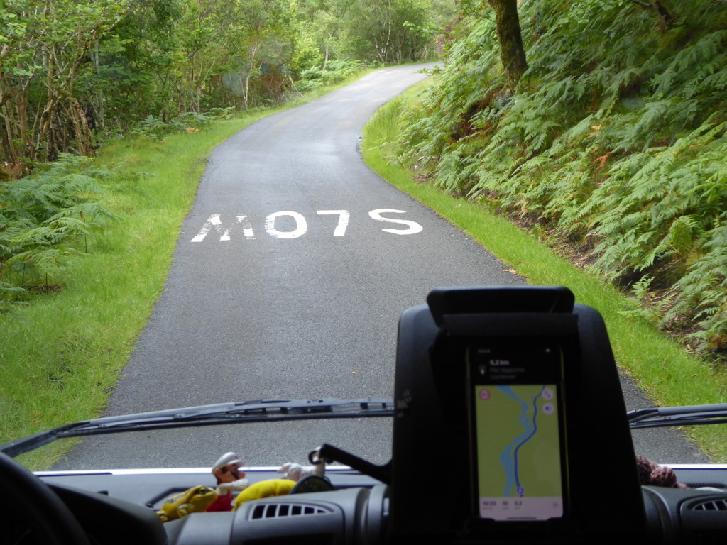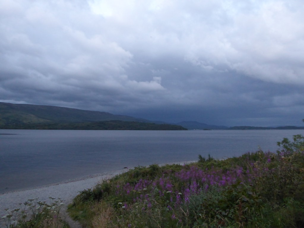 Attraversiamo quindi un ramo del Loch Linnhe e scendiamo verso il Loch Lommond and Trussach Natural Park, che avevamo già attraversato (su un percorso diverso) e la Queen Elizabeth Forest Park : montagne brulle o ricoperte di muschi, altipiani increspati da onde rocciose, geroglifici di acque in movimento o ferme ; le strade sono un po’ piu larghe ma ciò non migliora la situazione per la presenza di molti camion che sfrecciano a tutta velocità facendoci ondeggiare . Approdiamo a Luss, dove il campeggio è pieno e quindi parcheggiamo sotto la strada principale in un bel parcheggio affacciato sul Loch Lomond . Il cielo è sempre nero e minaccioso, il vento forte, il lago tranquillo. Questa sarà l’ultima notte che passeremo nella Scozia selvaggia che ci ha completamente conquistato : da domani visiteremo le due grandi città e torneremo definitivamente alla civiltà. Buonanotte.