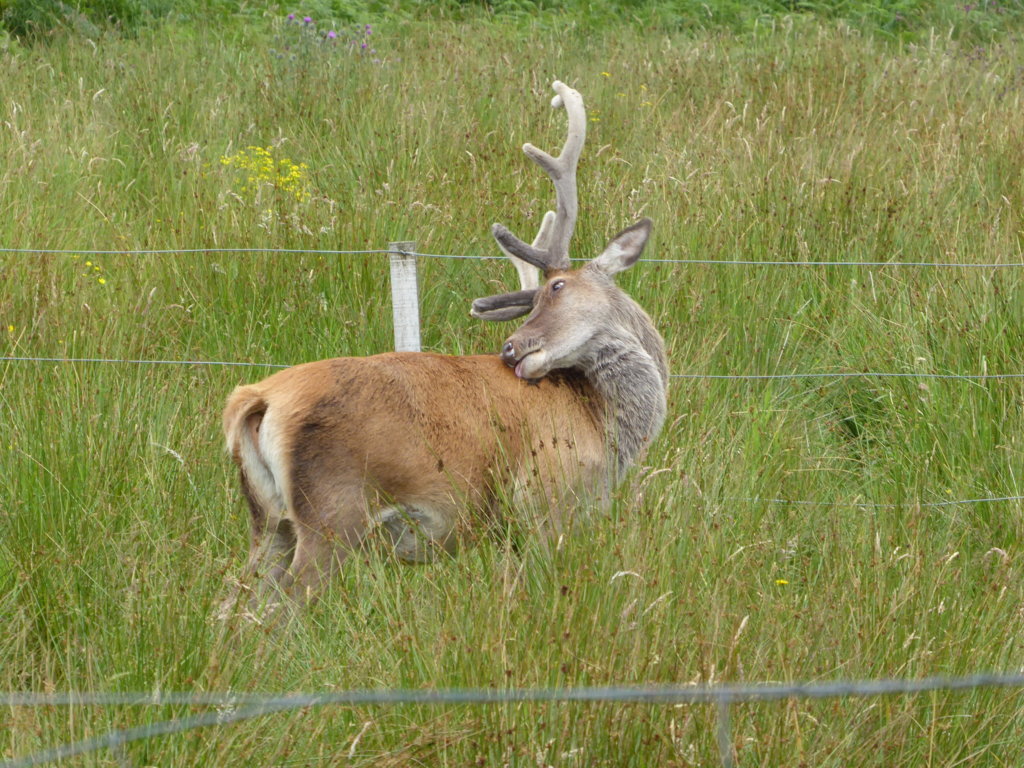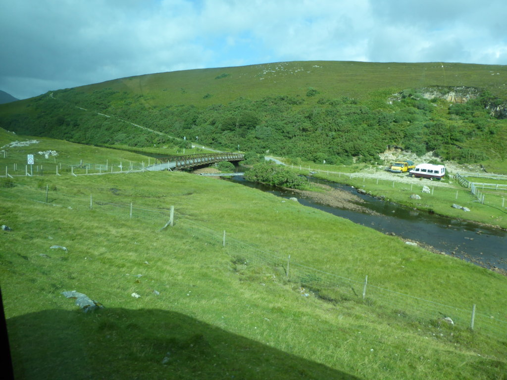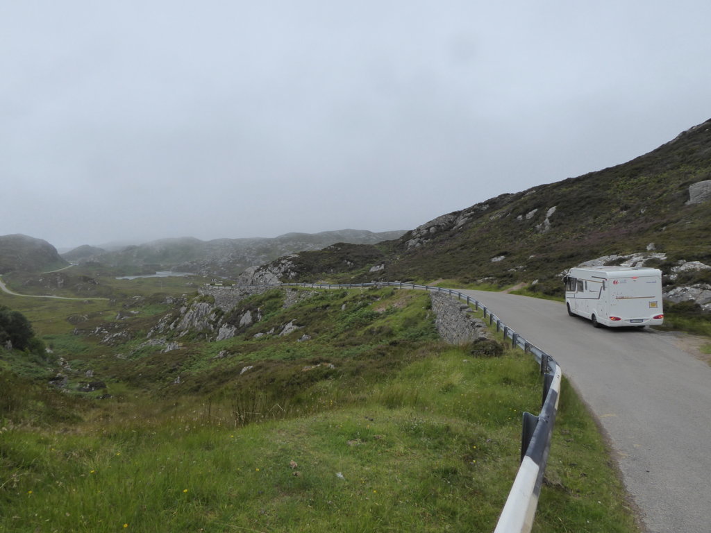 Proseguiamo quindi verso Tongue : costeggiamo i due lati del Loch Eriboll (in realtà un profondo fiordo delimitato da altissime colline che cadono in mare ), per avvistare poi ed infine attraversare un altro fiordo, su un lunghissimo ponte. Approdiamo infine al campeggio di Tongue, accolti da un annoiatissimo impiegato che raccoglie le prenotazioni per la cena da asporto fornite dalla cucina che serve il anche un piccolo albergo. Veniamo anche assaliti da un battaglione affamato di midges succhiasangue : facciamo una lavatrice, in una atmosfera generale un po’ marziana tra persone che girano con le orrende retine verdi in testa e lenzuoli arrotolati addosso a mantello. Vista l’atmosfera generale, decidiamo di rinunciare alla passeggiata serale in paese (distante circa 2 Km., salita all’andata e discesa al ritorno).