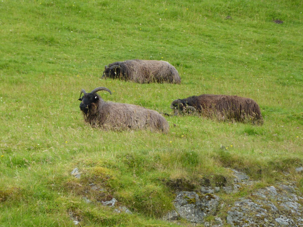 Proseguendo verso nord, sempre sulla litoranea, arriviamo a Cloahtoll, una spiaggia sferzata da un vento gelido che ci costringe a metterci tutte le felpe e giacche in nostro possesso ; l’acqua è azzurra e sembra uscita da un quadro di Turner, la sabbia bianca, le rocce rosse o scure raccontano che è passato un attimo dall’ultima eruzione vulcanica o dall’ultima glaciazione. Scende una pioggerellina fine e battente, che sembra provenire da ogni dove : nonostante ciò qualche ragazza coraggiosa si toglie il piumino e fa il bagno (con la muta). Alcuni cartelli ci avvisano di tenere i cani al guinzaglio e di fare attenzione alle carcasse di uccelli, perché probabilmente colpiti dall’influenza aviaria. Da qui in avanti avvisteremo infatti alcuni resti di gabbiani, ma anche di splendide sule. Contagiati dalla bellezza del posto, facciamo una passeggiata sulla scogliera, oltrepassando i cancelli che separano diversi pascoli e passeggiando su un prato spesso, soffice e imbevuto d’acqua. La pioggia ci costringe a rientrare in camper e riprendere il nostro percorso .