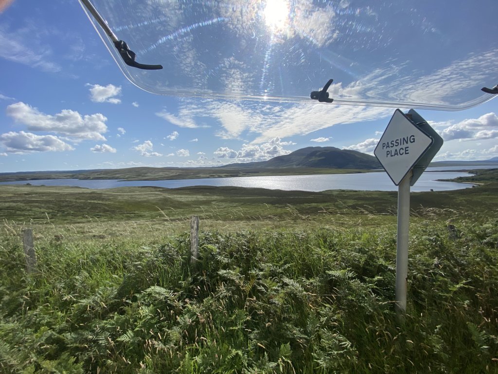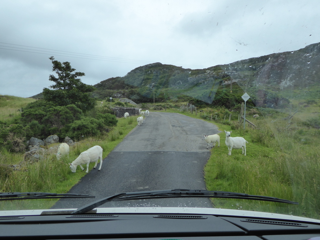 Sabato 30 luglio 2022. Dopo i bagordi serali facciamo una colazione molto leggera e partiamo con l’entusiasmo nelle vene, per affrontare il tratto spesso descritto come il più spettacolare delle Highlands . Il percorso con le strade più difficili , quasi tutte one way strette/strettissime (non idonee per i mezzi superiori a 8 metri) con frequenti passing place (di lunghezza inferiore a 8 metri appunto) : e qui più diventa difficile, più diventa bello … Nonostante il tempo piovigginoso e le nuvole che a tratti -con la bruma- nascondono il paesaggio, non saremo affatto delusi. Le stradine sono molto caratteristiche, e scendono impavide in mezzo alle montagne, si arrampicano coraggiose su colline e scogliere, con curve continue dettate dalle necessità del territorio, e riescono a stringersi tra muretti ed alti argini oltre ogni ragionevole previsione. (prime tre foto da internet). Ci dirigiamo verso Lochinver tenendo la stradina costiera : incontriamo sul nostro percorso centinaia, migliaia (forse milioni) di pecore, che pascolano libere e circolano anche loro sulla North Coast con diritto di precedenza assoluta ( e iniziano a saltellare anche nei verdi prati della nostra immaginazione quando andiamo a dormire) : incontriamo ogni genere di segnalazioni rudimentali che allertano sulla loro presenza. E ci chiediamo in continuazione dove abita chi le accudisce : sono infatti tutte rasate e in salute. Ogni tanto incontriamo una piccola fattoria dalla forte identità : non può che essere scozzese….