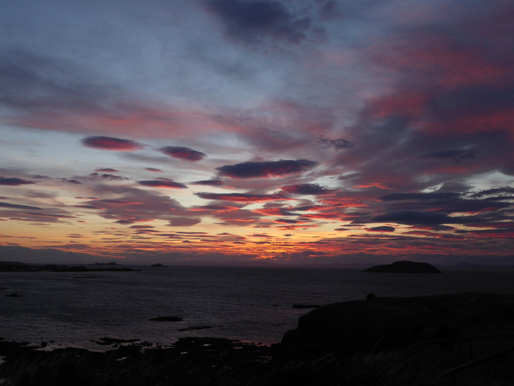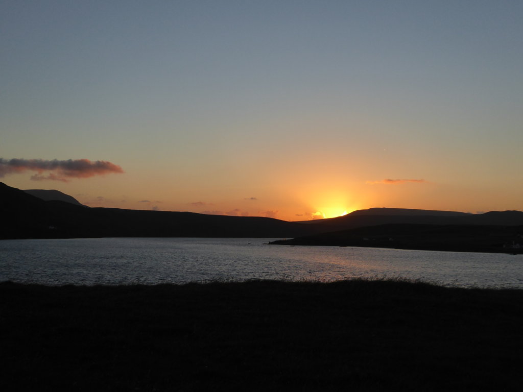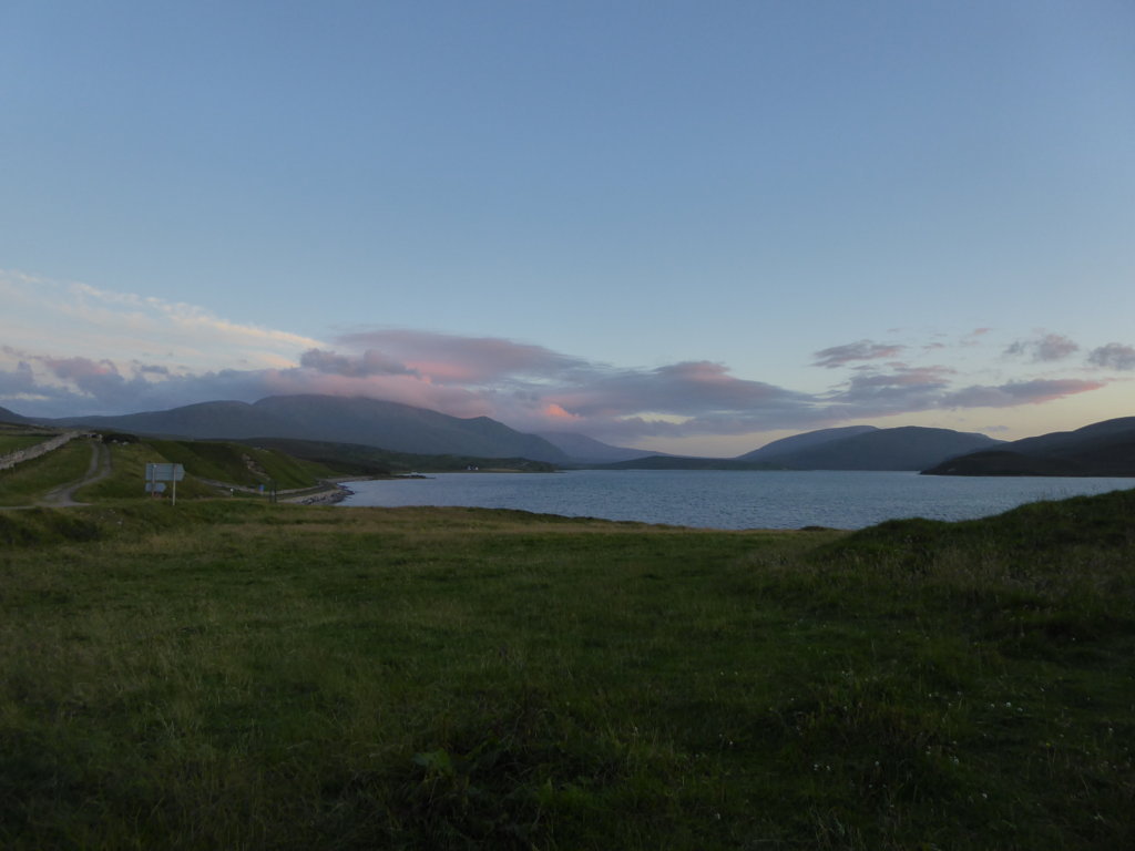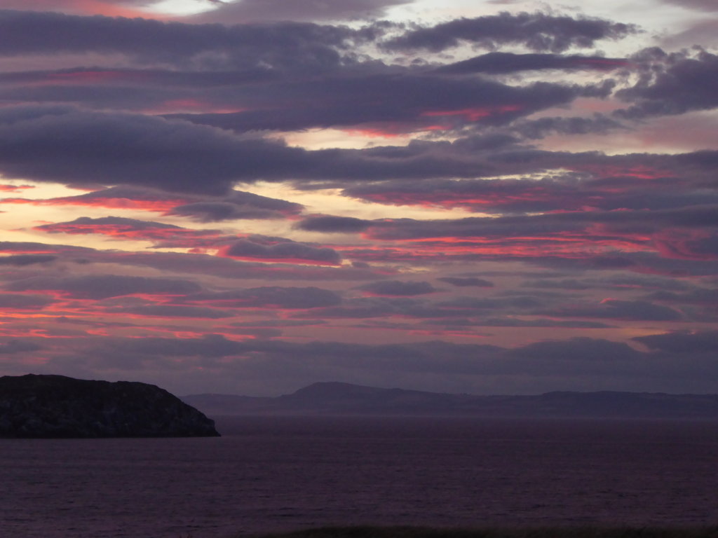 Dopo un incontro molto ravvicinato ed intenso con i midges che – puntuali come ragionieri – escono a godersi gli ultimi raggi di sole e ci costringono ad indossare gli orrendi ma efficaci copricapi verdi in rete fittissima, l’isola per salutarci regala un tramonto veramente impressionante : il cielo e l’acqua brillano di colori intensi : prima giallo dorato, poi rosa sempre più intenso fino al rosso ed infine viola. Per poi scolorire in un’azzurro luminoso e in un blu avvolgente. Rimarrai nei nostri cuori cara isola, ad illuminare i nostri pensieri : grazie e arrivederci ….