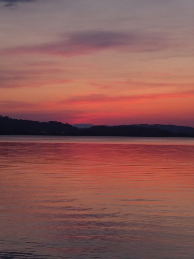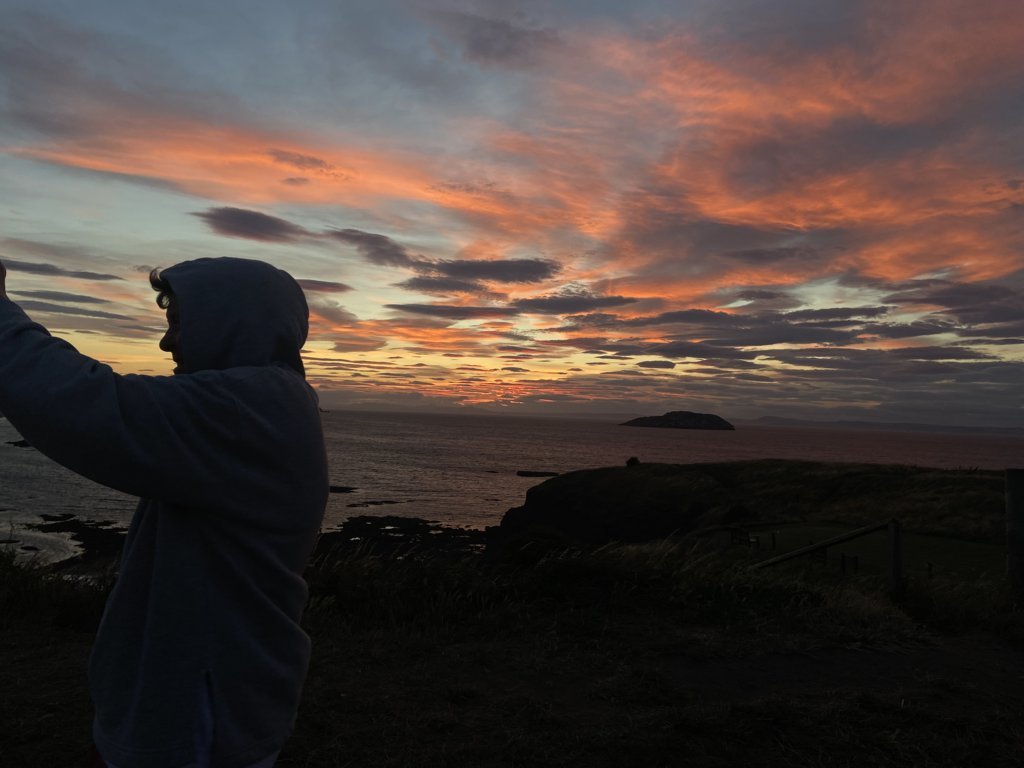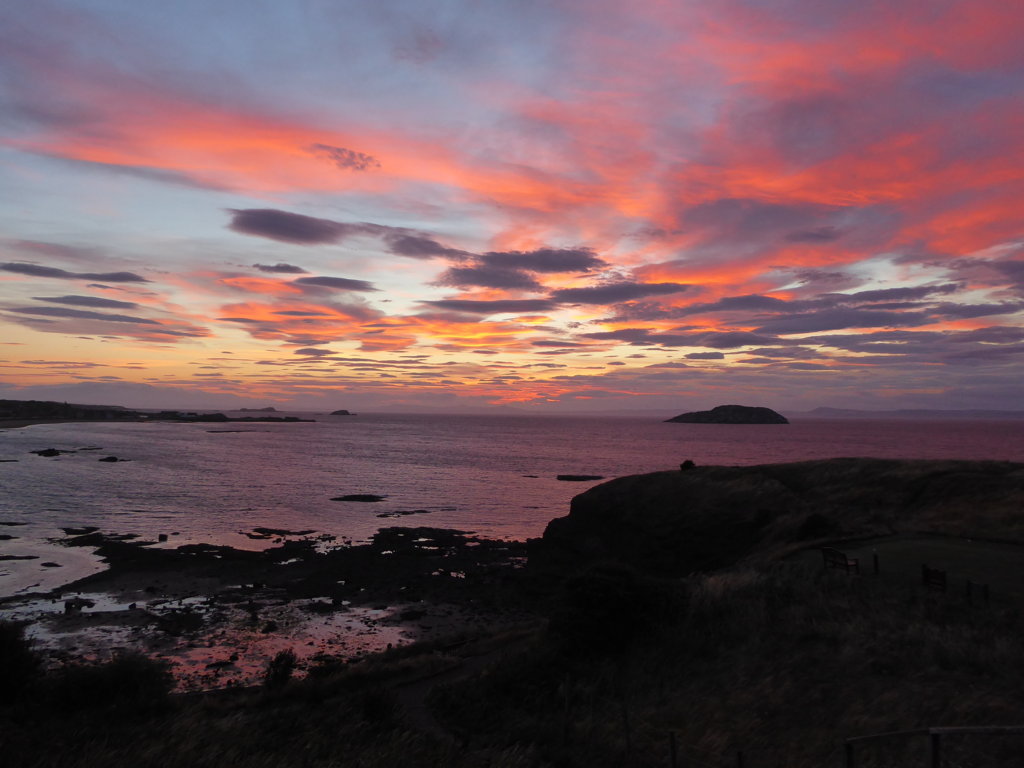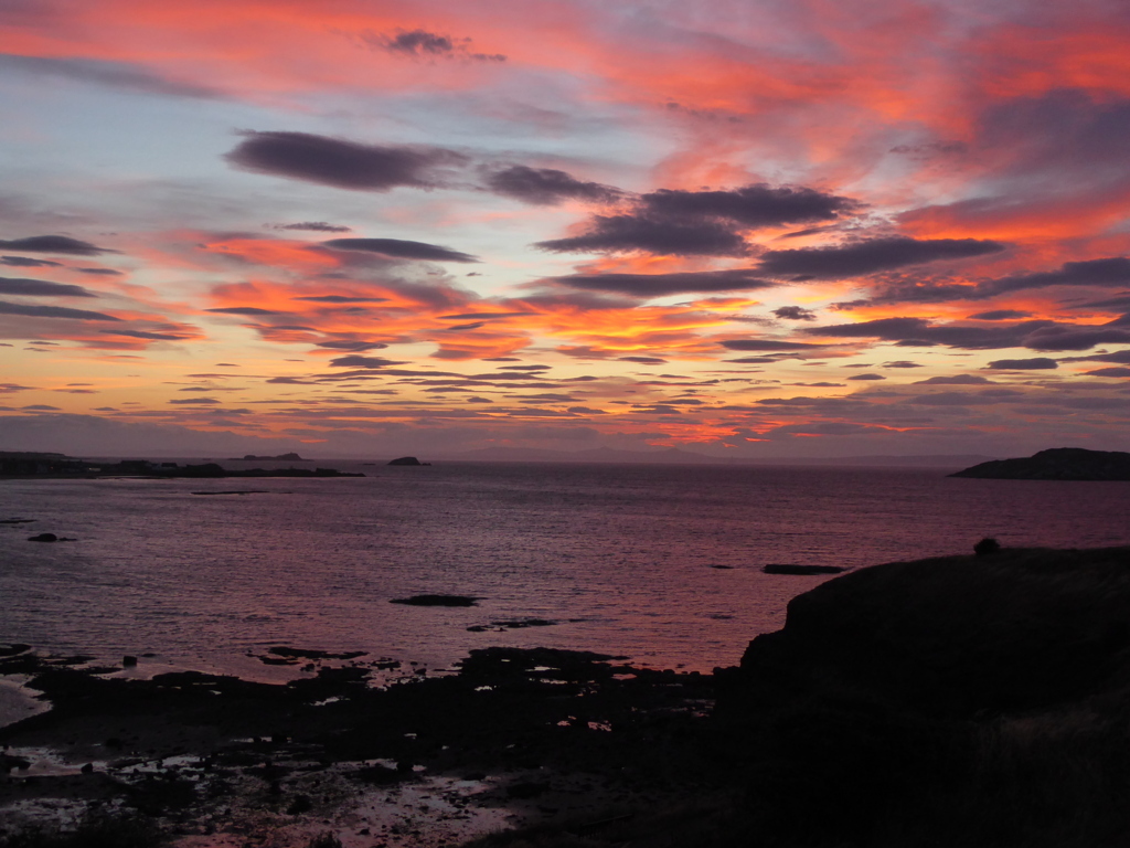 Dopo un incontro molto ravvicinato ed intenso con i midges che – puntuali come ragionieri – escono a godersi gli ultimi raggi di sole e ci costringono ad indossare gli orrendi ma efficaci copricapi verdi in rete fittissima, l’isola per salutarci regala un tramonto veramente impressionante : il cielo e l’acqua brillano di colori intensi : prima giallo dorato, poi rosa sempre più intenso fino al rosso ed infine viola. Per poi scolorire in un’azzurro luminoso e in un blu avvolgente. Rimarrai nei nostri cuori cara isola, ad illuminare i nostri pensieri : grazie e arrivederci ….