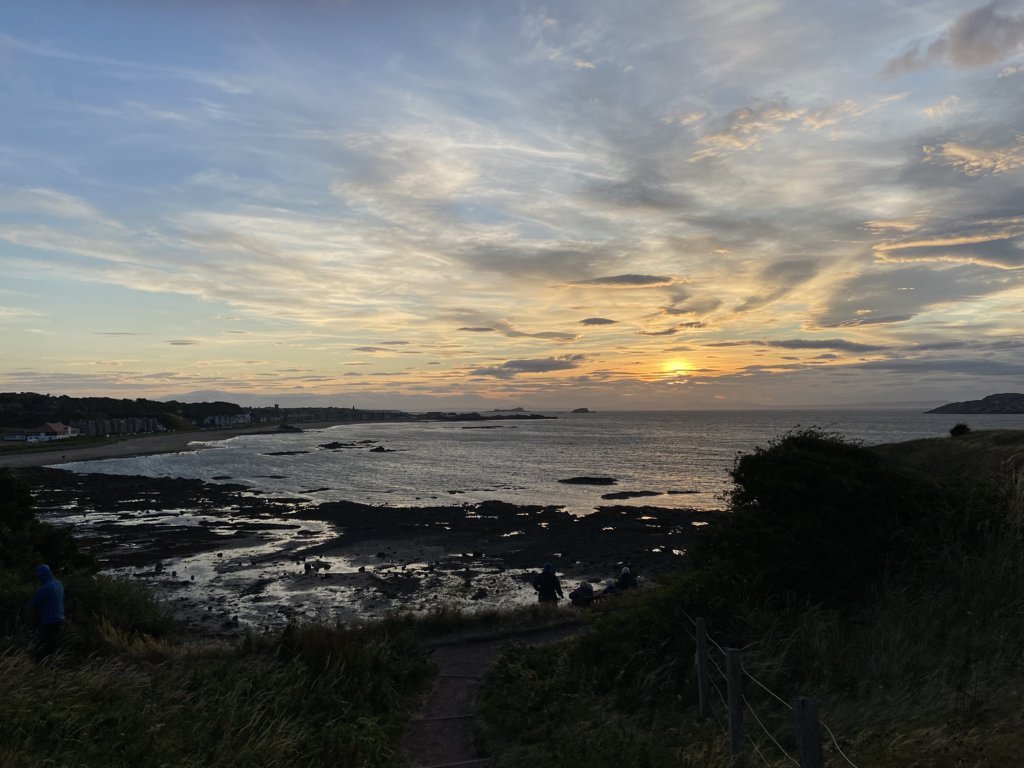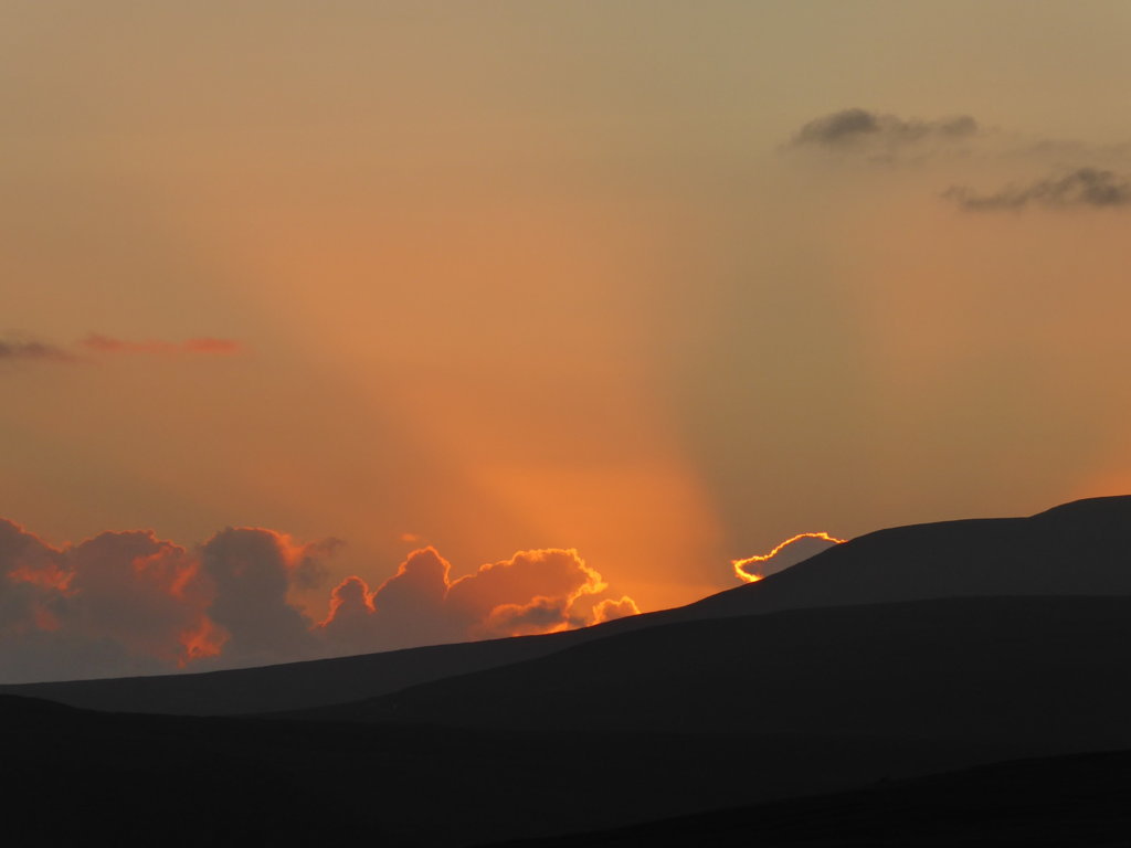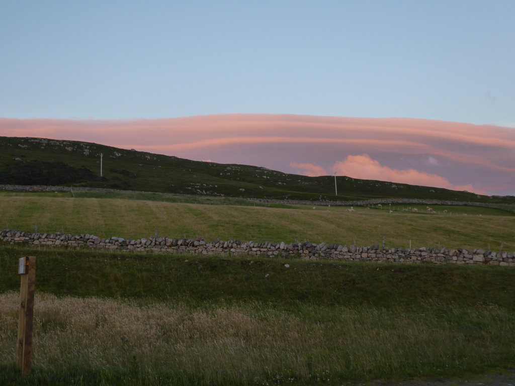 Quando il fiordo è oramai stato completamente riempito dall’acqua che risale dal mare, inizia lo spettacolo del tramonto, con il sole che si tuffa letteralmente dietro Cape Wrath continuando a lanciare raggi luminosi nel cielo, mentre sopra la collina dietro di noi si deposita -come una immensa e soffice coperta- una enorme nube lenticolare che diventa sempre più rosa .