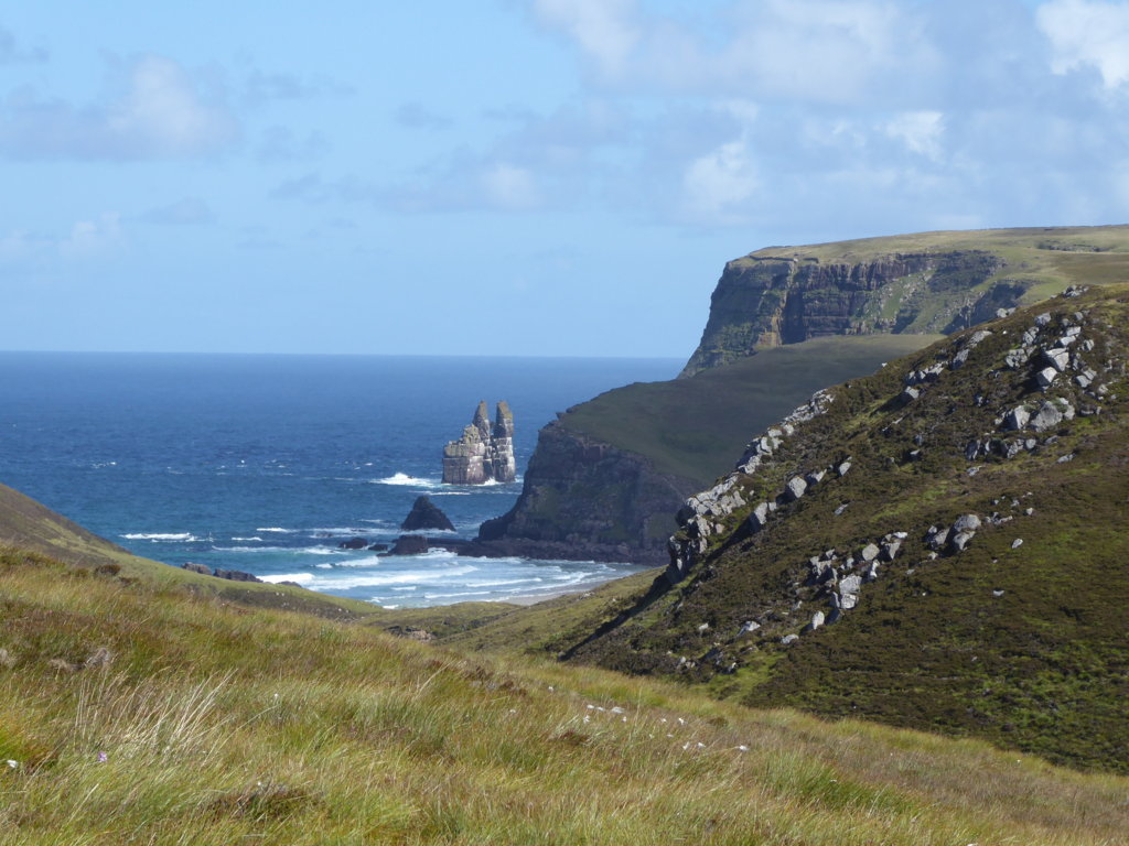 Le rocce sono composte da arenaria torridoniana e gneiss lewisiano : salgono a 281 metri sul livello del mare e includono le scogliere più alte sulla terraferma britannica a Clò Mòr a circa 4 miglia (6 km) a est del promontorio ; vicino alla costa si staccano alcuni faraglioni, come Stac an Dùnain al promontorio stesso e Stac Clò Kearvaig a est noto anche come “La Cattedrale” per l’aspetto di due guglie e una finestra naturale creata dall’erosione , con Duslic una barriera corallina circa 1,0 km a nord. La sua posizione esposta a nord può dare origine ad alcuni livelli di sole invernale eccezionalmente bassi: nel gennaio 1983 ha registrato solo 38 minuti di sole, un minimo storico per la Scozia. Questa posizione esposta, tuttavia, significa anche che il forte gelo è raro rispetto alle località interne. I forti venti possono essere una caratteristica delle condizioni meteorologiche al promontorio, con raffiche di 230 km / h. Le scogliere intorno al promontorio sono un sito di nidificazione di importanza internazionale per oltre 50000 uccelli marini. Il numero di uccelli marini nell’area ha visto un declino significativo all’inizio del 21 ° secolo con il numero di pulcinelle di mare in calo del 50%. La vegetazione in cima alla scogliera in siti come Clò Mòr comprende lo scorbuto comune Cochlearia officinalis , l’erica Calluna vulgaris , il ginepro Juniperus communis e le felci ; sono presenti una vasta gamma di habitat che includono dune di sabbia in cima alla scogliera al promontorio stesso e habitat montani trovati a livello del mare.