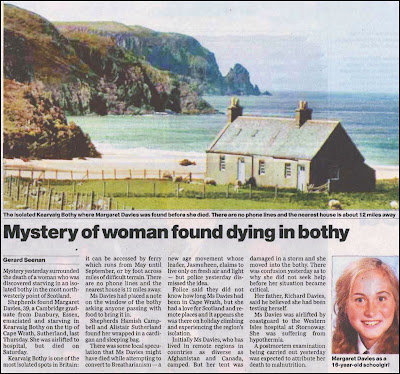 Wednesday 18 December 2002 . The Guardian . All that remains of Margaret Davies’s stay in Kearvaig Bothy is a Woolworths bag stuffed with rubbish – mottled tea bags, Kit Kat wrappers and two empty packs of dried rations. On the windowsill where she left a note begging for food sits a jam jar of dried-out wild flowers in a stagnant inch of liquid. The cinders in the open grate are flaky and insubstantial, suggesting she may have been burning paper and other debris after running out of driftwood collected from the beach that borders this isolated stone cottage. And opposite the fireplace is the low, netted bed base where Davies lay, weakening, until her discovery 13 days ago. She died in hospital two days later. We will never know conclusively what happened to the 39-year-old artist during her final weeks alone on the desolate Cape Wrath peninsula, the north-western tip of the British mainland, which takes its name from the old Norse hvarf, meaning “turning point”. She had told her parents, in Danbury, Essex, that she was not planning to return until after Christmas, and she had left gifts for her nephew and niece. No one from the Sutherland area recalls seeing or speaking to her, and the last evidence of her travels was a bus ticket from Inverness dated September 25. It is believed that she was walking the Cape Wrath trail, an intensive two-week hike north from Fort William, and had camped out before retreating to the bothy. When the local constabulary removed the tent which she had pitched in a sheltered nook closer to the sands, they estimated that the heather beneath had been dead for three weeks. A handwritten manuscript found beside her remains in police custody. Her mother Wendy believes that Davies, a prolific writer and painter, was working on a treatise on the nature of solitude, and had come to Cape Wrath to experience the intensity of isolation. But it is perplexing that the Cambridge-educated geographer and experienced traveller, who had trekked alone through Afghanistan, Nepal and the Ukon, should apparently fail to bring sufficient food and heating supplies. Notes found on the window of the bothy and by the bed begged passers-by to bring food. Although the authorities last week confirmed that they had found no suspicious circumstances surrounding Davies’s death, and dismissed press speculation that she had been a follower of Breatharianism, the Australian cult which advocates subsistence on fresh air and light, her passing remains a mystery. “I’ve no idea what happened to her,” says Hamish Campbell, one of the shepherds who found Davies. “She had left that note on the windowsill and there were others by the bed. But usually people bring more supplies than they need. She said she was thirsty but there was water right by her. [The bothy is bounded by two freshwater burns].” It was six months since Campbell had last visited Kearvaig beach. There are no working crofts on the peninsula, which is used as a naval gunnery range by the Ministry of Defence, although farms around Durness, the nearest village, continue to graze some livestock there. On December 5, Campbell was bringing the remaining sheep in for the winter, following the rocks along from the lighthouse to the west, while his colleague Alistair Sutherland worked his flock towards the open beach from the east. They brought the animals together around midday. “It was lovely weather and we discussed whether to have our sandwiches outside. But the bothy door was ajar, which is unusual because normally the people who use it are careful to keep it secure. We went in and there she was, lying on the makeshift bed. I didn’t know if she was alive or dead, but then I saw her throat moving and I put my hand on her. She was terribly anaemic and emaciated. She moaned and raised her arm.” While Sutherland started the three-mile run towards the lighthouse for assistance, Campbell lit a fire with some old newspapers and attempted to comfort the semi-conscious woman. “She couldn’t speak. I told her that Alistair had gone for help but I think she was beyond understanding.” Davies died two days later, after being airlifted by coastguard helicopter to the Western Isles Hospital in Stornoway. A postmortem examination last week confirmed that she had died from hypothermia. A traveller in search of isolation will find it at Kearvaig in December. The bothy is set above the shoreline of a wide, pristine beach, where the breakers unfurl on the north Atlantic tide. To the east, the land sweeps up to the Clo Mor cliffs. To the west, the hillside is scarred by the annual heather burning, the colours blending from charred brown through pale gold and russet and back to green. It is terribly beautiful. The three-room cottage is maintained by the Mountain Bothies Association, and provides shelter for the trekkers and birdwatchers who come to Cape Wrath during the summer season. But from September onwards, as the weather conditions grow increasingly savage, the ferry stops running across the Kyle of Durness, the inlet which separates the peninsula from the village. Temperatures regularly dip below freezing. There is no mobile network coverage on the Cape, and the only telephones are those contained in the well-secured MoD guard huts. The nearest house is seven miles away, but lies empty during the winter months. From the bothy, it would have taken more than a day’s hike over rough terrain to reach habitation. But all roads eventually lead to somewhere. How did Davies end up with neither time nor physical strength to walk towards help? It was coastguard John Ure who met Sutherland as he made his way to the lighthouse that morning. He remains quietly confounded by the coincidence – it can be weeks between cars passing on that road, he says. “There was a bug going round up here a few weeks ago, and if you had that you wouldn’t be going far. She must have caught it and things deteriorated from there. I think she just go