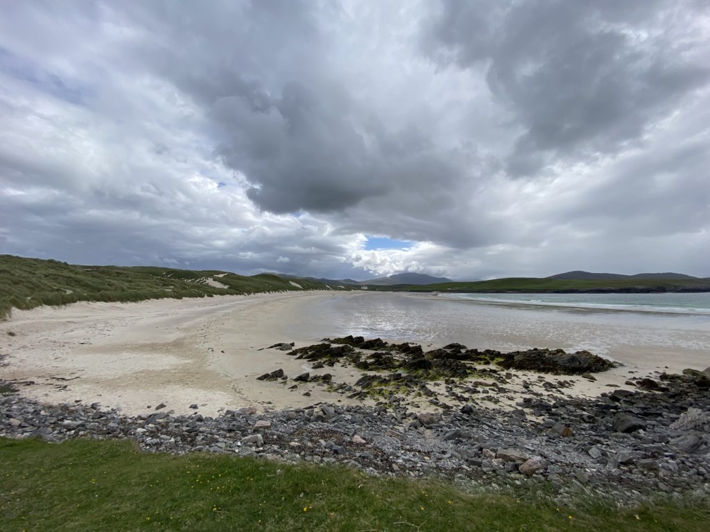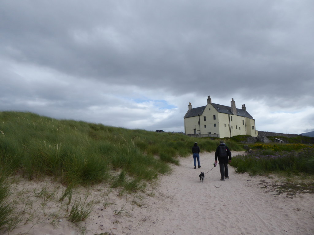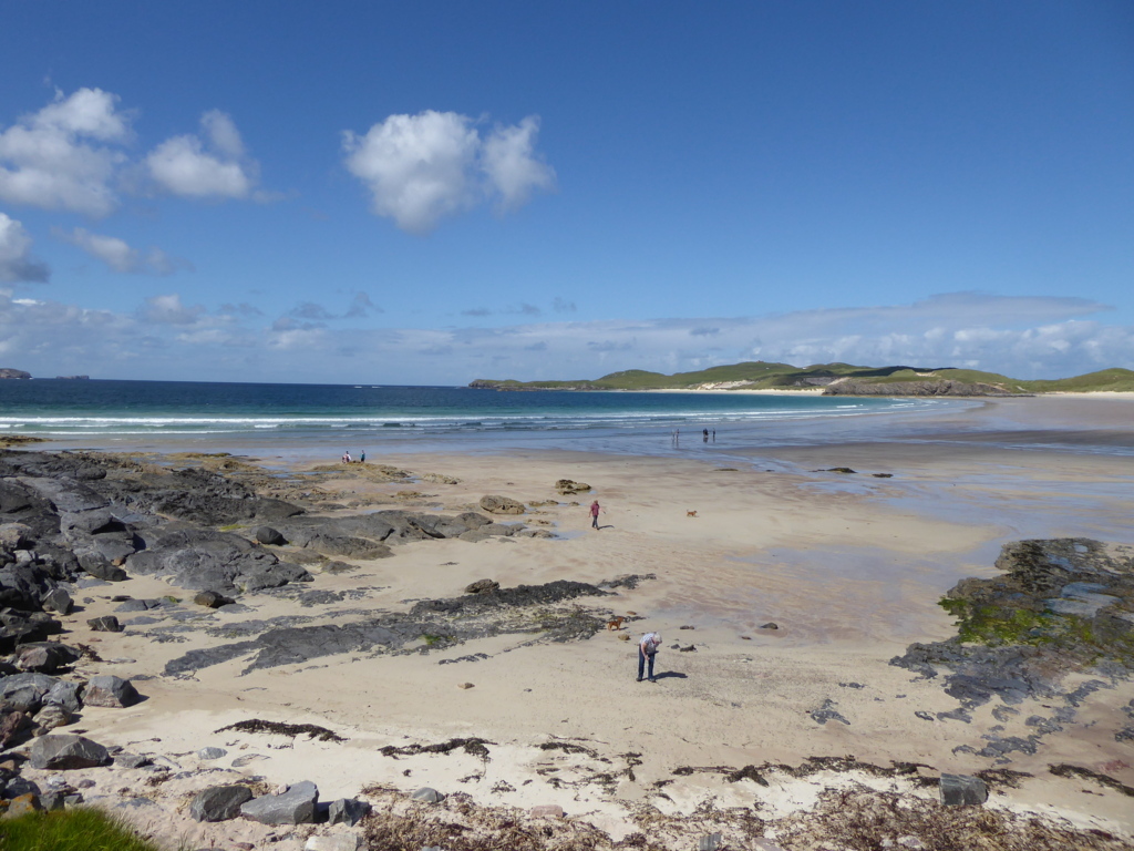 Arriviamo a Keoldale, località (non possiamo dire villaggio, perché sono presenti solo un piccolo parcheggio, una spiaggia, un albergo, un molo dal quale parte un barcone per escursioni a Cape Wrath) posta all’inizio del promontorio costellato da spiagge di sabbia bianca affacciate su un mare che ha tutti gli azzurri e i blu del mondo ed appoggiate su alte dune sabbiose ricoperte di vegetazione. Decidiamo di fermarci per la notte e ammiriamo la risalita della marea che riempie rapidamente i chilometri e chilometri del fiordo. Passeggiamo nella spiaggia dove avvistiamo una beccaccia di mare ed un piccolo spioncello marino e arriviamo al piccolo molo dove partono i barconi per traghettare il fiordo e fare escursioni guidate a Cape Wrath. Lo sperone roccioso che delimita l’altro lato del fiordo è un’area di esercitazioni militari : un cartello ci informa che domani non sono previste attività di bombardamento, per cui decidiamo di fare l’escursione .