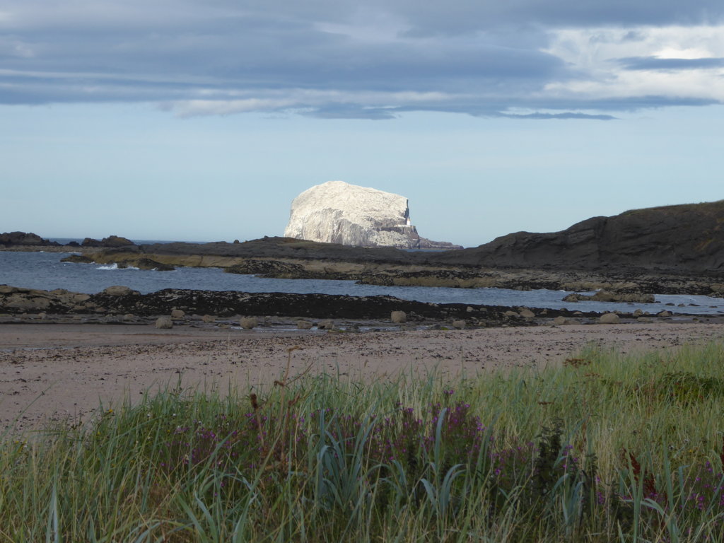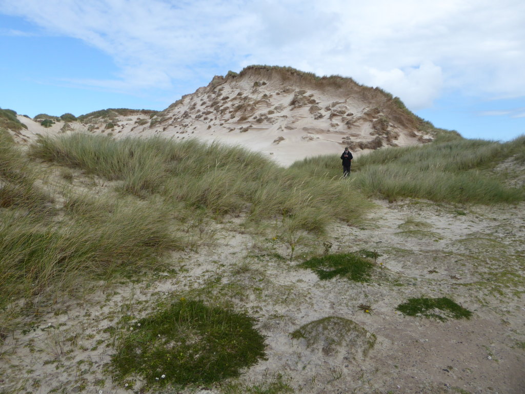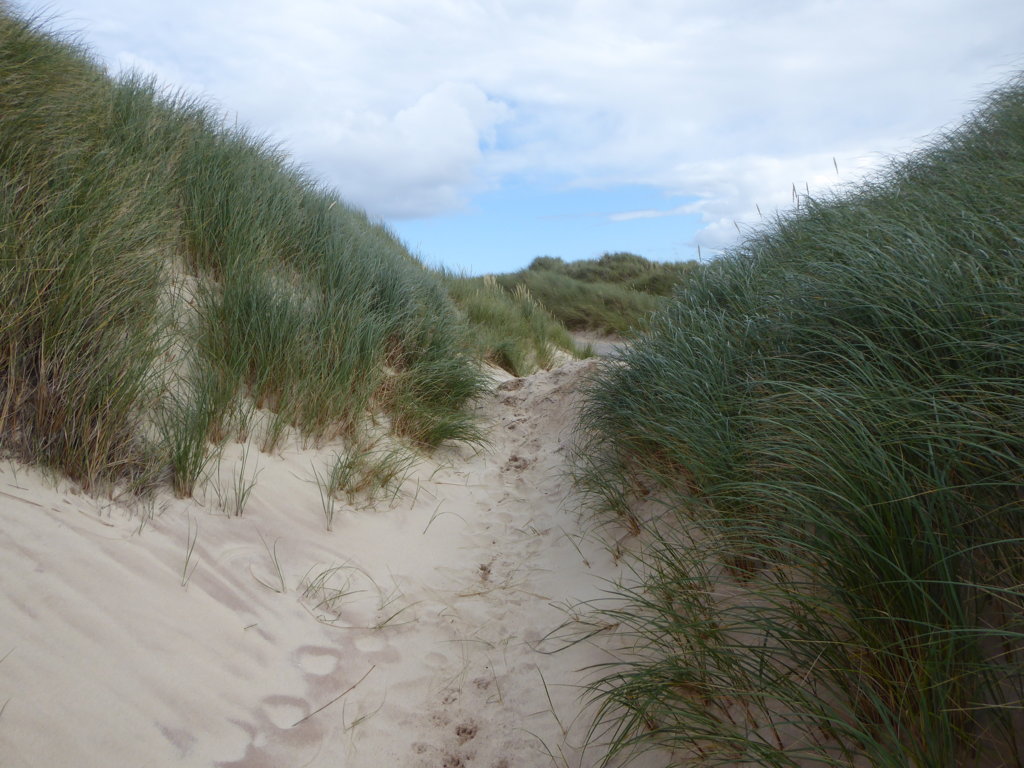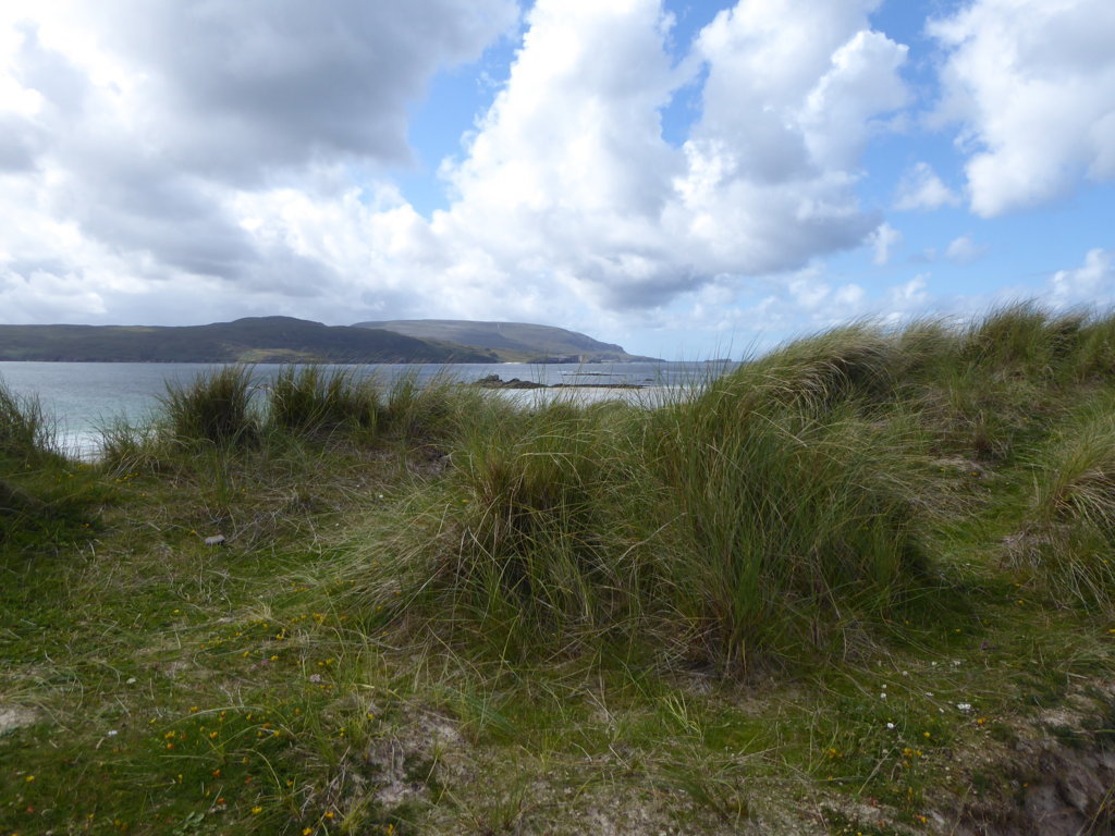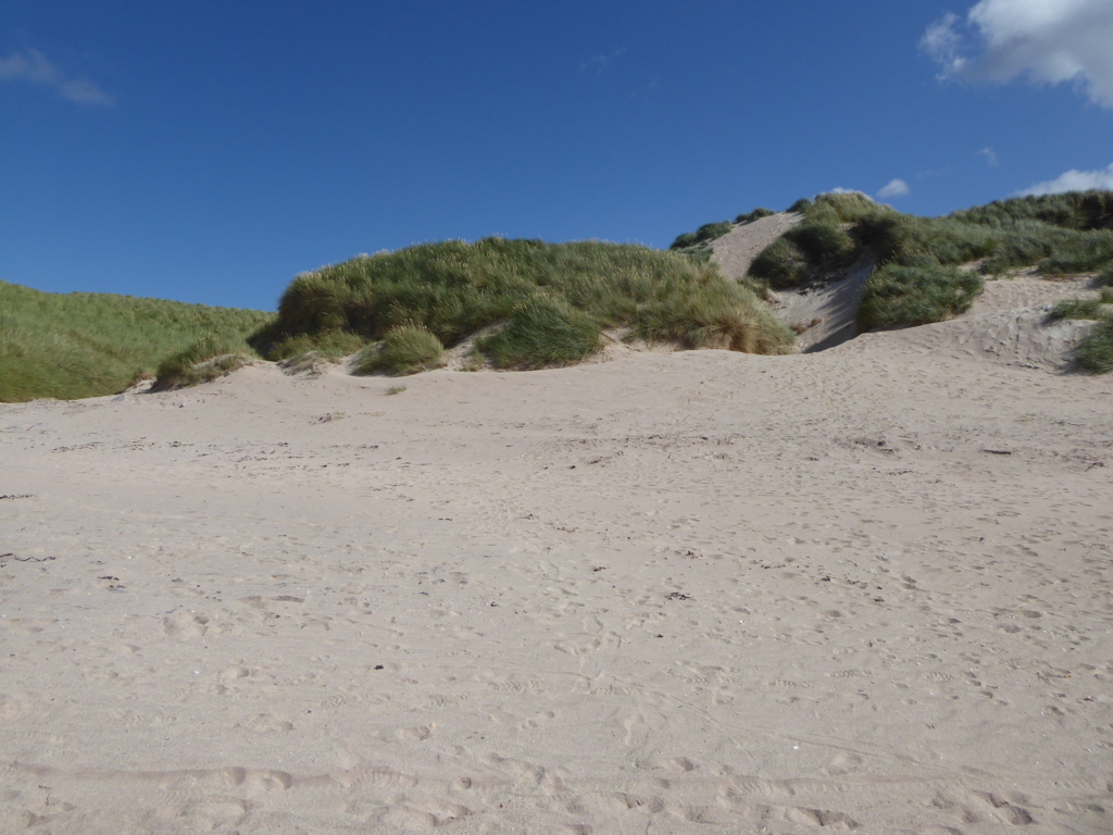 Ci dirigiamo poi con decisione a Faraid Head dove pranziamo molto velocemente per fare una delle più belle passeggiate di questa vacanza (10 Km.) : lungo l’enorme spiaggia (impieghiamo mezz’ora per percorrerla tutta sotto un cielo azzurrissimo dove corrono veloci nuvole bianche) e attraverso le imponenti dune di sabbia (alte oltre 20 metri) che nascondono altre spiagge bianchissime, con l’acqua azzurra e cristallina. Queste dune si sono formate grazie all’azione del fortissimo vento, che ha prelevato la sabbia dal fiordo di Durness (scavandolo) , trasportandola sopra il mare, e depositandola nella lunga striscia che ha lentamente formato il promontorio di Faraid. Un grandioso gioco di creazione …. Le altissime dune sono ancora sabbiose sul lato verticale affacciato al mare, dove soffia ancora un fortissimo vento, mentre digradano più dolcemente sul lato opposto, coperto di vegetazione. La sabbia delle spiagge – bianchissima – è formata da frammenti di conchiglie che si sono frammentati da 4000 anni fa e continuano ancora oggi … prendo un pugno di sabbia e la lascio cadere lentamente nel vento : pensando che mi stanno rotolando in mano conchiglie di 4000 anni… E non vorrei più andare via da questo incanto. Unica nota triste : le tre bellissime sule morte che incontriamo in spiaggia (influenza aviaria ?) . E invece torniamo al camper sotto un cielo che diventa sempre più grigio ; invidio i conigli che abitano a migliaia le dune sabbiose, dove hanno costruito favolose gallerie e che ci osservano attenti sulle loro verande, pronti a nascondersi se necessario .