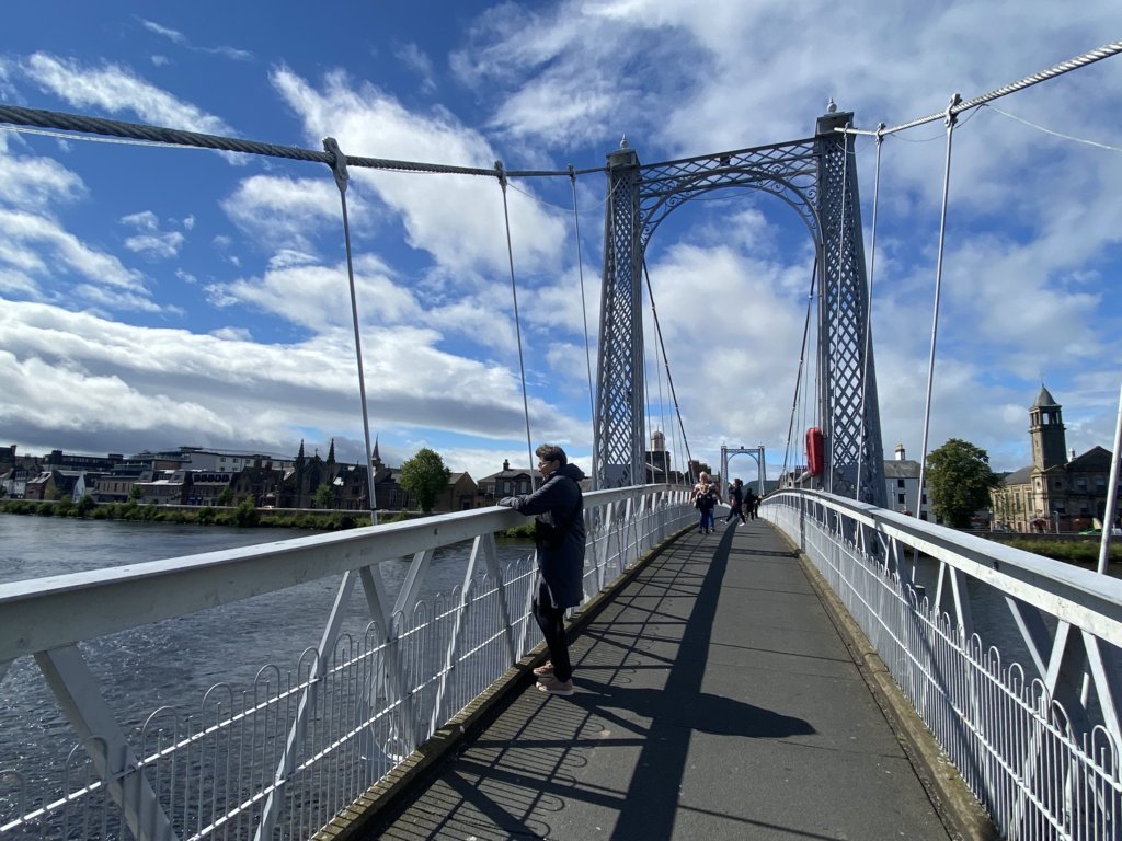 Martedì 2 agosto 2022 . Colazione veloce con ritorno in centro città per visita di una gioielleria vintage del Viktorian Market, dove ammiriamo alcuni bellissimi gioielli liberty del primo novecento, e dove la Jessica (in altro settore più economico) trova alcuni regalini molto originali . Visitiamo poi un altro negozio del quilt (che vedremo declinato in ogni possibile versione ed utilizzo, anche tra i più bizzarri ) , deludente rispetto a quello di ieri dove una sorridente nonnina faceva gli onori di casa ringraziando per la visita, e ci aveva accolti con una grazia e gentilezza di altri tempi. Dopo aver visitato la Albertarff House (1593), la casa integra più antica di Inverness, e aver attraversato per ben due volte il Woobly Bridge ( letteralmente ponte debole, traballante : e garantisco che non delude le aspettative ), approdiamo al favoloso Mustard Seed, ristorantino che ci offre una splendida visuale sul Ness ed un indimenticabile pranzo : tartare di aringa, spigola in padella accompagnata da una insalatina fredda di patate, cipolline e limone, biscottini al burro che sono così buoni da essere commoventi . Premiato nel 2019 come Best Everiday Dining del Regno Unito .