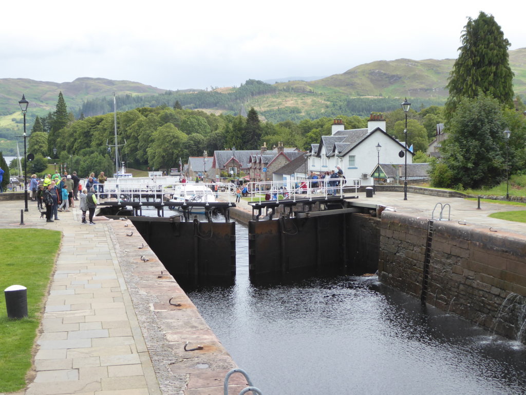 Arriviamo a Fort Augustus dove ci fermiamo in un parcheggio dove incontriamo un segnale di pericolo che ancora non avevamo visto. Facciamo una passeggiata a fianco ed attraversando le 11 chiuse monumentali lungo il Caledonian Canal : consentono alle barche in transito di salire (o scendere) dal livello del lago a quello del canale ( importante via di navigazione che conduce al Loch Oich, e a seguire al Loch Lochy ed infine -attraverso il fiordo di Lorn- al Mare interno della costa occidentale scozzese e quindi al bacino del nordest atlantico).