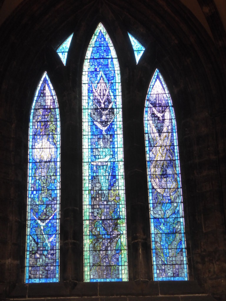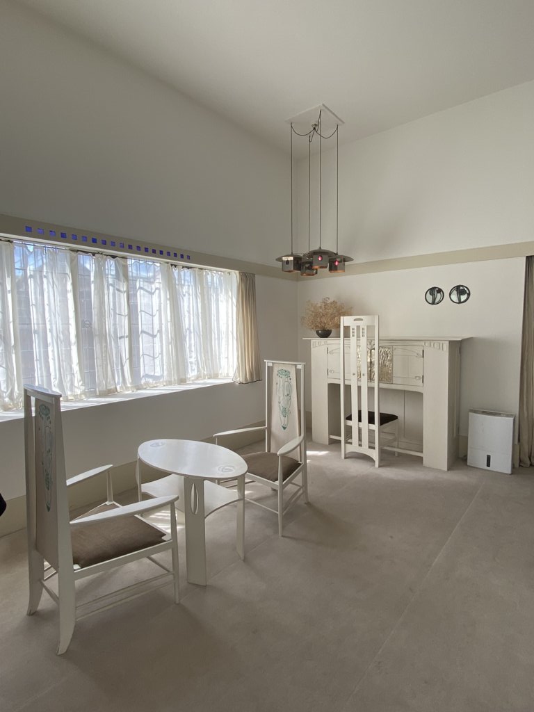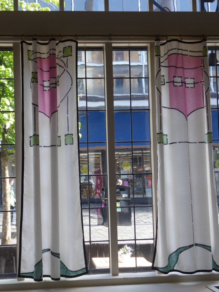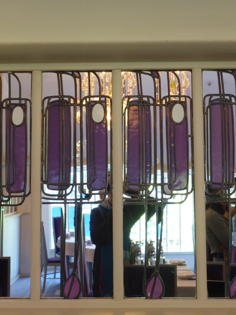 Di fronte alla Università c’è la seconda meta della nostra giornata : la Hunterian Gallery, che visitiamo, soprattutto per entrare nella Mackintosh House dove ha espresso al massimo livello il suo genio creativo. La casa è stata completamente ricostruita in una struttura di cemento (che sporge esternamente dal volume del museo, con due bowindow estranei alla restante volumetria geometrica) , dove sono stati inseriti gli arredi originali ; dall’esterno è possibile osservare anche la porta di ingresso. La linearità e semplicità apparenti nascondono una poesia, un’anima silenziosa ma percepibile e attraente. Ogni sedia ed ogni poltroncina sempre diverse ma coerenti, ogni intaglio illuminato da un vetrino colorato, tutto irrompe da uno spazio bianco luminoso, ed ogni cosa parla lo stesso linguaggio. Io e la Jessica siamo completamente rapite.