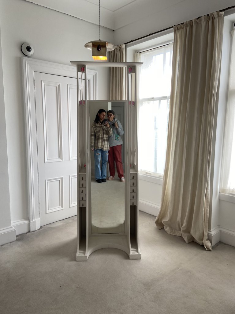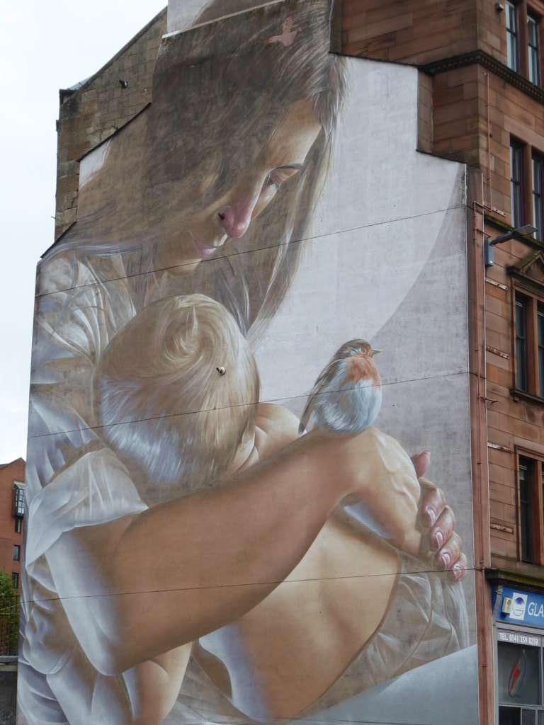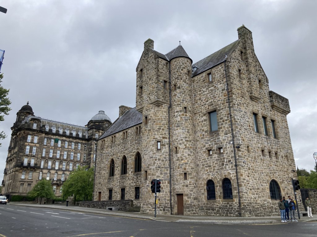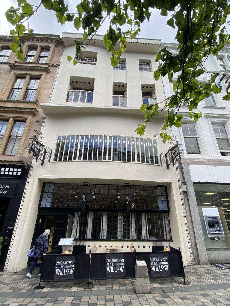 Di fronte alla Università c’è la seconda meta della nostra giornata : la Hunterian Gallery, che visitiamo, soprattutto per entrare nella Mackintosh House dove ha espresso al massimo livello il suo genio creativo. La casa è stata completamente ricostruita in una struttura di cemento (che sporge esternamente dal volume del museo, con due bowindow estranei alla restante volumetria geometrica) , dove sono stati inseriti gli arredi originali ; dall’esterno è possibile osservare anche la porta di ingresso. La linearità e semplicità apparenti nascondono una poesia, un’anima silenziosa ma percepibile e attraente. Ogni sedia ed ogni poltroncina sempre diverse ma coerenti, ogni intaglio illuminato da un vetrino colorato, tutto irrompe da uno spazio bianco luminoso, ed ogni cosa parla lo stesso linguaggio. Io e la Jessica siamo completamente rapite.
