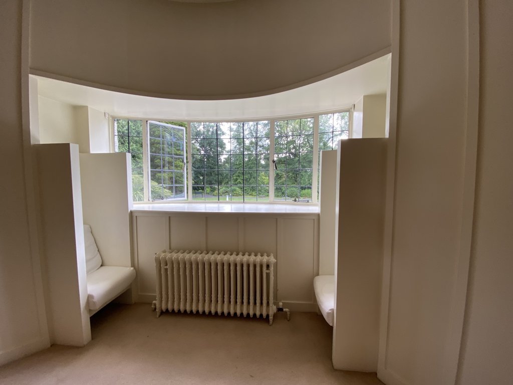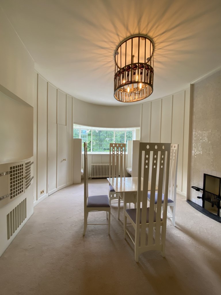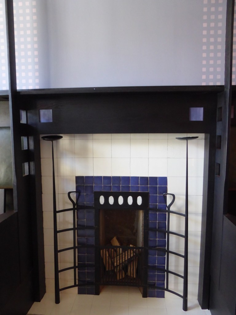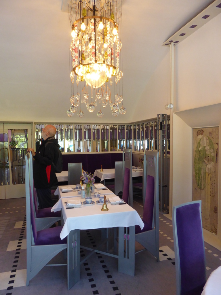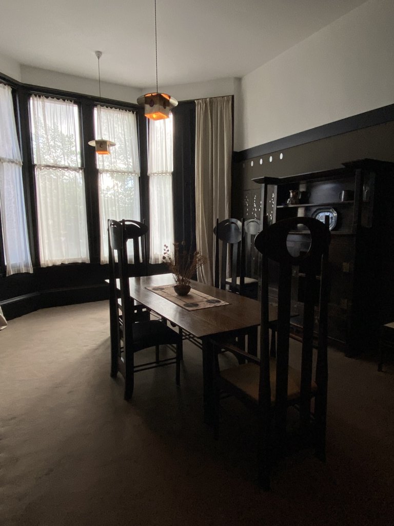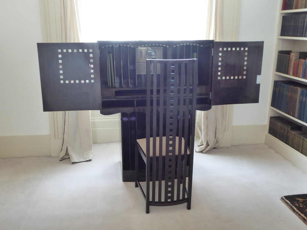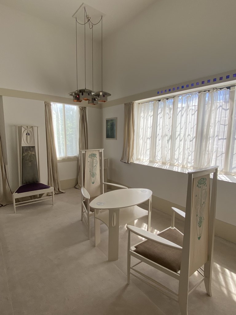 Attraversiamo il quartiere adiacente all’università, molto elegante, con bellissime abitazioni, bowindows dove vorresti sedere a leggere un libro sulle belle poltroncine illuminate dal sole tra le piante verdi, giardini delicatamente fioriti…. Arriviamo alla stazione della metropolitana (che a Glasgow ha solo due linee che corrono vicine, una in senso contrario all’altra ; il sistema di chiusura delle porte non è automatizzato nel senso che è l’autista che si affaccia dal finestrino e chiude le porte quando tutti sono saliti ) e corriamo nel Southside, il quartiere a sud del fiume Clyde, dove all’interno dell’Art Park nel 1989 è stata costruita la House for an Art Lover, seguendo il progetto originale di Mackintosh del 1901. L’edificio ha l’intento di stimolare l’interesse per l’arte, il design e l’architettura : vi si organizzano anche eventi pubblici o privati. Il corridoio monumentale è scuro, con nicchie che fiancheggiano le finestre per conversazioni private ; vediamo poi la Oval Room sala destinata al riposo delle signore (Mackintosh ritiene che chiacchiere, relax e concentrazione necessitino di spazi diversi per uomini – spazi scuri – e donne – spazi bianchi e pieni di luce ) : infatti la stanza è bianca, e tutto segue le sue linee ovali e morbide, con due nicchie ai lati di una enorme finestra illuminata dal sole ; arriviamo poi alla Music Room, una enorme sala destinata a feste, con enormi porte finestre convesse illuminate dal sole e una bellissima balconata dalla quale ammirare lo splendido giardino , che con i suoi elementi stilizzati vuole ricordare una radura tra gli alberi , con il pianoforte contenuto in un grande letto a baldacchino ; si finisce poi con la Dining Room di nuovo scura . Tutto molto bello, ma un po’ impersonale e “da cerimonia”, poco famigliare: gli spazi così dilatati tolgono (o sono in contraddizione) con l’ intimità e la semplicità (del tutto apparente) che è uno dei caratteri che amo di più in questo architetto …