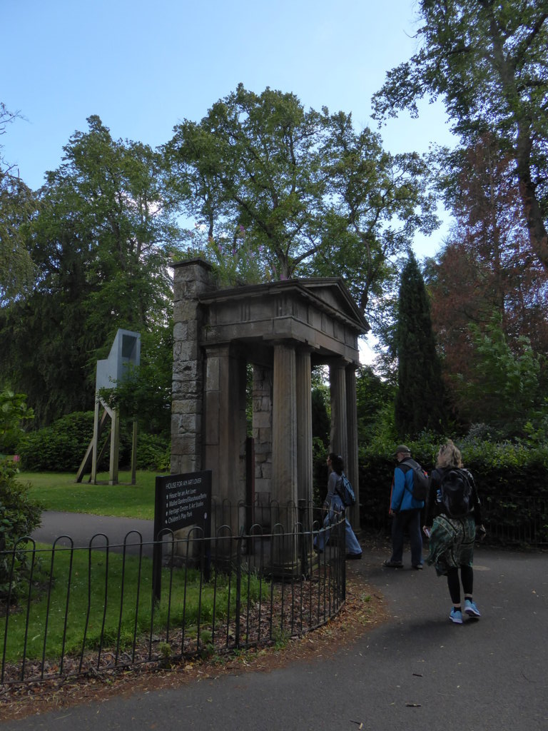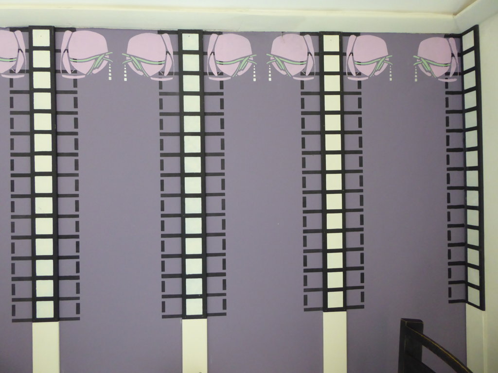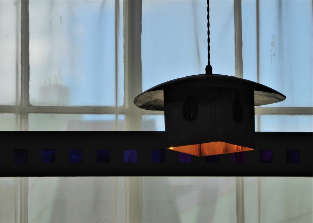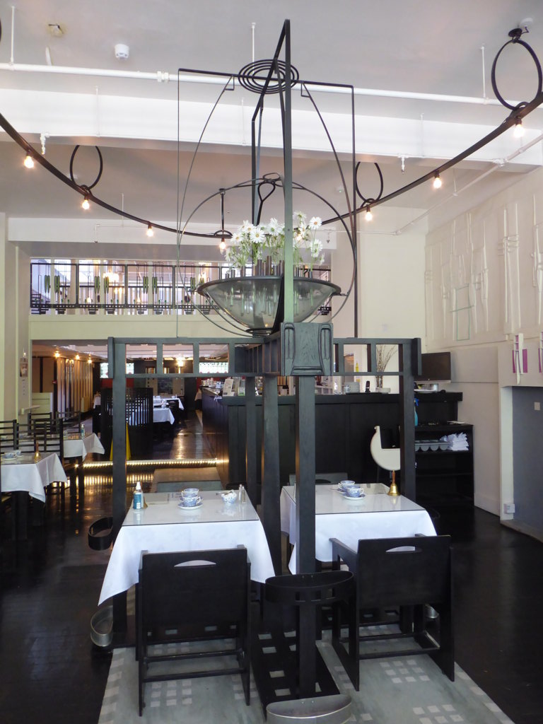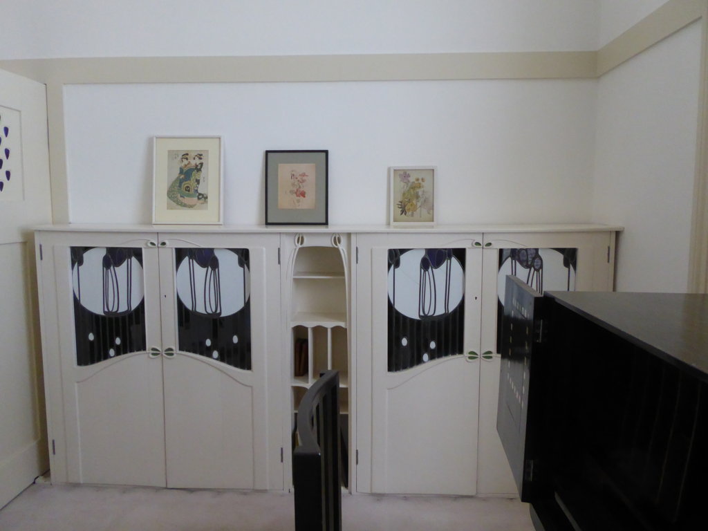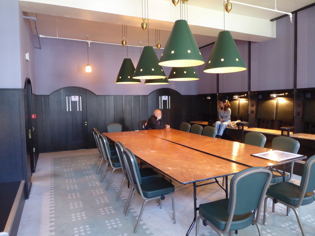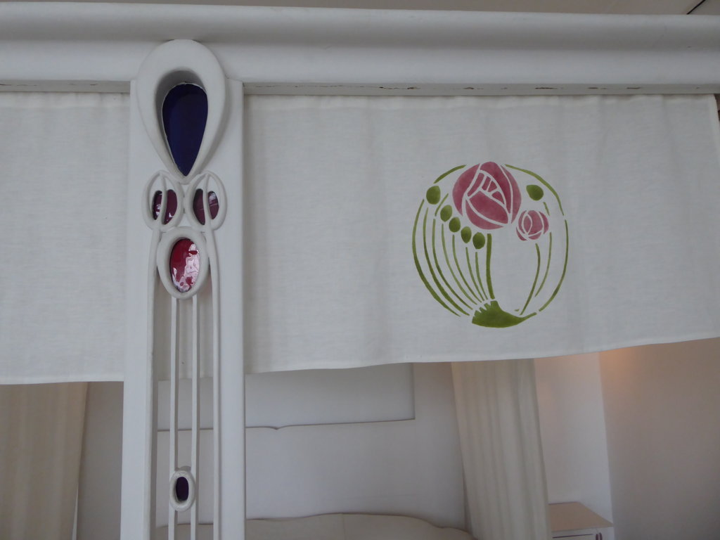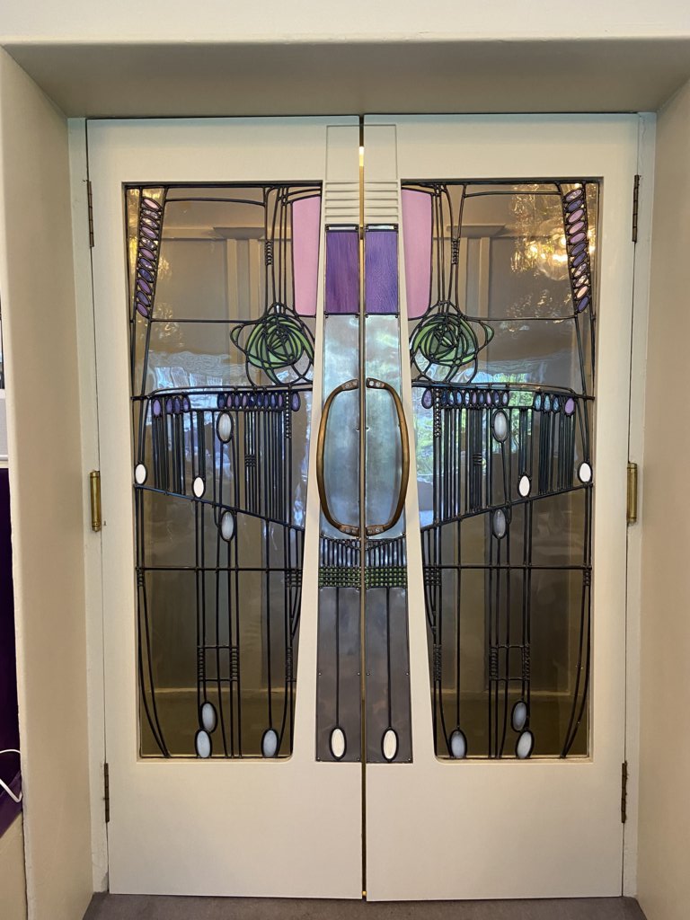 Attraversiamo il quartiere adiacente all’università, molto elegante, con bellissime abitazioni, bowindows dove vorresti sedere a leggere un libro sulle belle poltroncine illuminate dal sole tra le piante verdi, giardini delicatamente fioriti…. Arriviamo alla stazione della metropolitana (che a Glasgow ha solo due linee che corrono vicine, una in senso contrario all’altra ; il sistema di chiusura delle porte non è automatizzato nel senso che è l’autista che si affaccia dal finestrino e chiude le porte quando tutti sono saliti ) e corriamo nel Southside, il quartiere a sud del fiume Clyde, dove all’interno dell’Art Park nel 1989 è stata costruita la House for an Art Lover, seguendo il progetto originale di Mackintosh del 1901. L’edificio ha l’intento di stimolare l’interesse per l’arte, il design e l’architettura : vi si organizzano anche eventi pubblici o privati. Il corridoio monumentale è scuro, con nicchie che fiancheggiano le finestre per conversazioni private ; vediamo poi la Oval Room sala destinata al riposo delle signore (Mackintosh ritiene che chiacchiere, relax e concentrazione necessitino di spazi diversi per uomini – spazi scuri – e donne – spazi bianchi e pieni di luce ) : infatti la stanza è bianca, e tutto segue le sue linee ovali e morbide, con due nicchie ai lati di una enorme finestra illuminata dal sole ; arriviamo poi alla Music Room, una enorme sala destinata a feste, con enormi porte finestre convesse illuminate dal sole e una bellissima balconata dalla quale ammirare lo splendido giardino , che con i suoi elementi stilizzati vuole ricordare una radura tra gli alberi , con il pianoforte contenuto in un grande letto a baldacchino ; si finisce poi con la Dining Room di nuovo scura . Tutto molto bello, ma un po’ impersonale e “da cerimonia”, poco famigliare: gli spazi così dilatati tolgono (o sono in contraddizione) con l’ intimità e la semplicità (del tutto apparente) che è uno dei caratteri che amo di più in questo architetto …