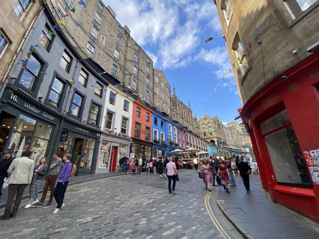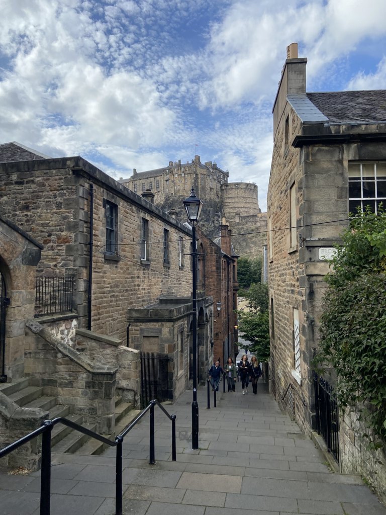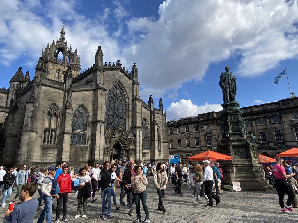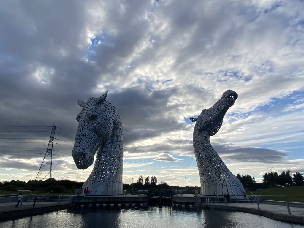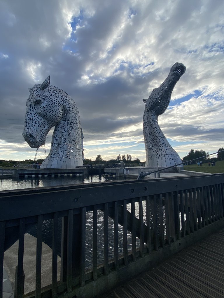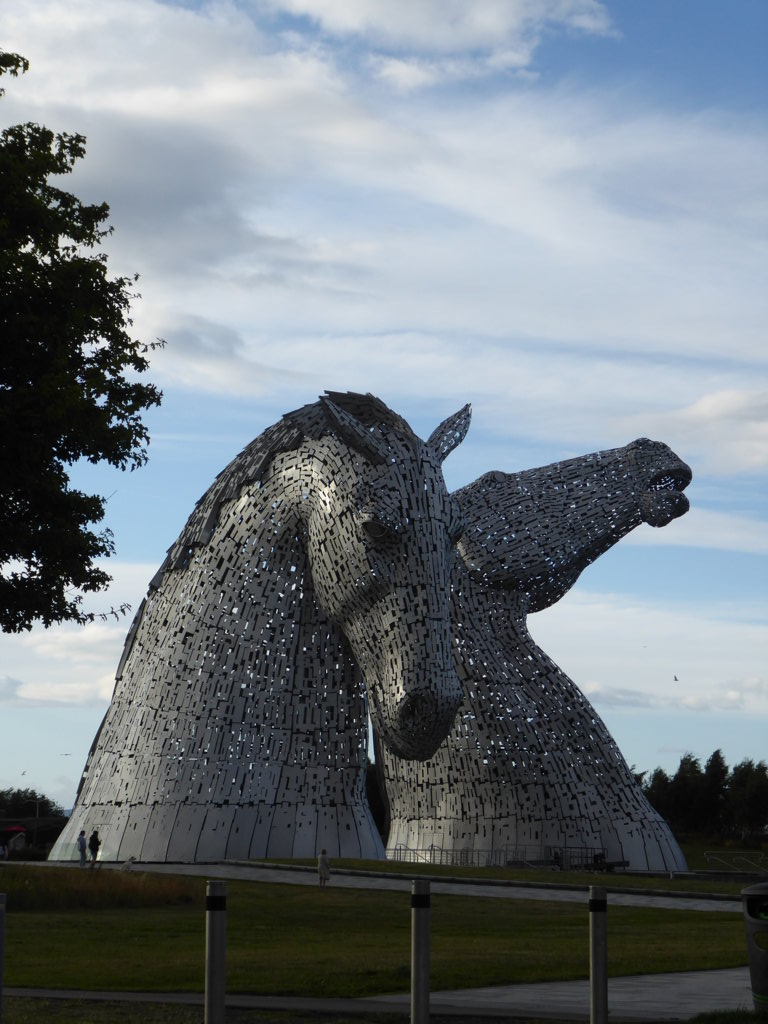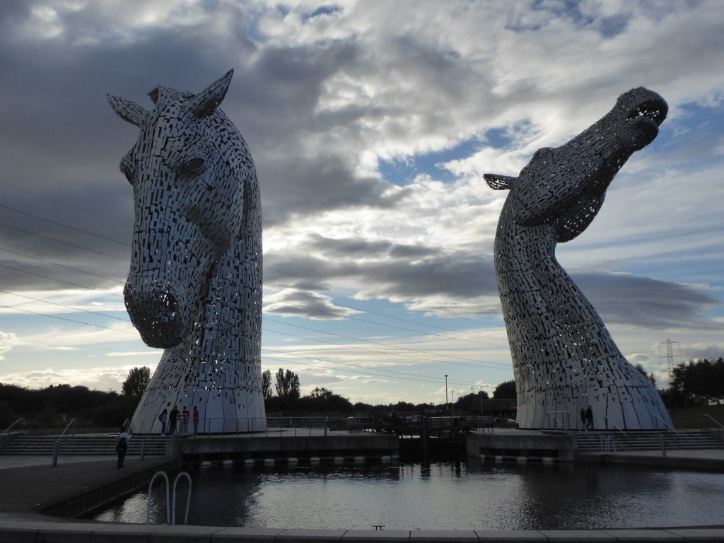 Ci dirigiamo verso Edimburgo e ci fermiamo circa a metà strada , a Falkirk , per ammirare i Kelpies, enormi sculture di Andy Scott del 2014 che si innalzano sul verde del parco The Helix . Raffigurano due teste di cavallo che escono dall’acqua e si innalzano sulla pianura imbizzarrite. Sono alte oltre 30 metri e pesano 600 tonnellate. La loro fama deriva da una leggenda popolare celtica : rappresentano degli spiriti maligni che infestano i laghi e i fiumi della Scozia. Lo scopo principale di questi demoni acquatici è quello di ingannare e “sedurre” poveri e ignari viandanti per condurli verso il loro terribile destino, il fondo del lago. I cavalli sono i più cattivi: si racconta infatti che se gli spiriti assumono le sembianze di cavallo, una volta saliti sulla loro groppa, sia impossibile scendere ; la vittima resta incollata alla schiena del Kelpie senza avere via di fuga, viene inabissata nelle acque del lago, dove poi il malvagio cavallo la divorerà. La leggenda è abbastanza terribile, ma lo spettacolo che regalano queste due sculture è davvero impressionante : le due enormi teste ti osservano con fierezza e aria minacciosa. Un po’ di ansietta e di emozione, ai loro piedi, sono garantite.