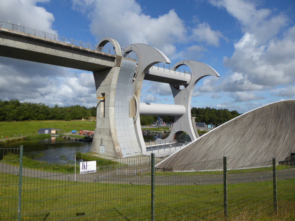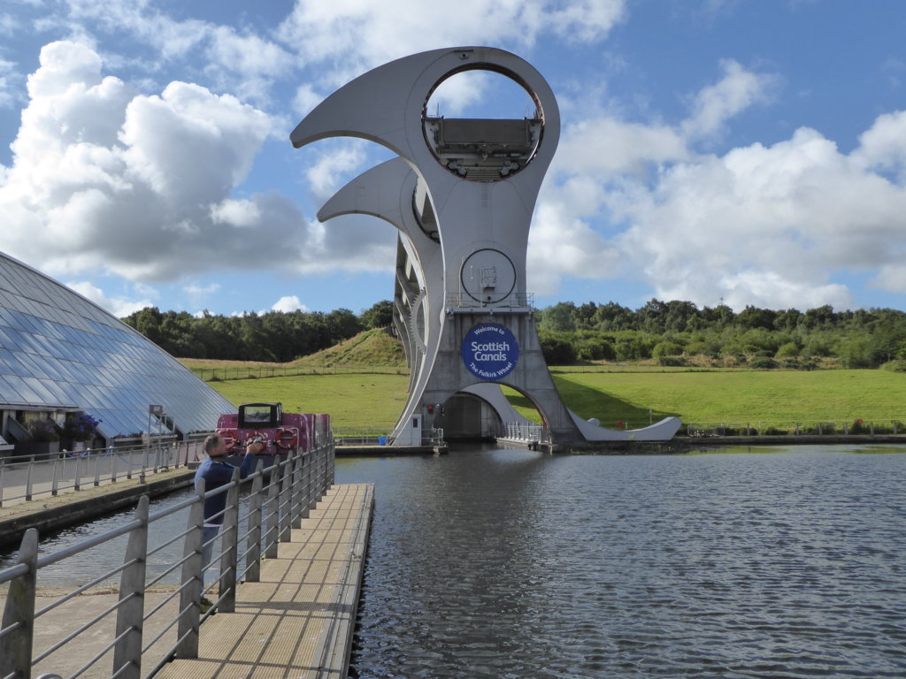 Venerdì 5 agosto 2022 . Partiamo presto per visitare rapidamente la Falkirk Wheel, da cui il nome del campeggio di mr. Hoggy. Ambizioso ed innovativo progetto inaugurato nel 2002 per collegare i due canali di Falkirk (Union e Forth Clyde) con un’ascensore rotante per barche : consiste in due enormi artigli che agganciano un tratto di canale semicilindrico contenente acqua ed imbarcazione galleggiante e, ruotando, lo sollevano o abbassano portandolo al livello del canale sovra/sottostante, per un dislivello di 35 metri. Il meccanismo funziona con un ridotto consumo energetico (cioè l’energia necessaria per far bollire l’acqua per otto volte in un bollitore elettrico), in quanto la spinta per il movimento di rotazione deriva in buona parte dal contrappeso opposto a quello della barca (sull’artiglio opposto viene caricata una equivalente quantità di acqua). A questa opera ingegneristica si abbinano varie attività turistiche, comprese le gite in barca per provare il giro dell’ascensore.
