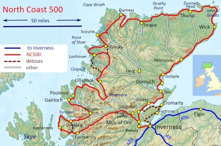 Dal sito di Visit Scotland : Nulla è paragonabile alla libertà che si prova su una grande strada aperta. Strade secondarie senza fine, ampi tracciati tortuosi e percorsi misteriosi attraverso alcuni dei più splendidi paesaggi costieri della Scozia: queste sono solo alcune delle attrattive che potete aspettarvi dalla North Coast 500, la versione scozzese della Route 66. La North Coast 500 è molto più di una semplice strada: è l’ultima sfida di un ciclista, un sogno per gli escursionisti in collina, un parco giochi per kayakisti, un paradiso per i nuotatori selvaggi; è un’abbondanza di ampi spazi aperti, sede di alcune delle migliori spiagge della Scozia e uno dei posti migliori nel Regno Unito per gli osservatori del cielo notturno. E il modo migliore per esplorare il paesaggio meravigliosamente aspro delle North Highlands è rallentare, impostare la base e fuggire all’aria aperta.Allacciate le cinture e partite per il viaggio della vostra vita.